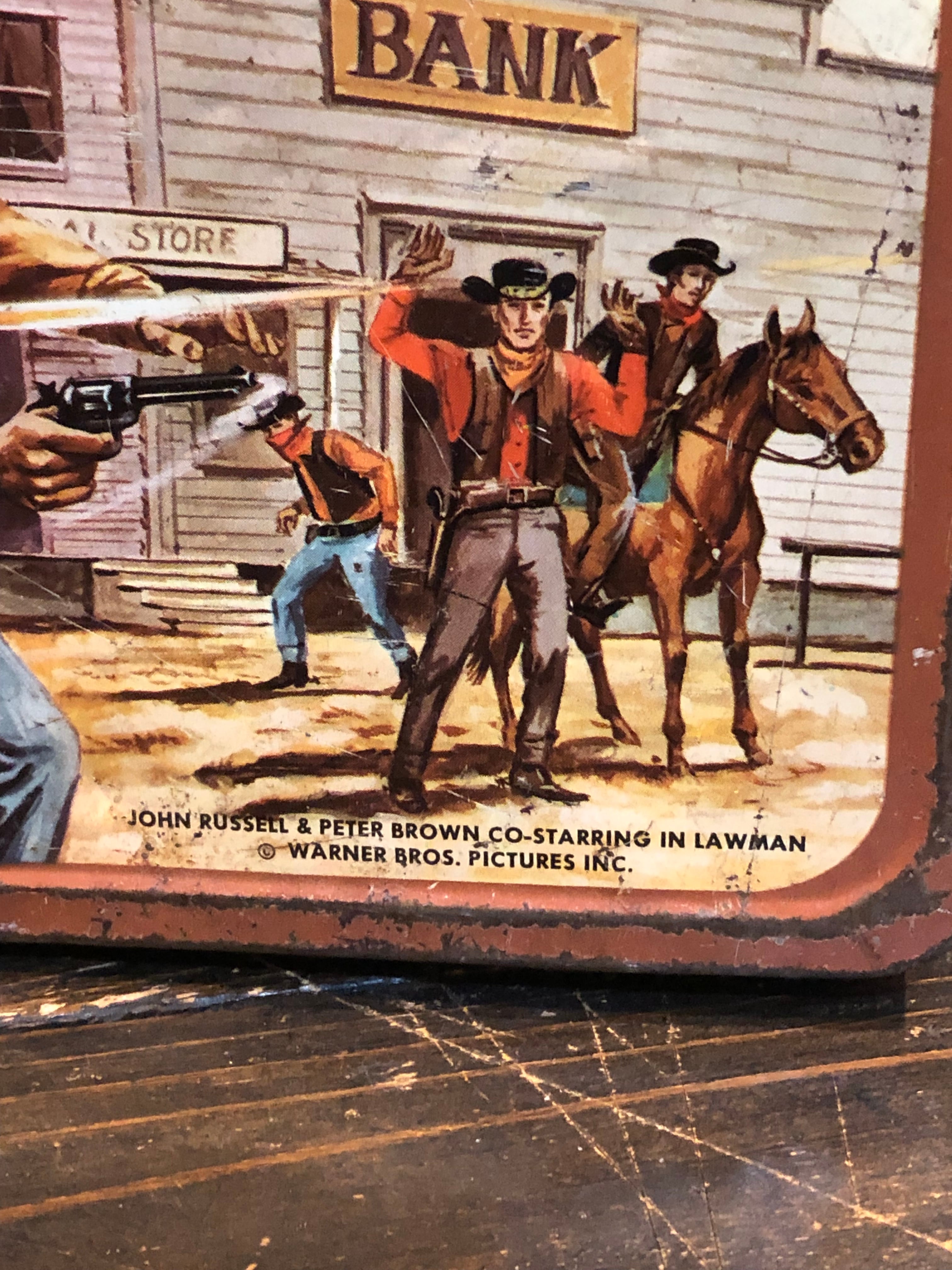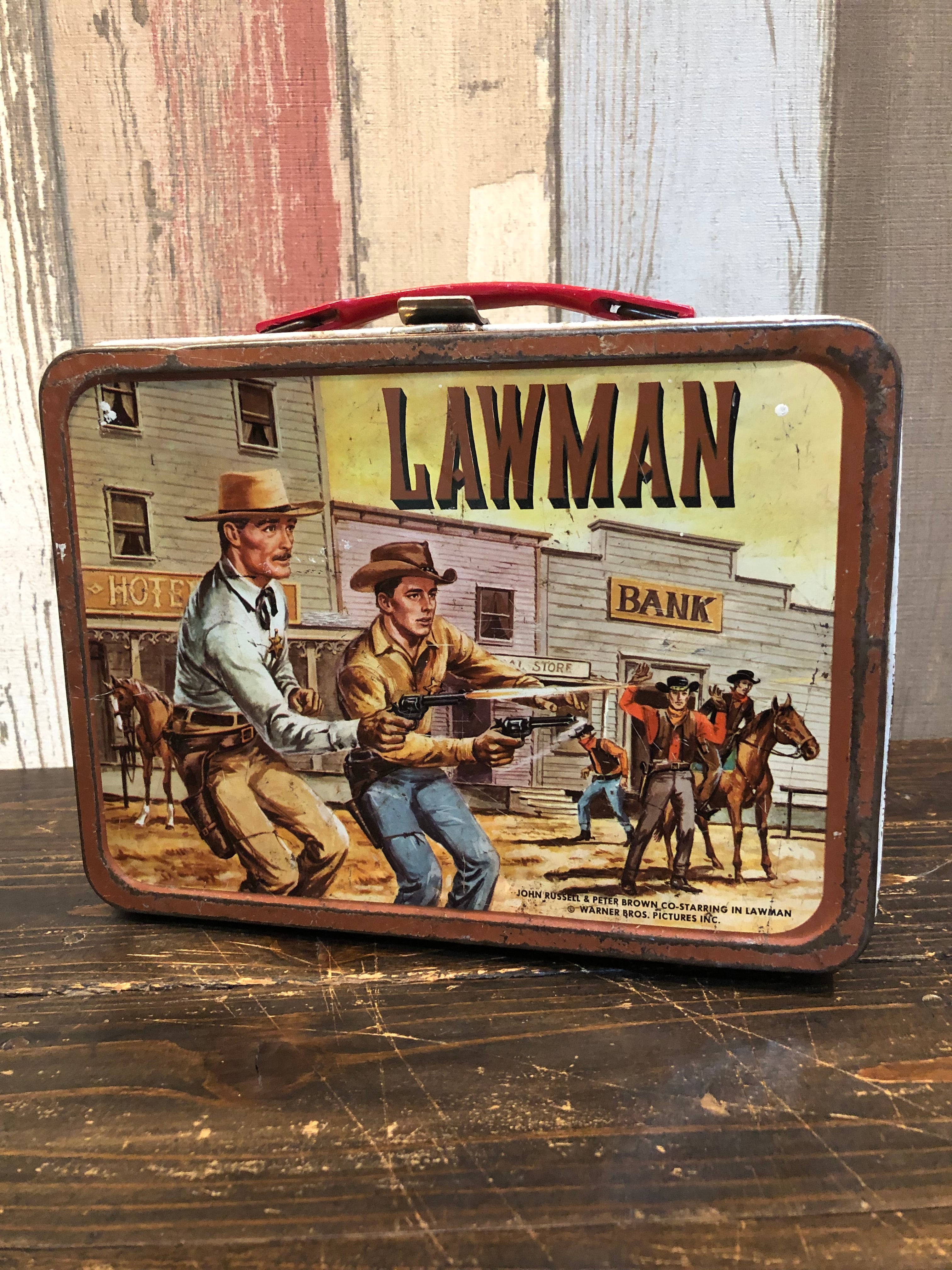 1958~1962年アメリカのTVシリーズ、LAWMANのランチボックスです。飾るだけで良い雰囲気を出しますね。カセットテープなんかを入れておくのに良いサイズです。多数、凹みや傷などありますが、ホントに良い雰囲気ですよ。入手困難なアイテムですので、気になる方は是非!