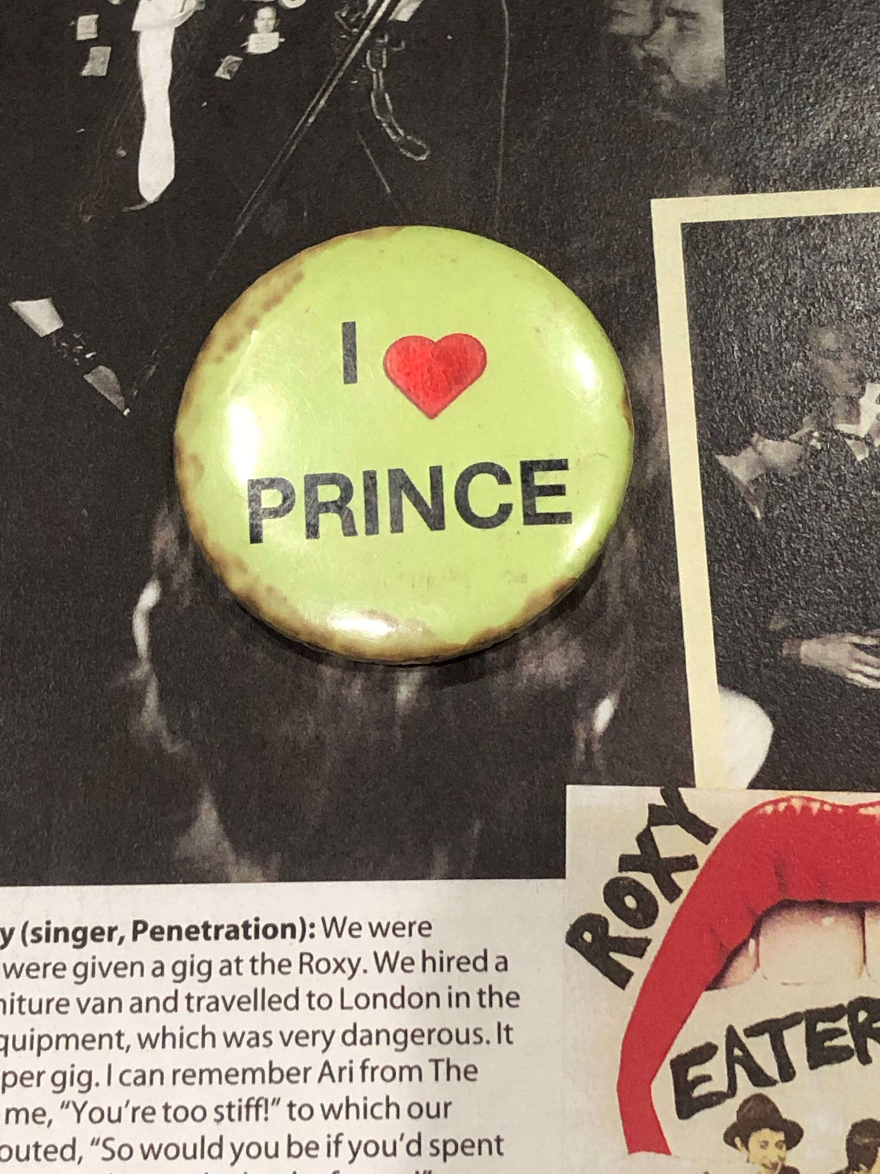 I LOVE PRINCEバッジです。カラーリングが良いですね。バッジのカラー・雰囲気からすると、パープルレインのプリンスなのかなと思います。大きめでアクセントとしても良いです。なかなか無いので、お好きな方は是非!
