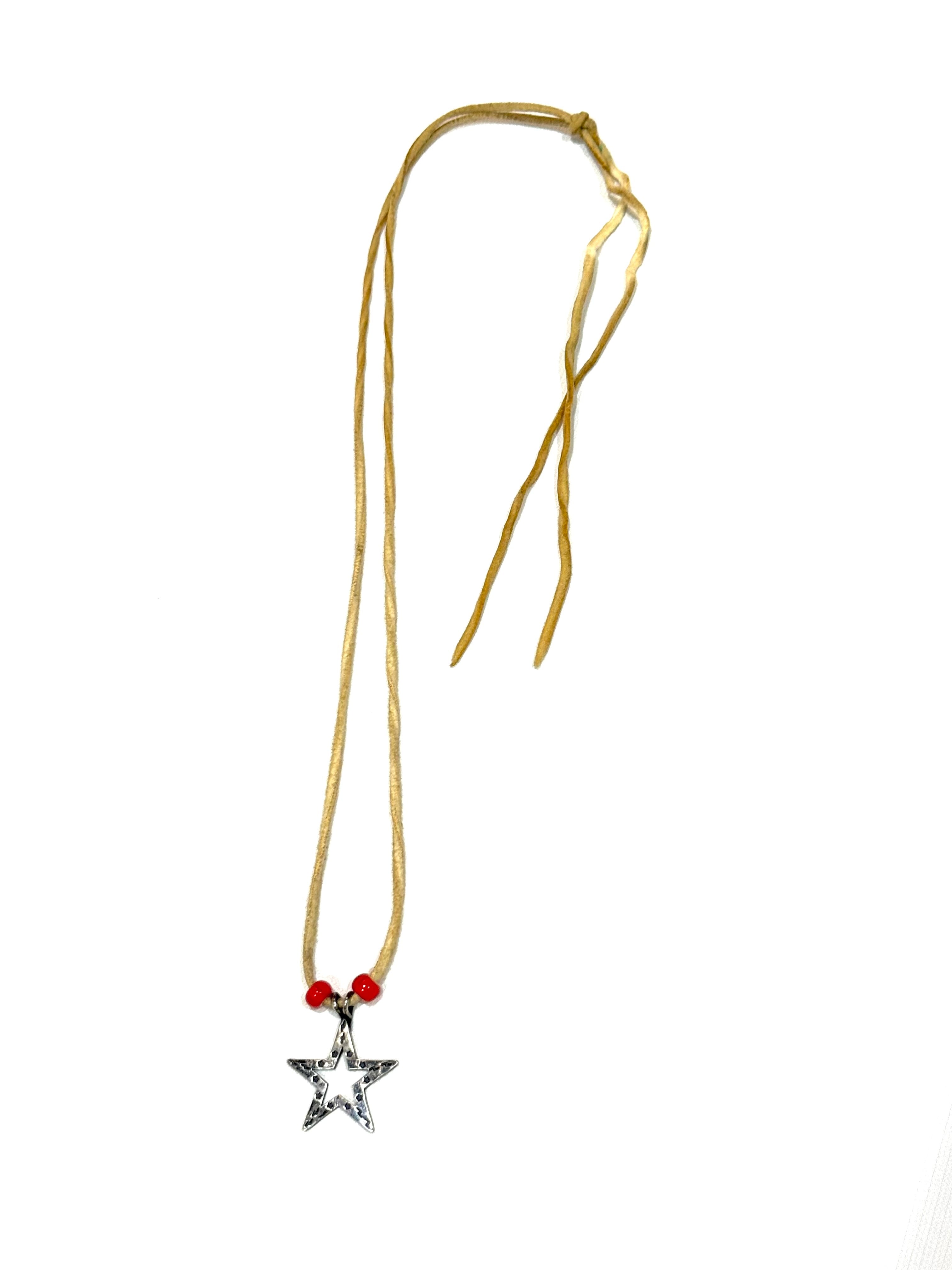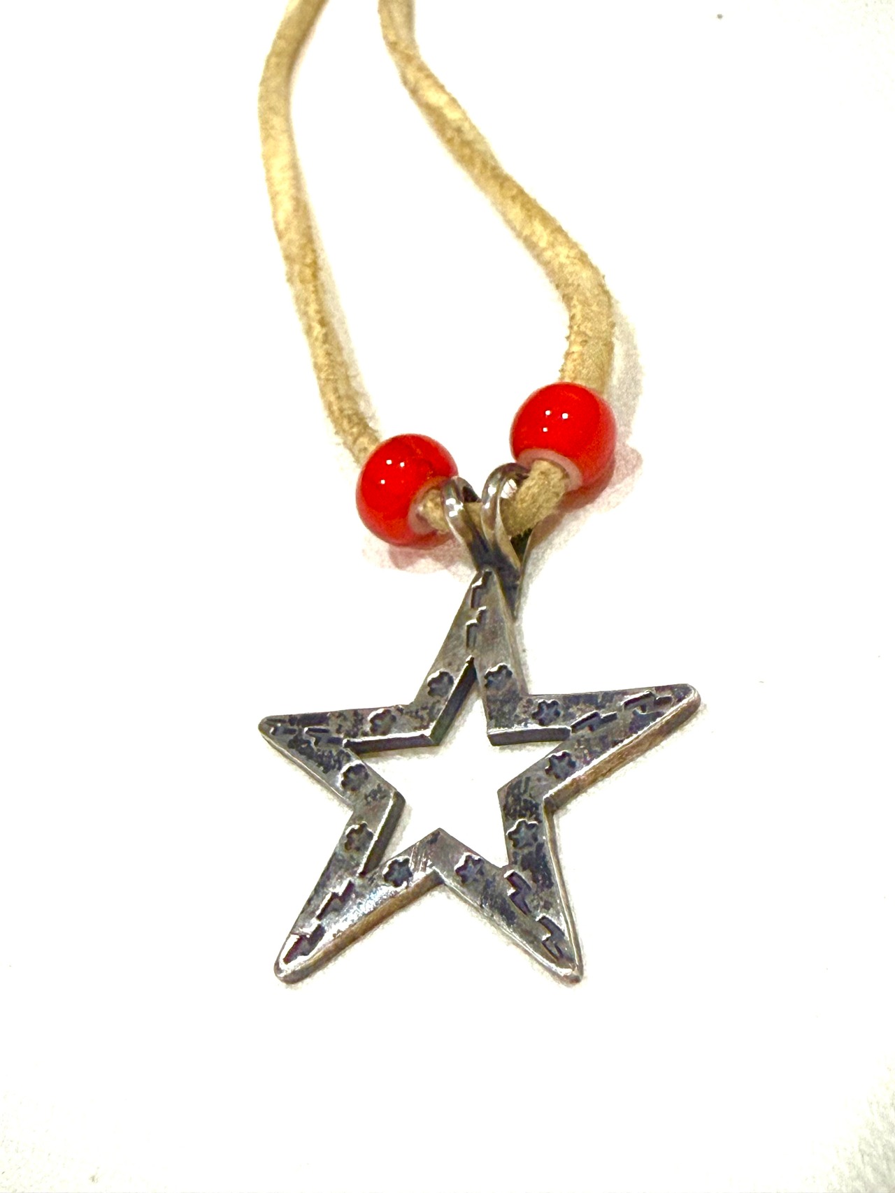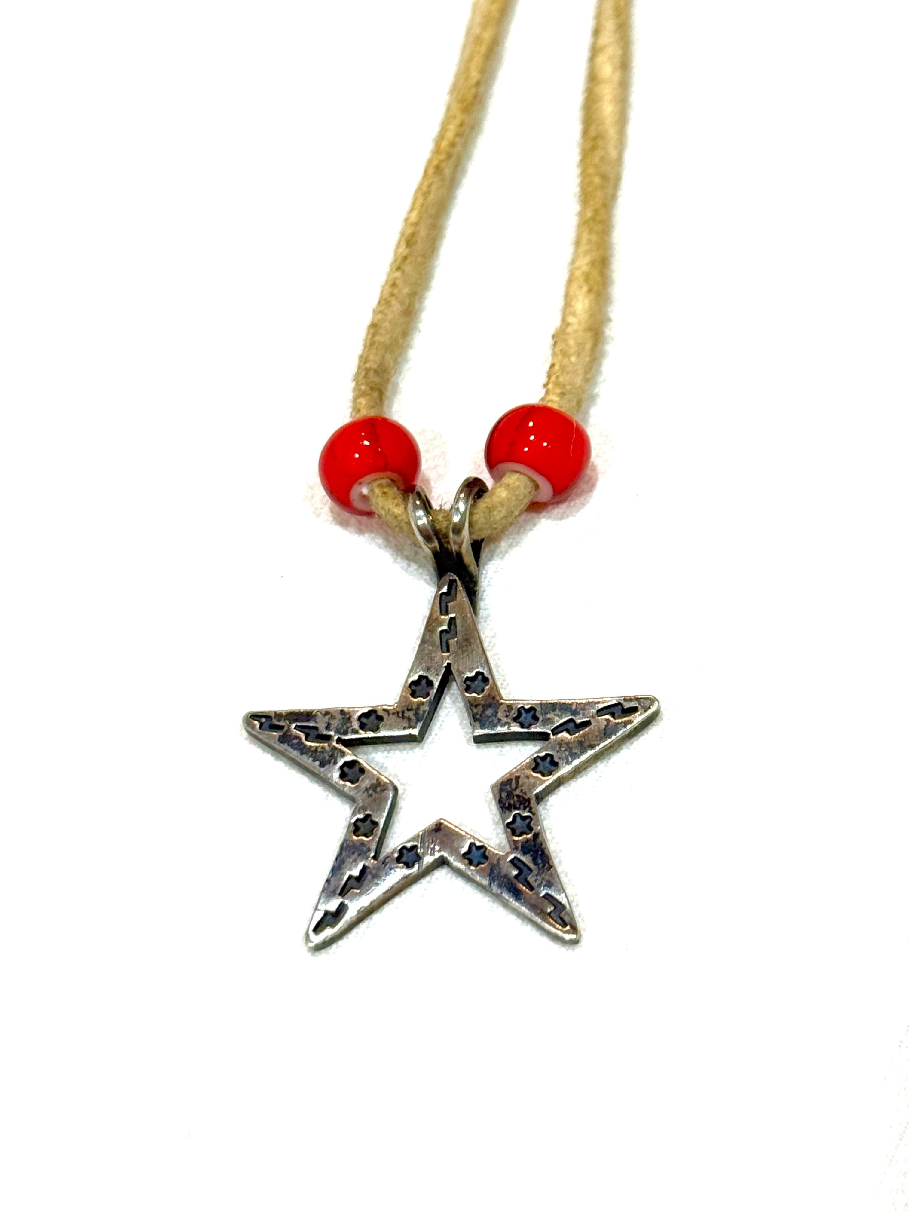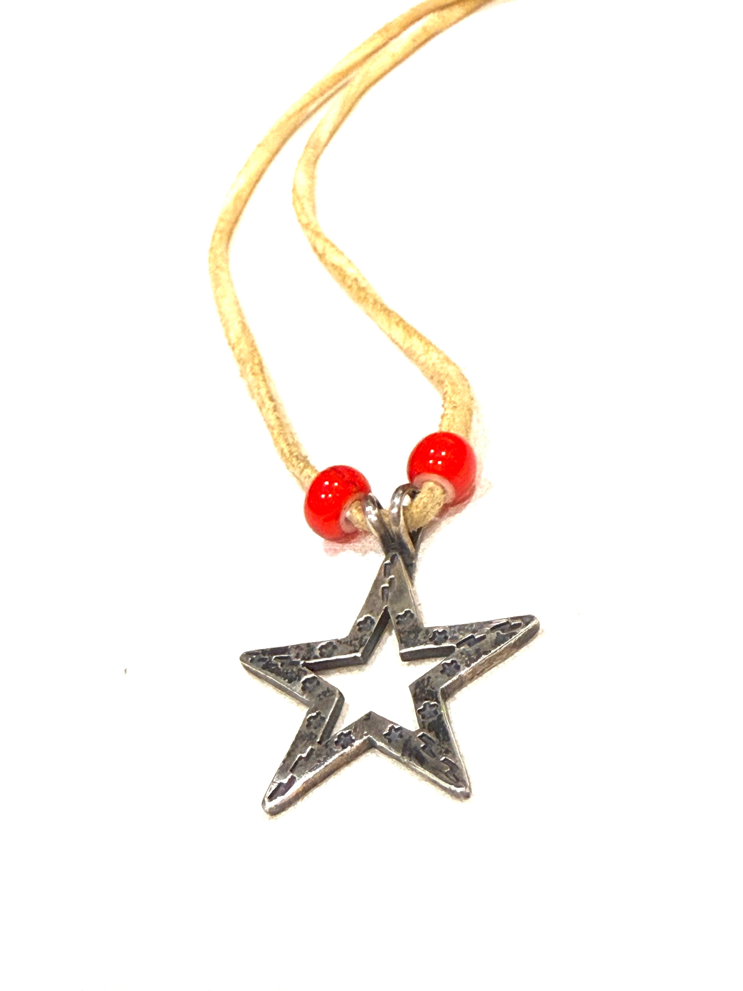ナバホ、インディアンジュエリー、スターペンダントです。裏にSTERLINGの刻印があります。シンプルなデザインで、スタイルを選ばずに使用できるかと思います。年季が入っていますが、Whiteのレザーの紐もなかなか良いです。おススメです。