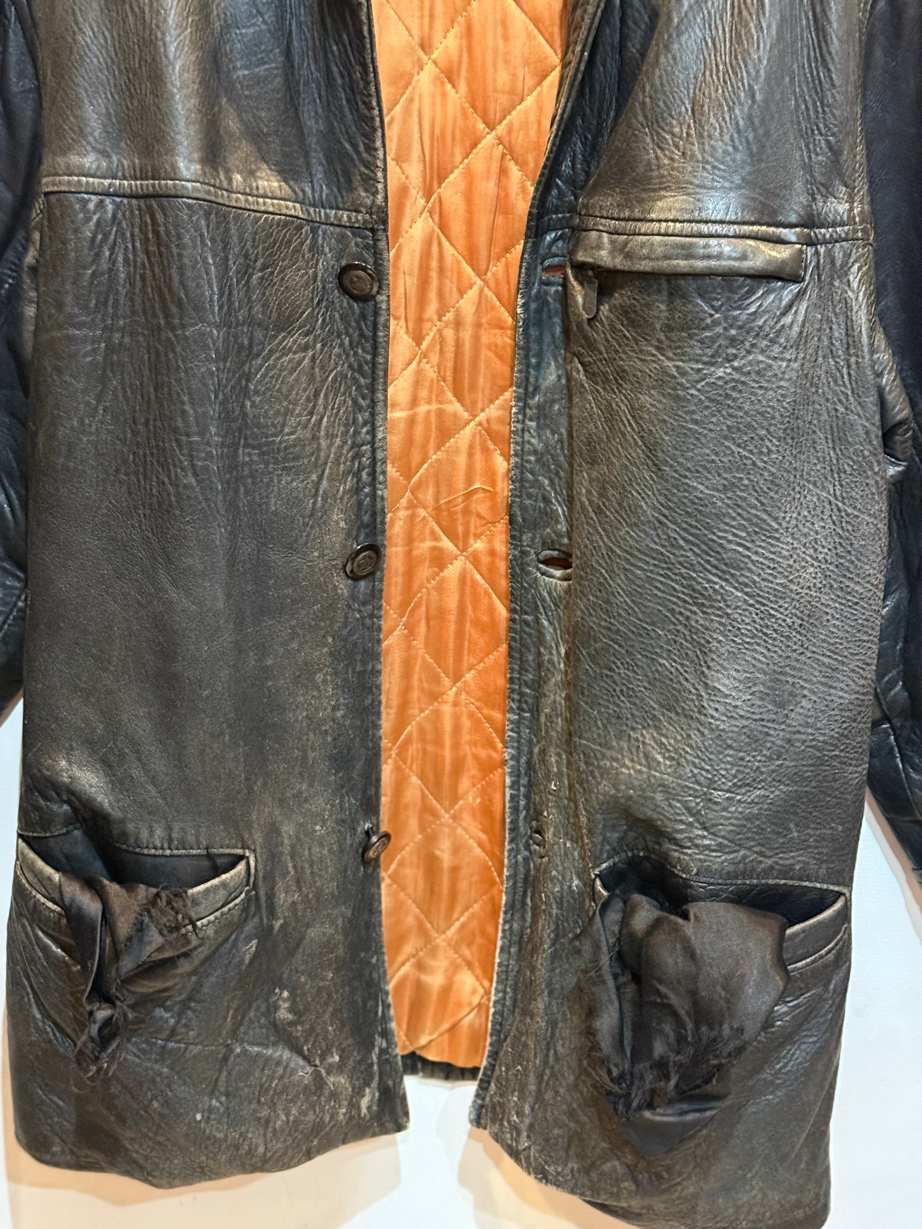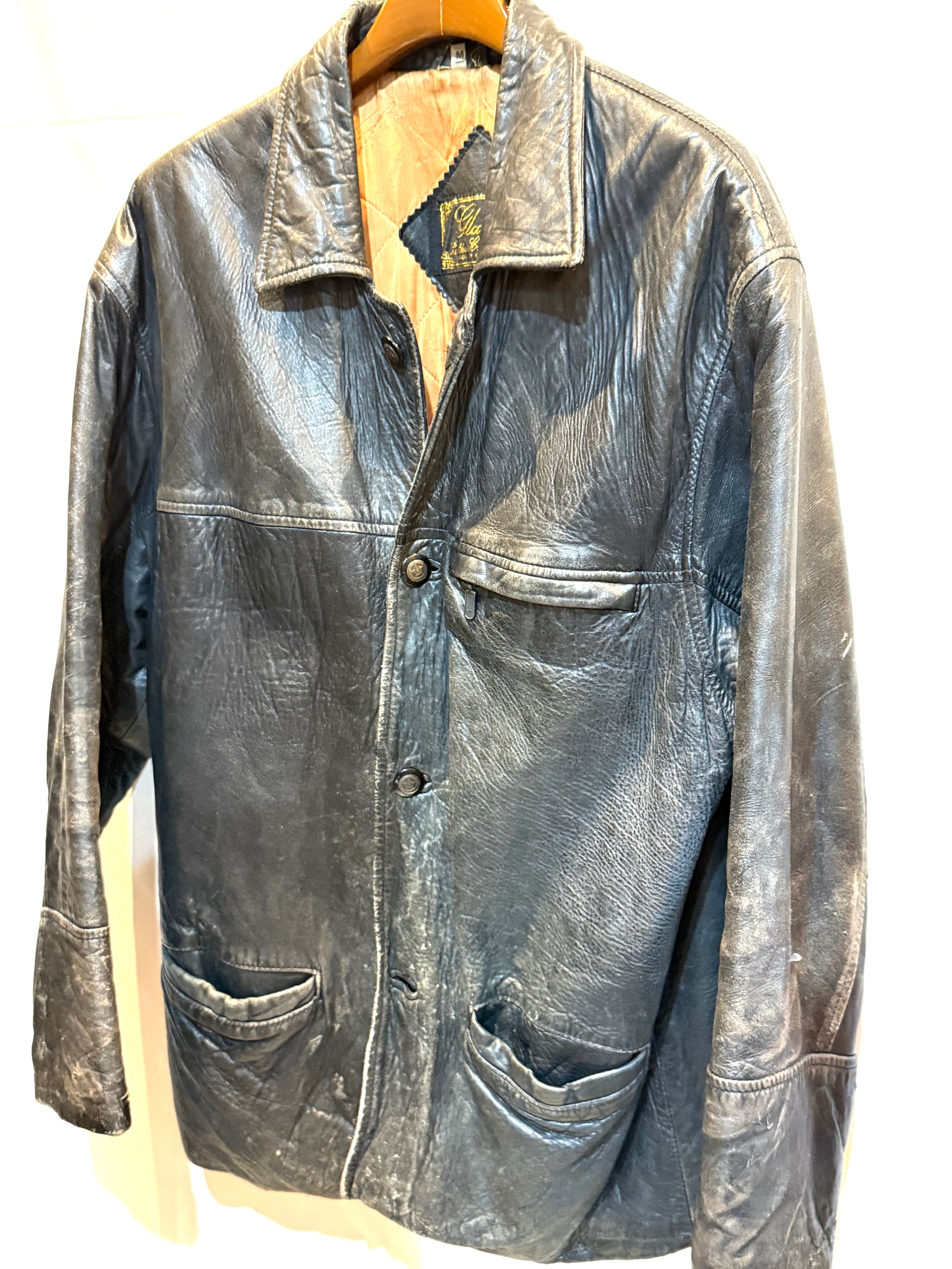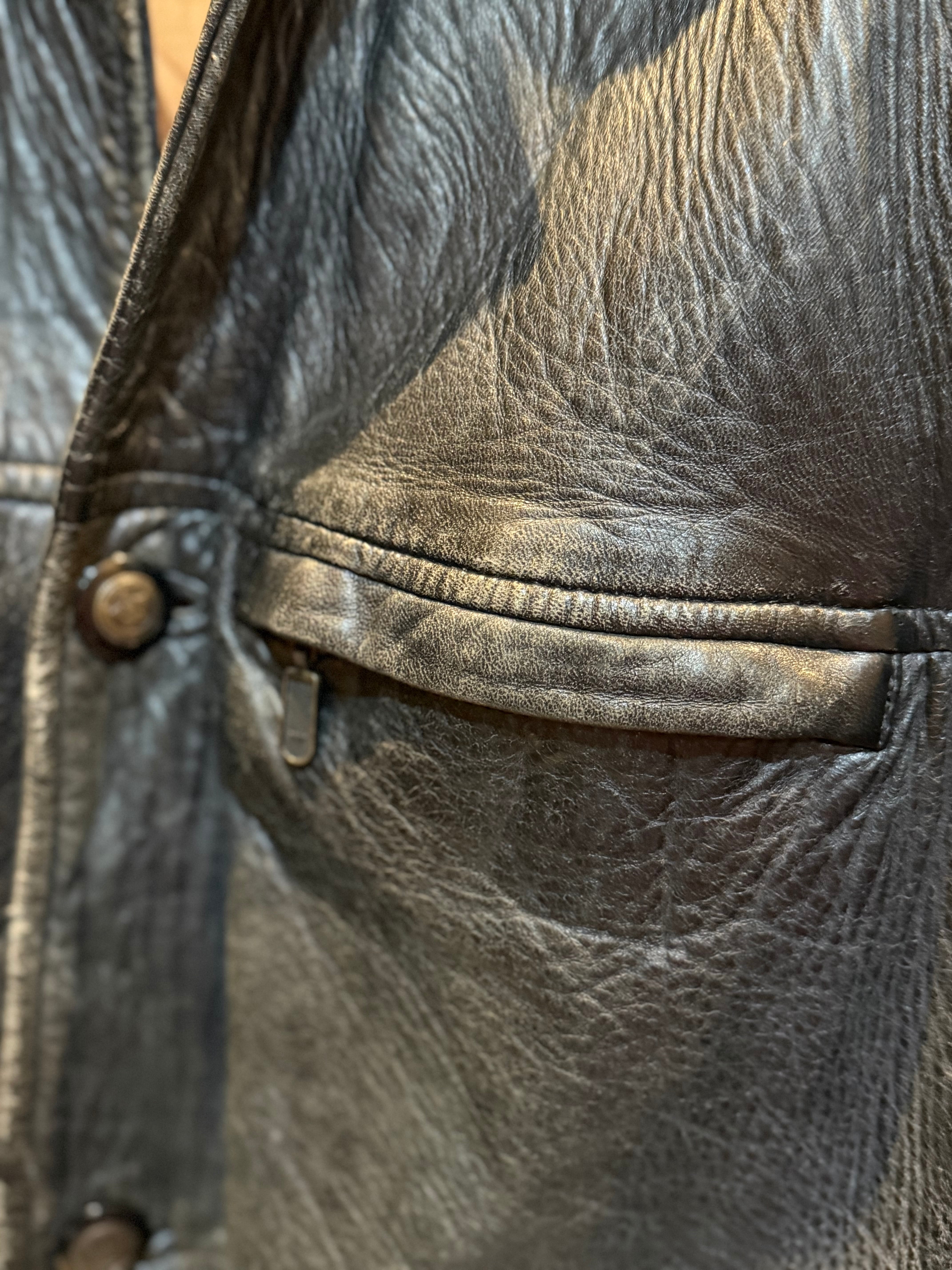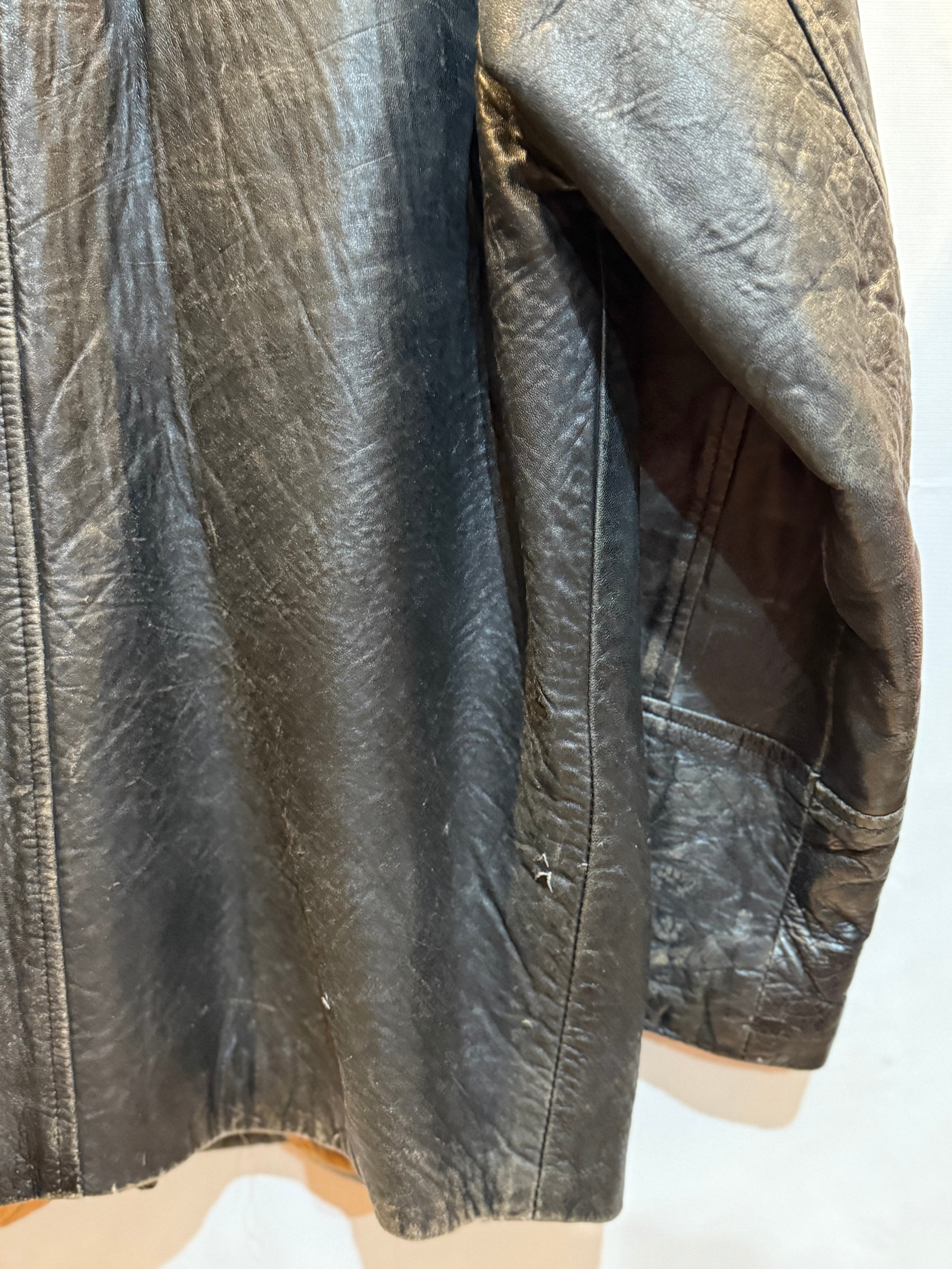 70年代のイングランド製レザージャケットです。ハーフコートのような感じです。昔、ブルーハーツがTVでリンダリンダを初めて歌った時に、甲本ヒロトさんが着用していたジャケットと雰囲気似てます。(あのジャケットはスナップボタンですが) 柔らかい革で、擦れや傷など多数ありますが、致命的なダメージは無く、雰囲気は最高です。イングランド製というのが気分上がります。この雰囲気を出すのに何年かかるのかというくらい良いです。気になる方は是非!