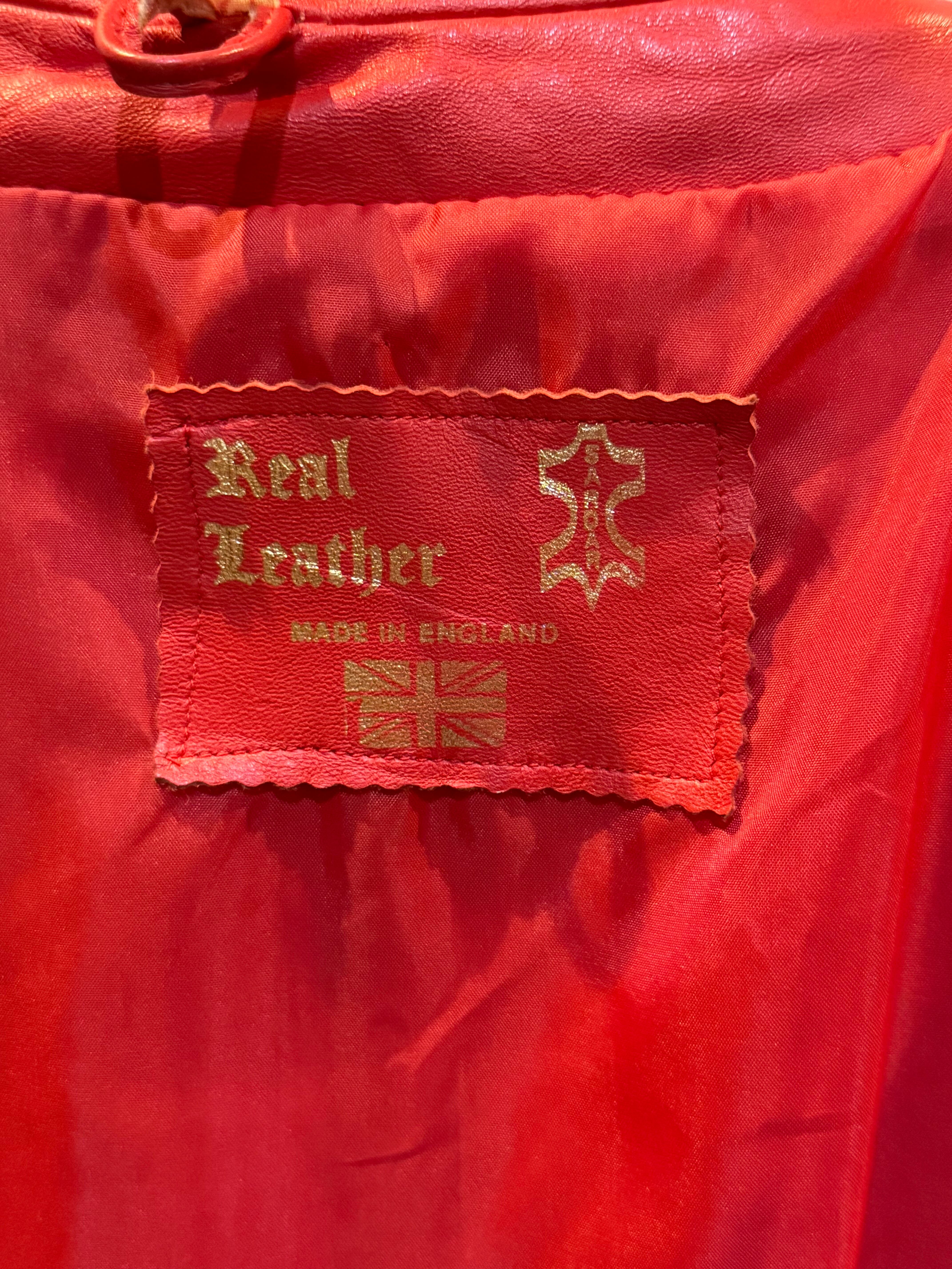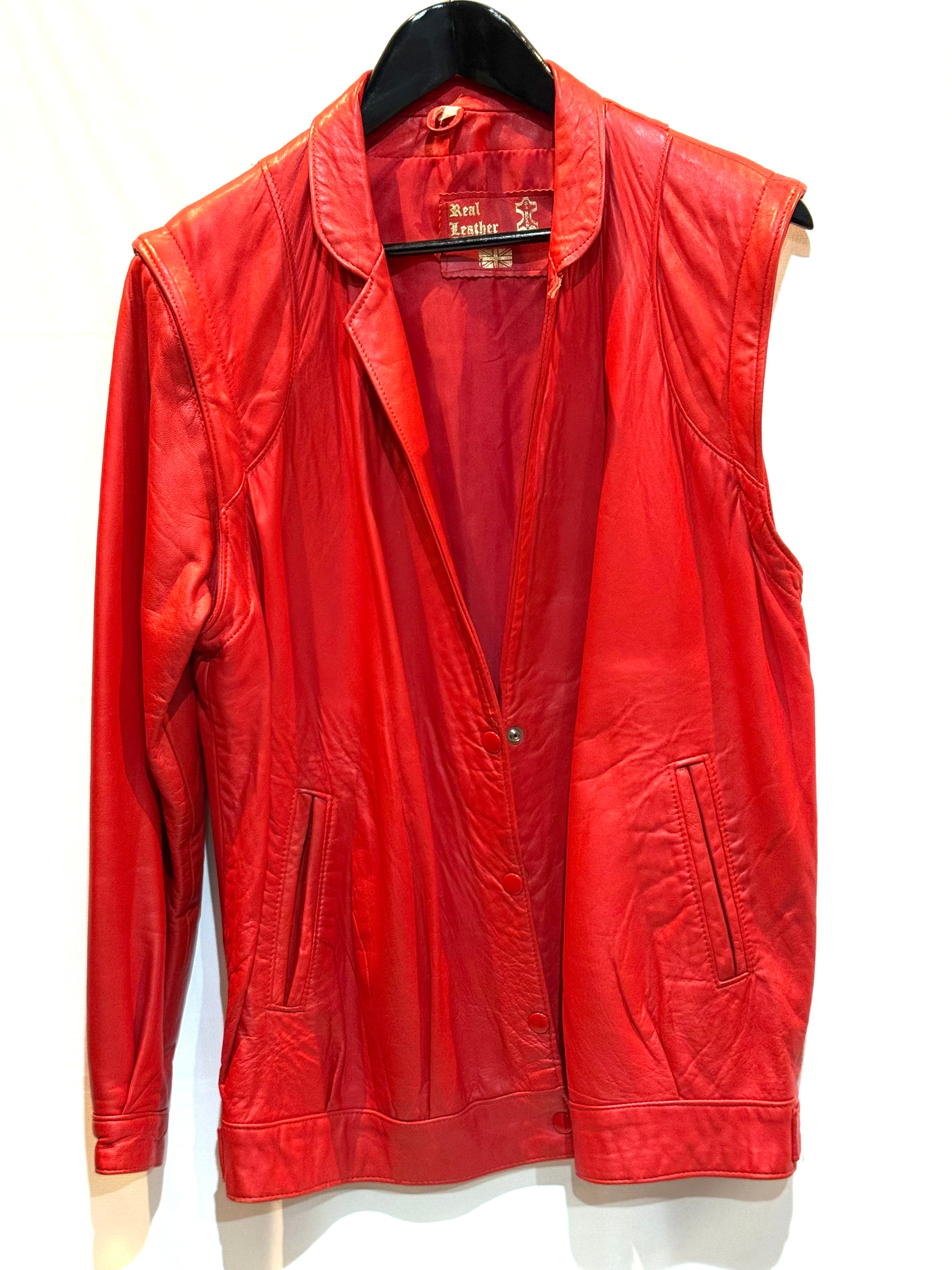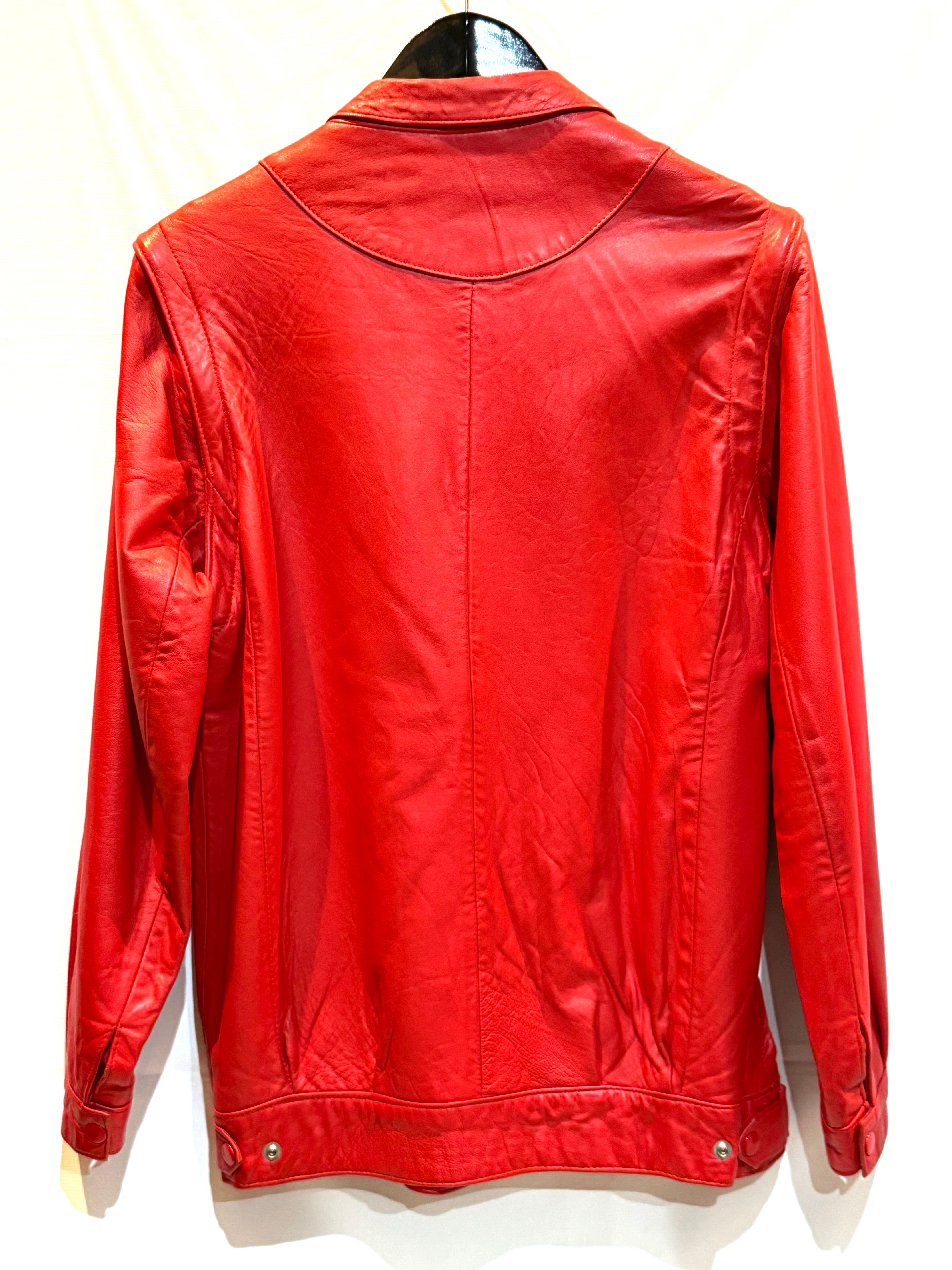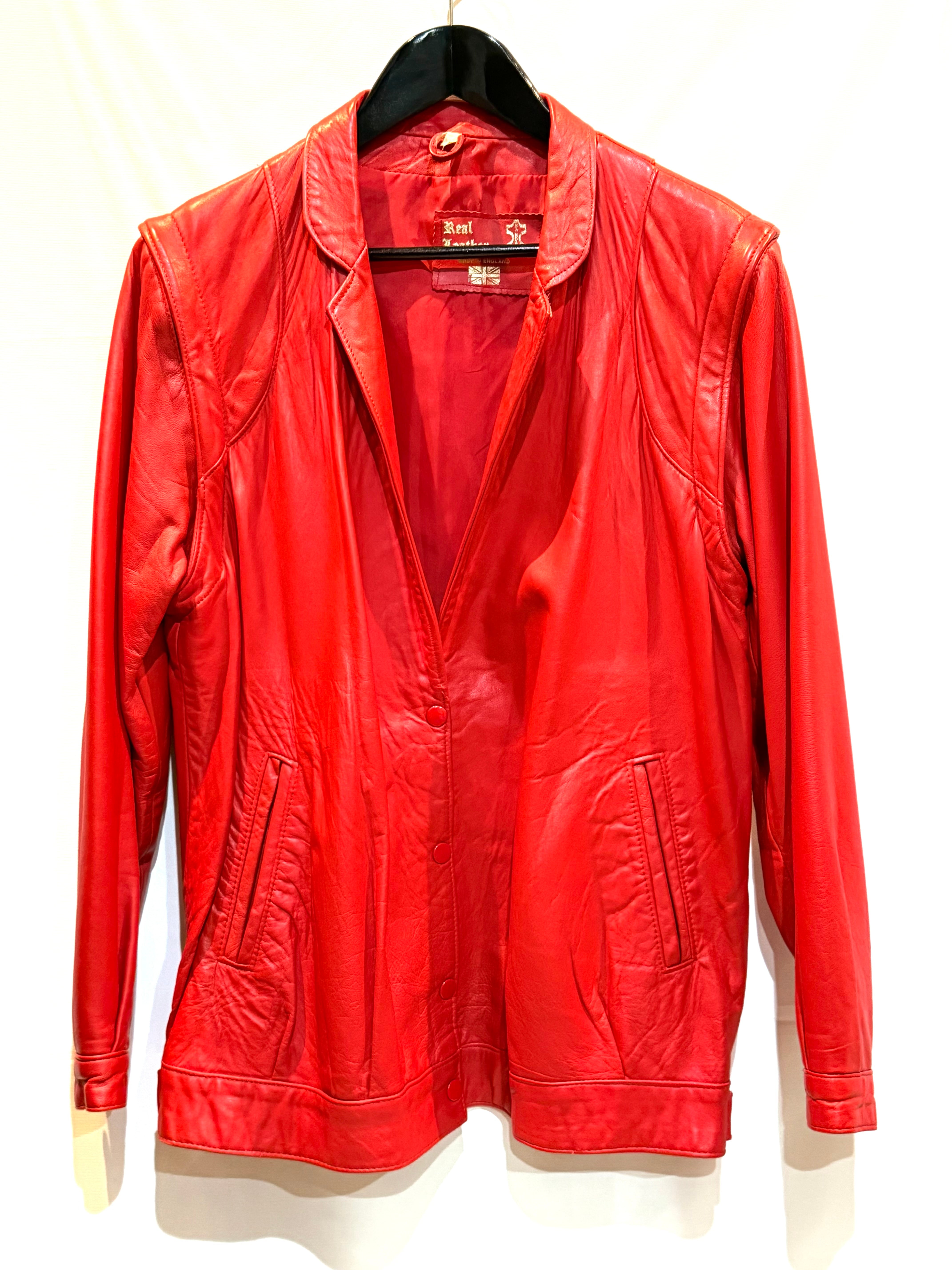 イングランド製、レッドレザージャケットになります。80年代のものだと思いますが、袖が取り外し可能で、レザーベストとしても着用できます。軽く柔らかいレザー(シープスキンでしょうか)で、着やすいです。コンディションも申し分ありません。フロントのスナップボタンと、細めの襟のバランスが時代を感じます。なかなか出会えないイングランド製レッドレザー、是非ご検討ください。