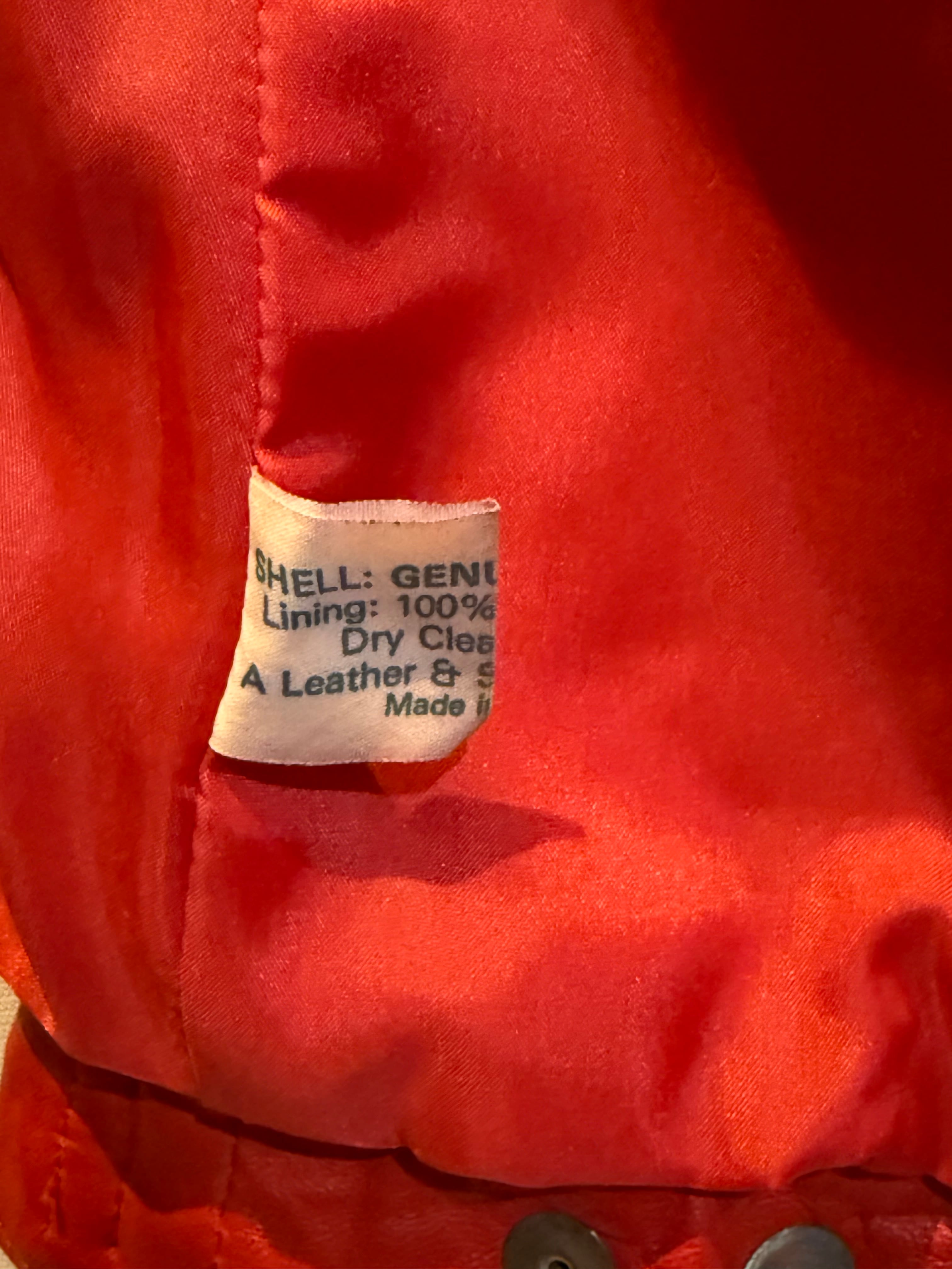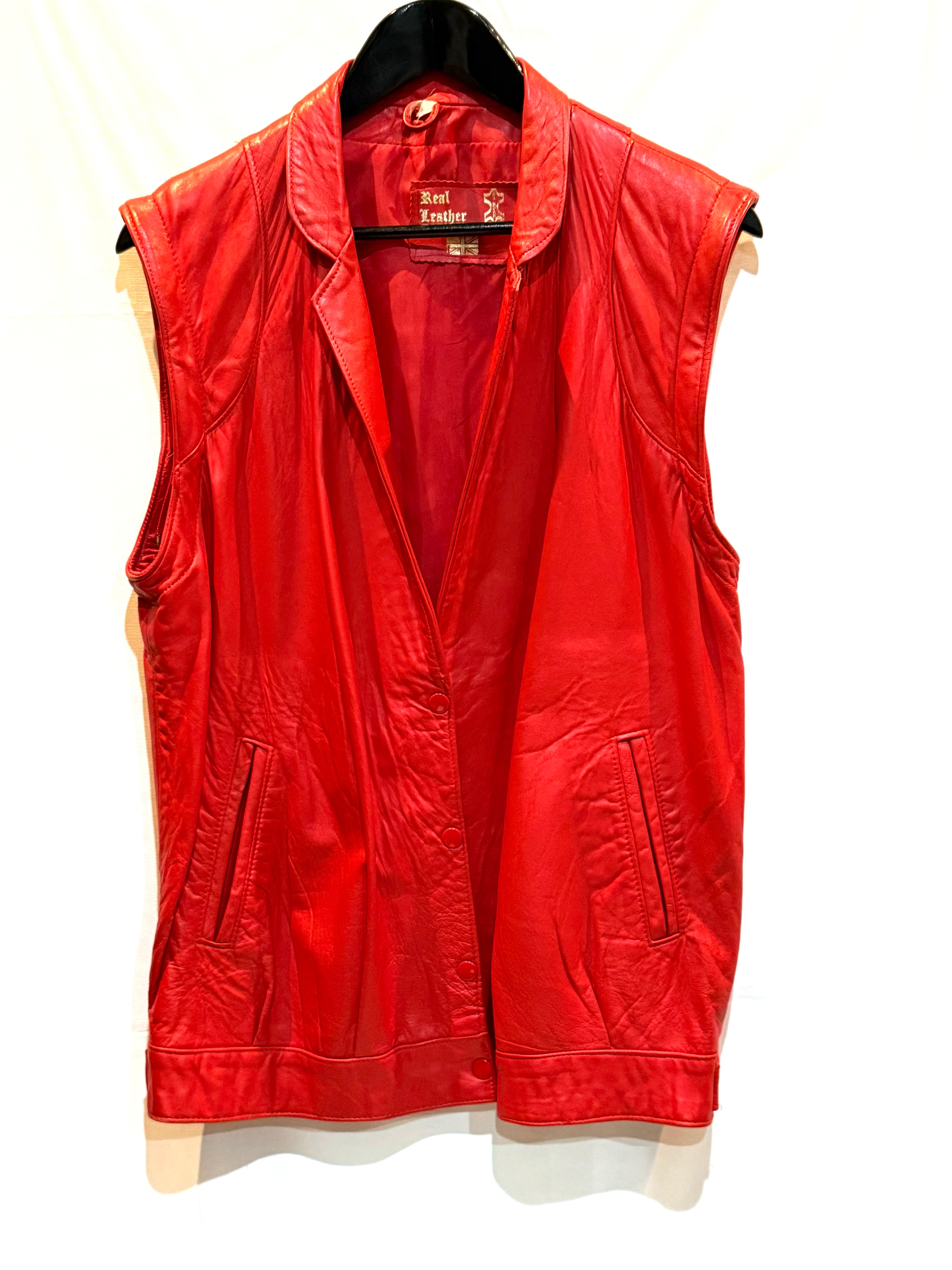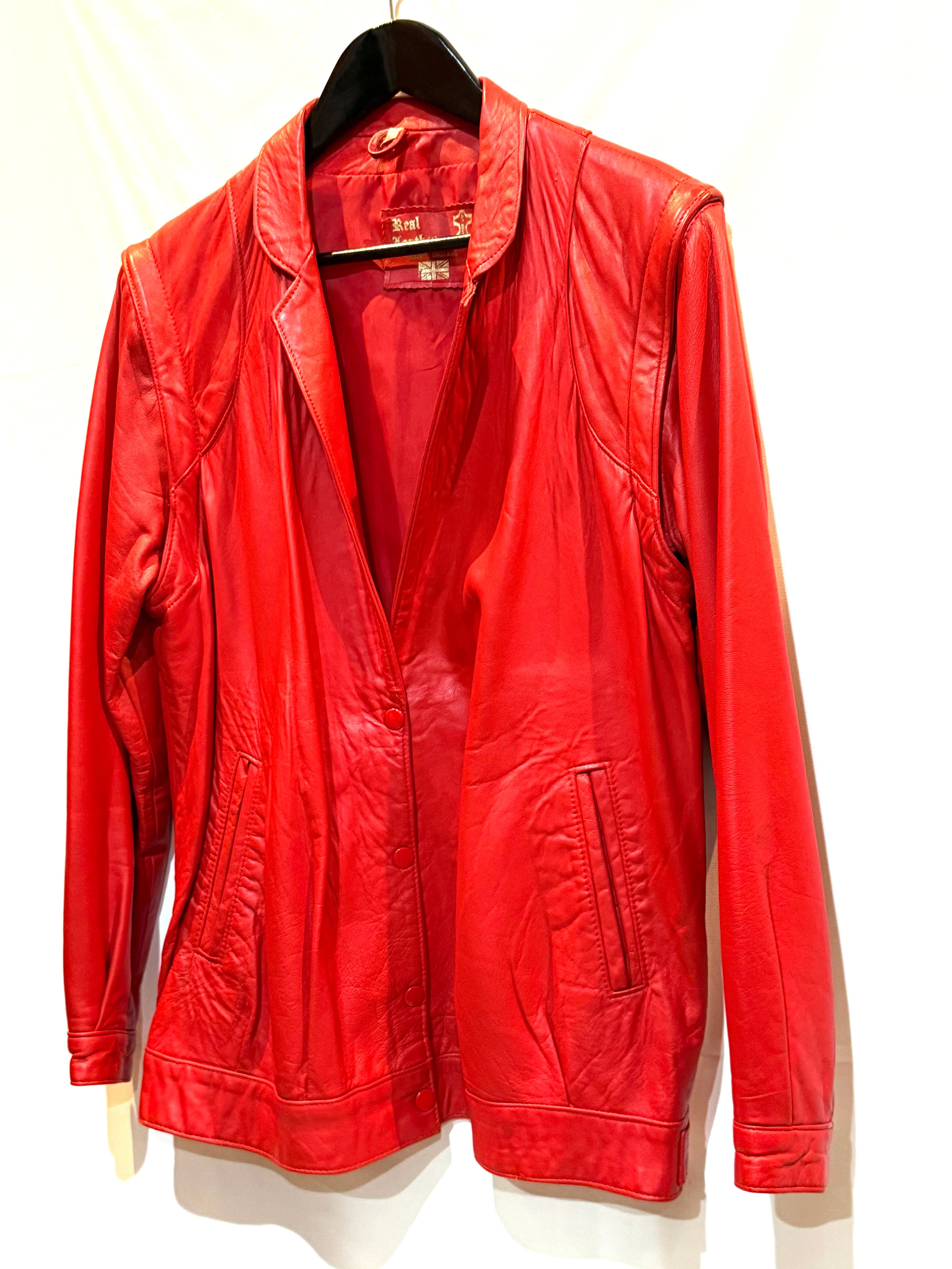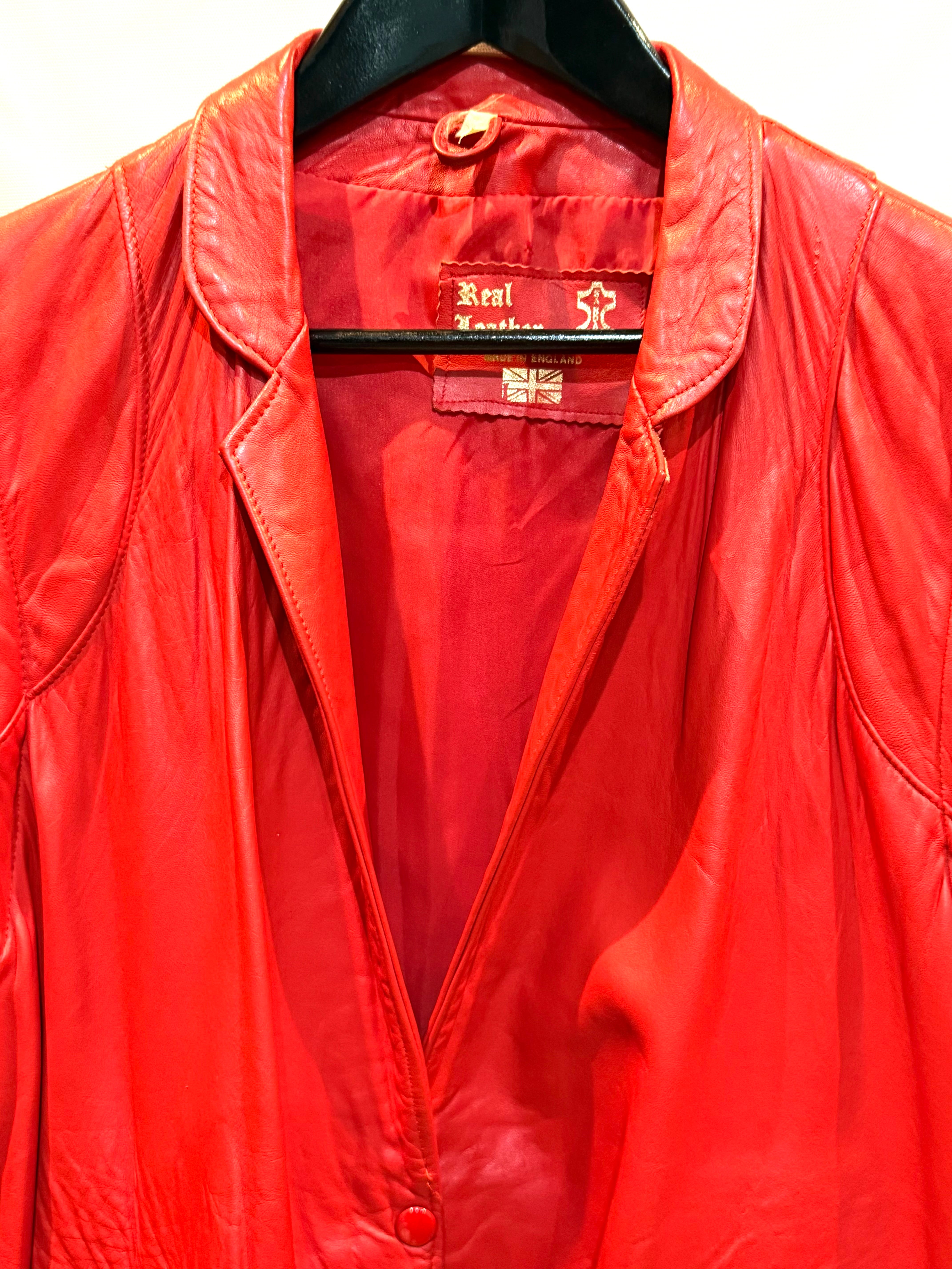 イングランド製、レッドレザージャケットになります。80年代のものだと思いますが、袖が取り外し可能で、レザーベストとしても着用できます。軽く柔らかいレザー(シープスキンでしょうか)で、着やすいです。コンディションも申し分ありません。フロントのスナップボタンと、細めの襟のバランスが時代を感じます。なかなか出会えないイングランド製レッドレザー、是非ご検討ください。