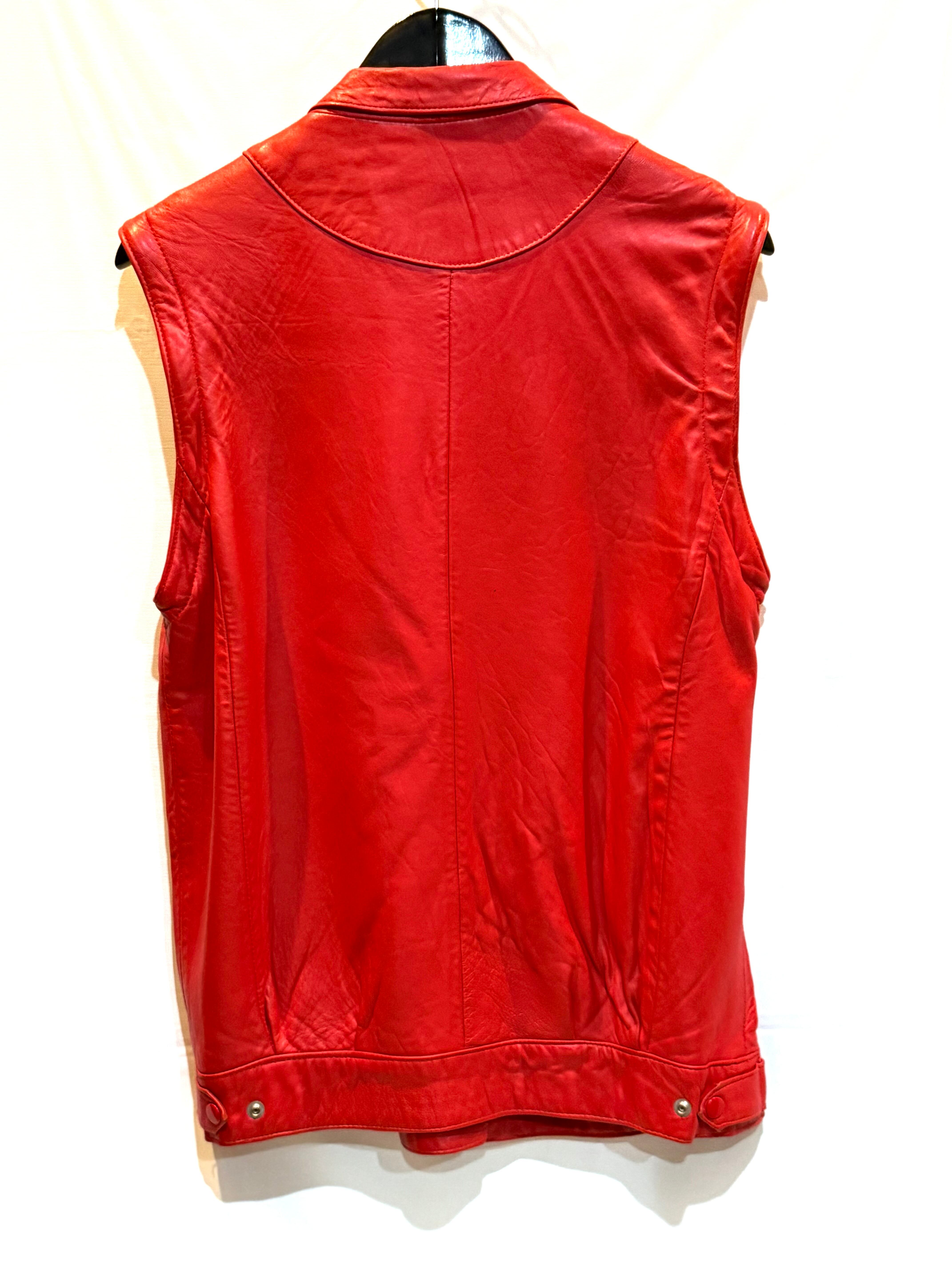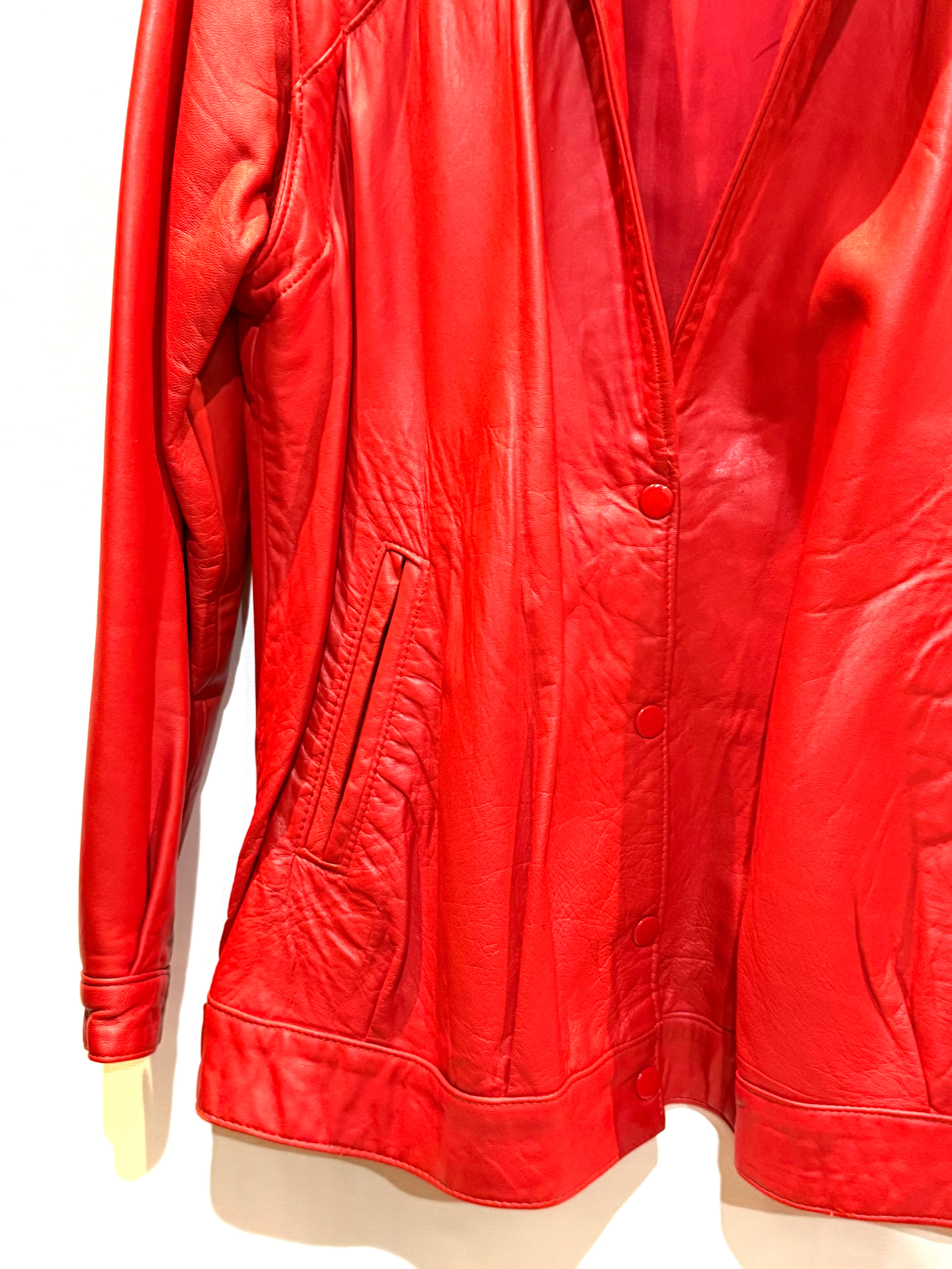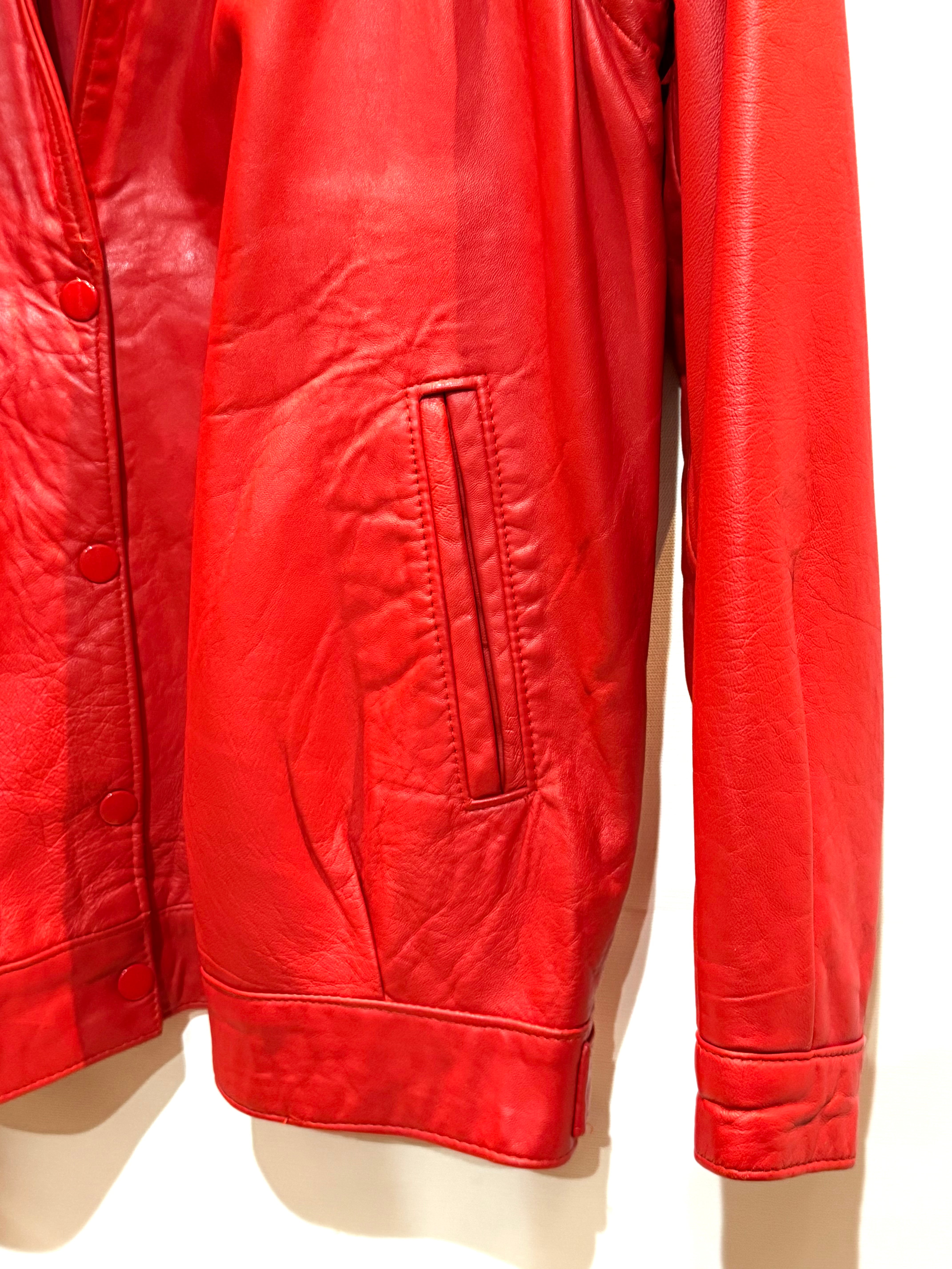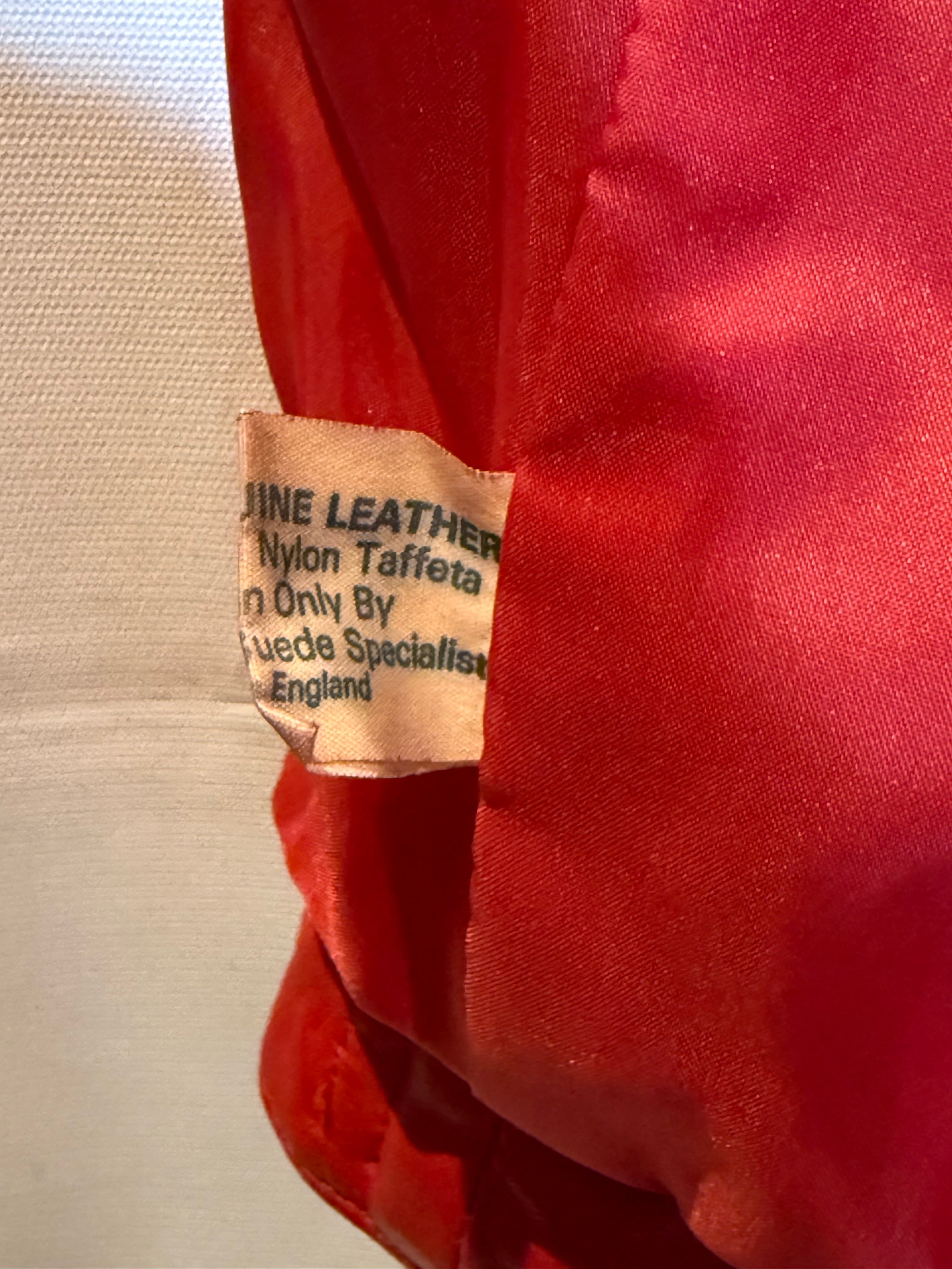 イングランド製、レッドレザージャケットになります。80年代のものだと思いますが、袖が取り外し可能で、レザーベストとしても着用できます。軽く柔らかいレザー(シープスキンでしょうか)で、着やすいです。コンディションも申し分ありません。フロントのスナップボタンと、細めの襟のバランスが時代を感じます。なかなか出会えないイングランド製レッドレザー、是非ご検討ください。