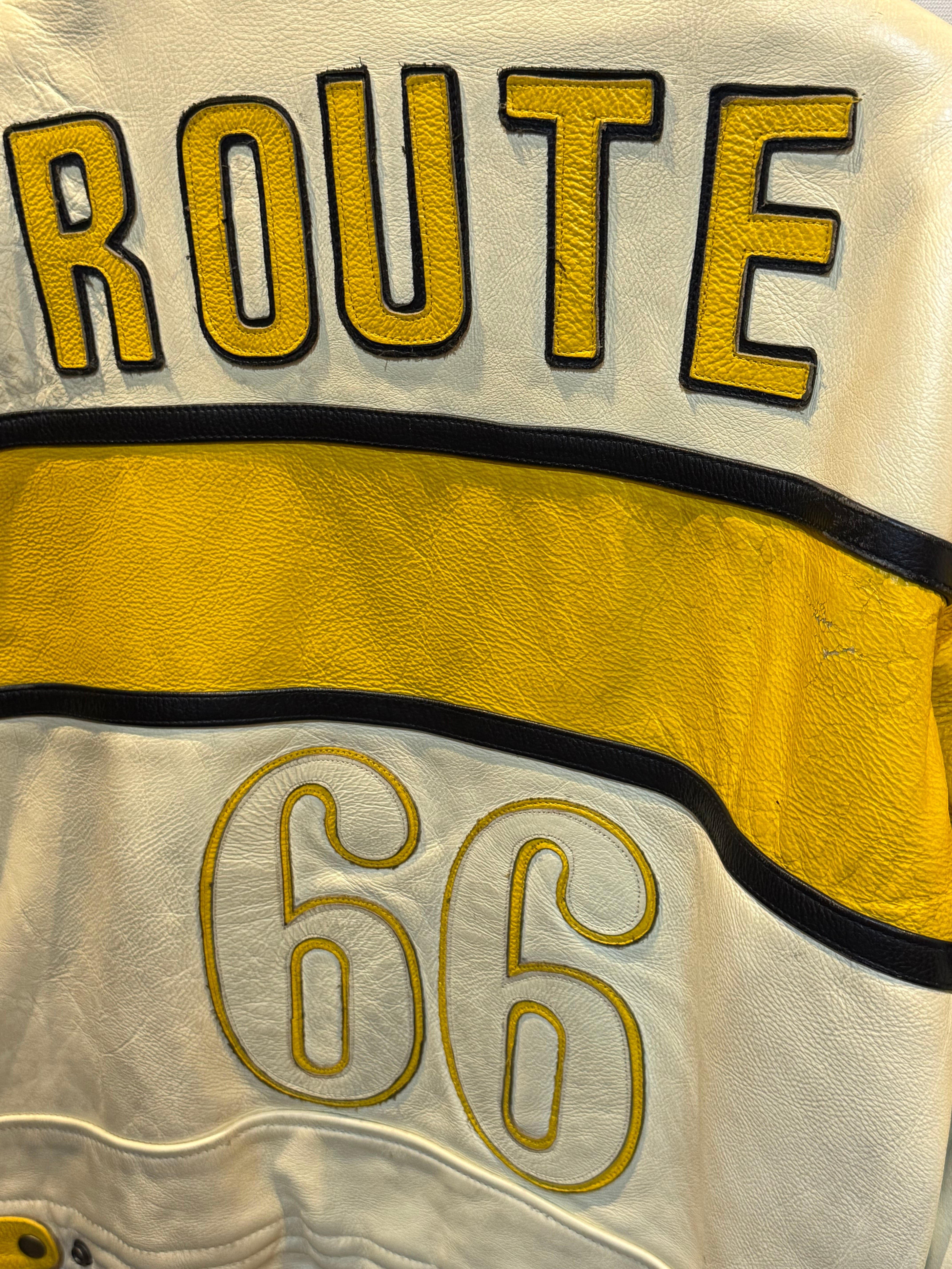 ヴィンテージのルート66フルデコレザージャケットです。モーターサイクル系レザージャケットに定評のあるトップギアの90年代のものになります。肉厚なビンテージレザーで、使用感はありますが、ライナー破れなどなく、コンディションは良いと思います。良い感じに擦れやシワが入っていて雰囲気が非常に良いです。ガレージに飾っていても良いですね。是非。
