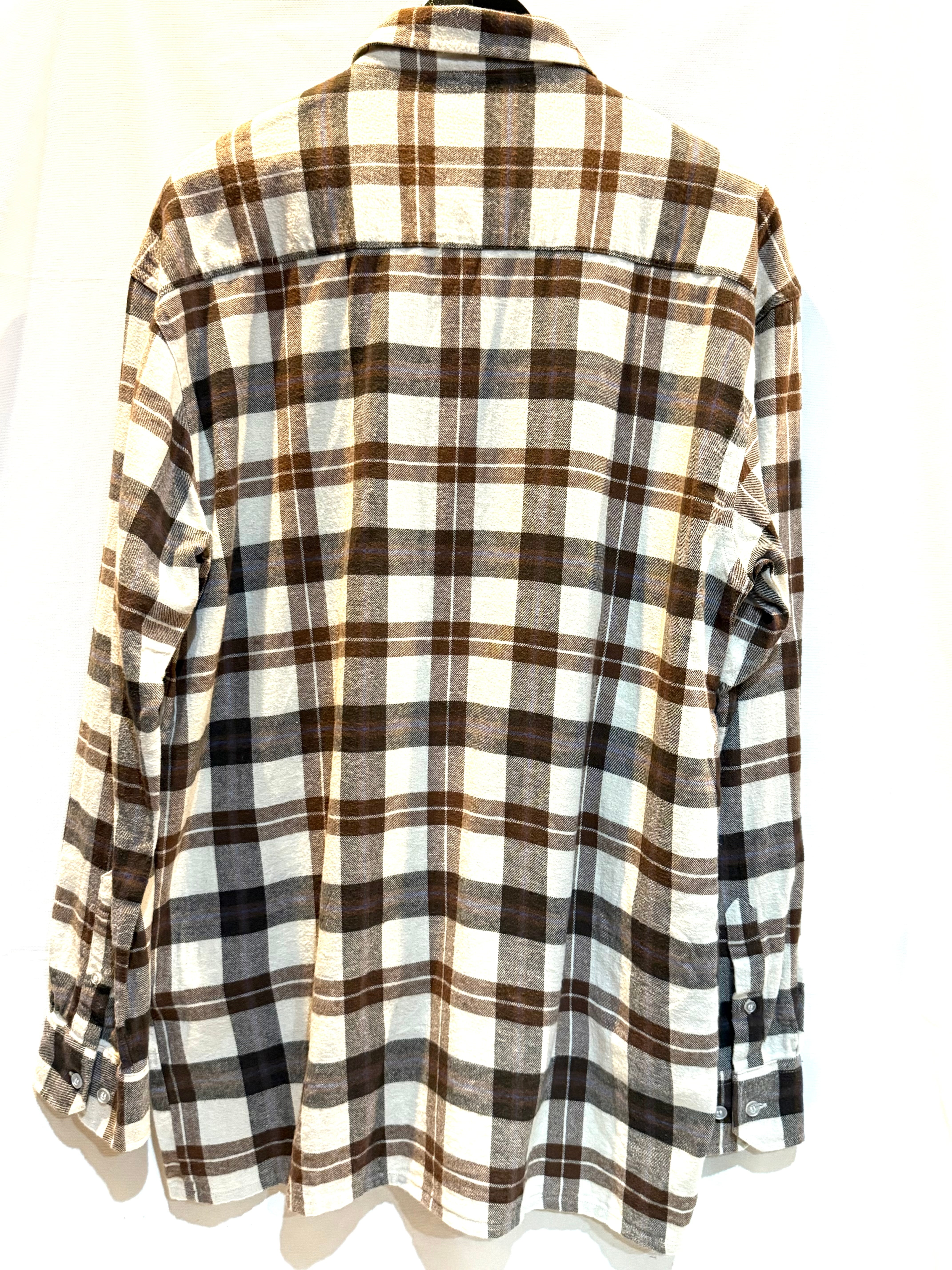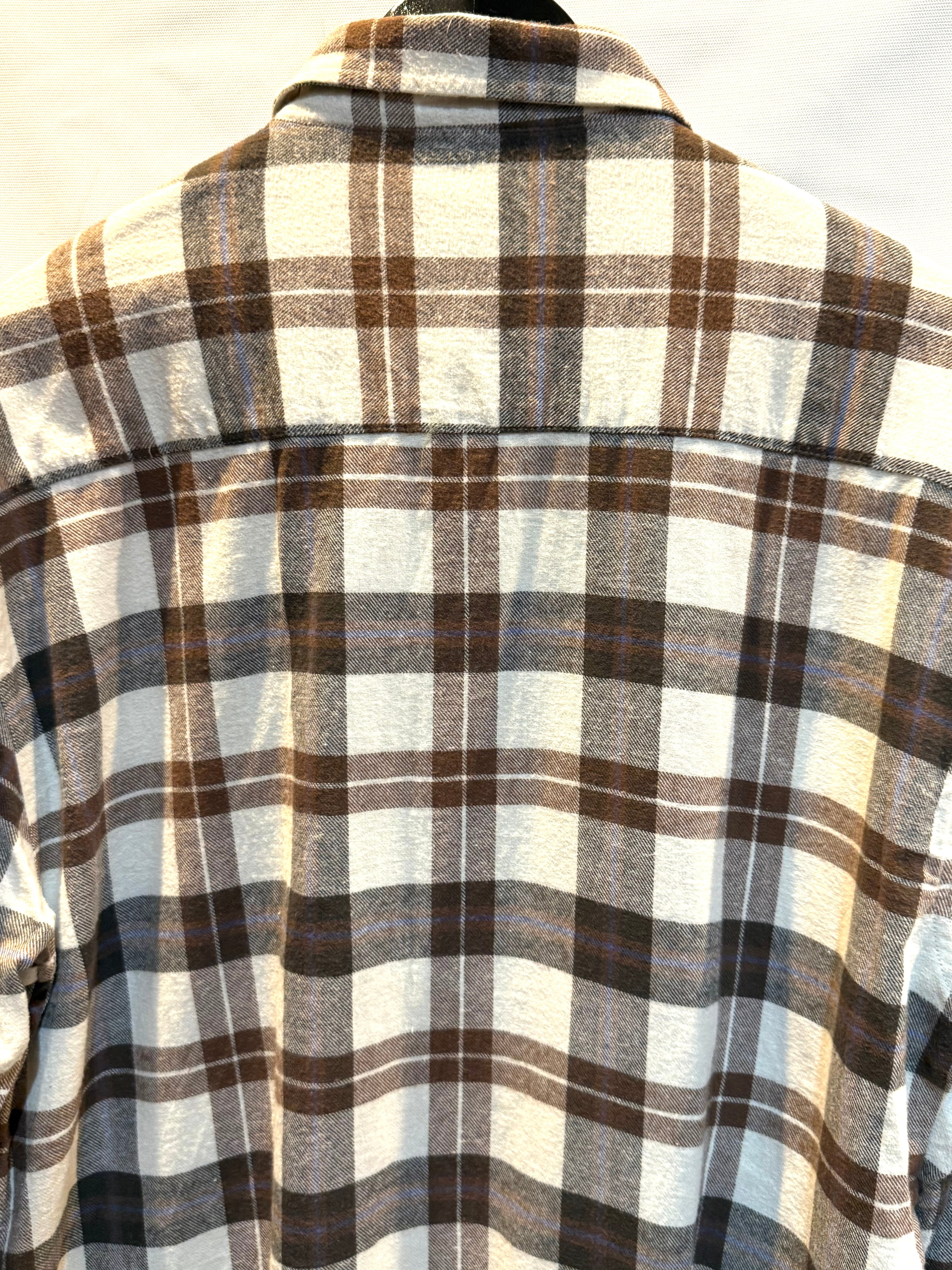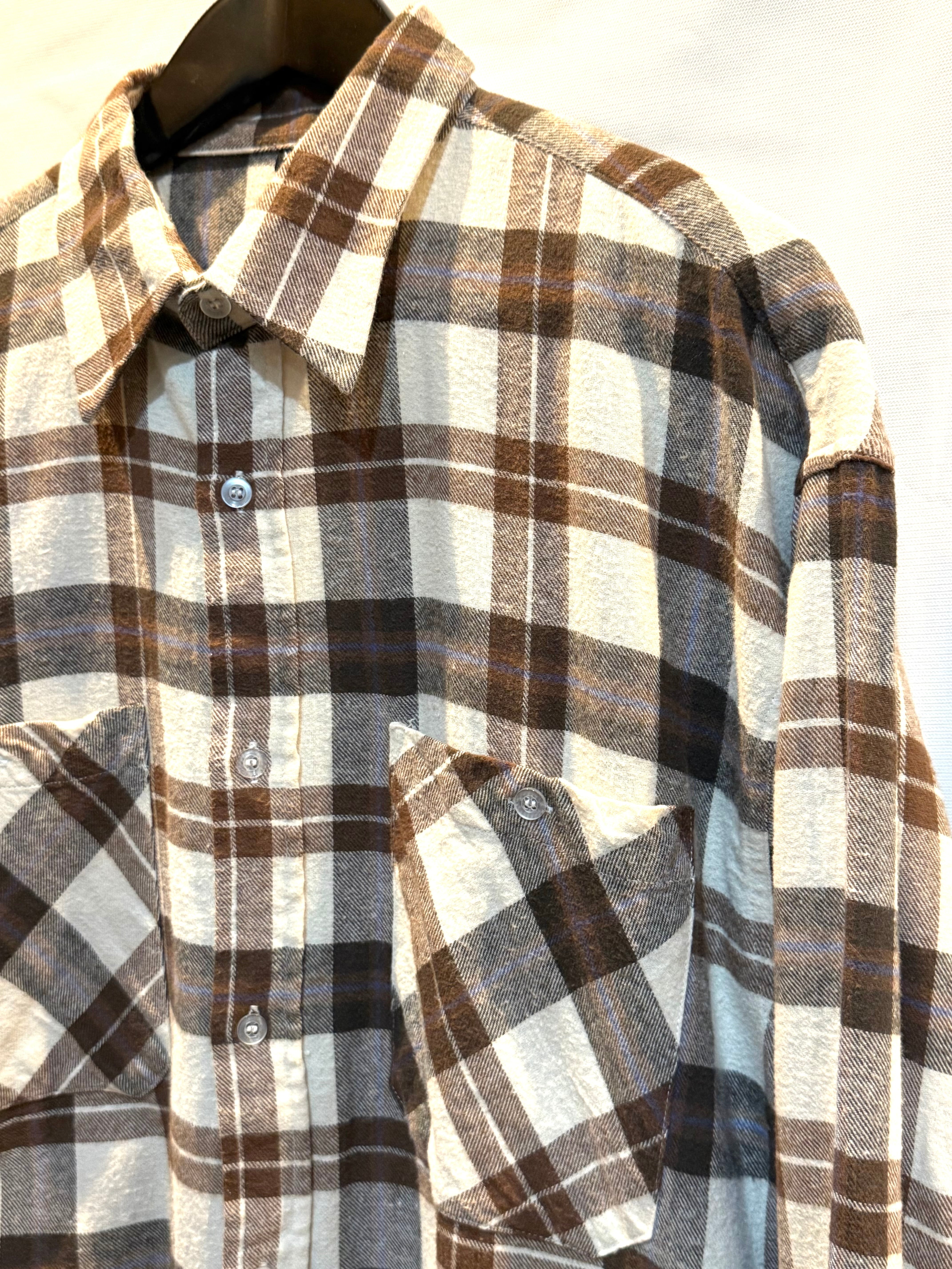 ロングタイプのチェックネルシャツです。リメイクのロングネルが多いですが、こちらはオリジナルのロング(ミドルくらいでしょうか)ネルになります。フロントのデカポケが良いですね。薄手のネルなので、1枚でも重ねても使えます。色合いがいいのでおススメです。