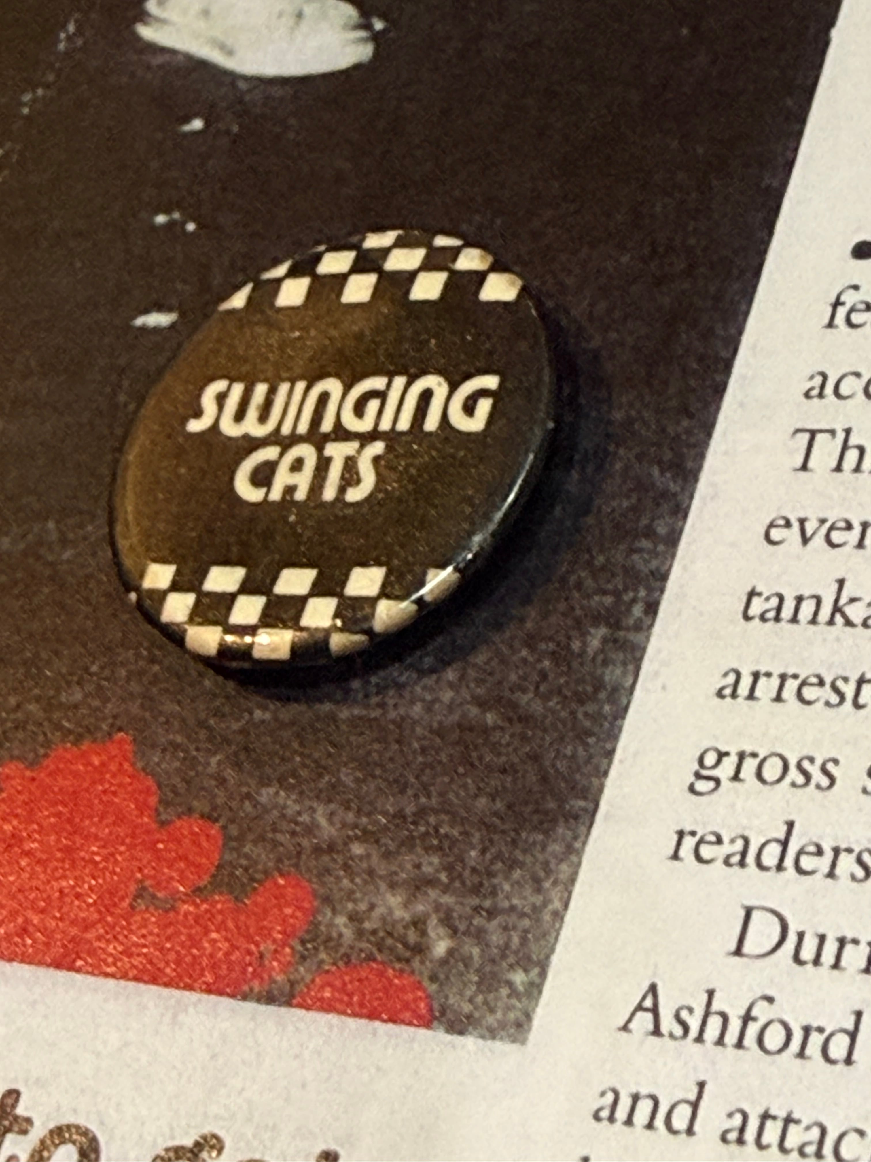 イギリスのスカ・ポップ・バンド Swinging catsのオールド缶バッジです。スペシャルズとレーベルが同じと言われると、このバッジのデザインにも納得ですね。MA-1、モッズコート、革ジャンに是非!