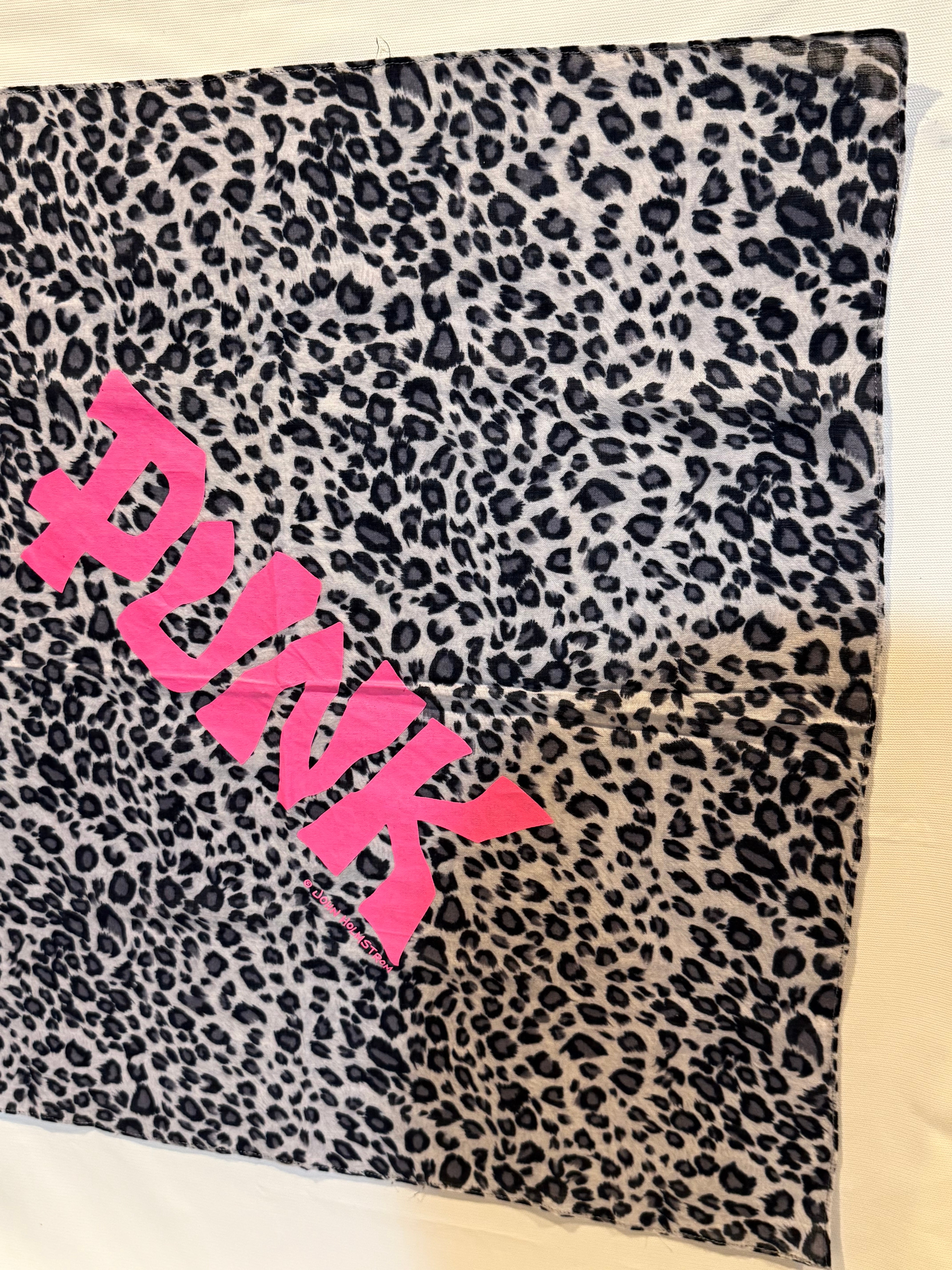 レオパード柄のPunkプリントスカーフです。90年代頃のものになります。アメリカのアンダーグラウンドな漫画家・ライターで、ラモーンズのアルバムの表紙や70年代創刊PUNK Magazine誌の編集長、John Holmstromが手掛けたPUNKのプリントが入っています。ブロンディのデボラハリーが、この文字のTシャツを着用しているのが有名ですね。ガーゼっぽい生地感で、サイズも大きく、首元に巻いたり、飾っておくのもインパクトがあってオススメです。非常に珍しいアイテムですので是非。