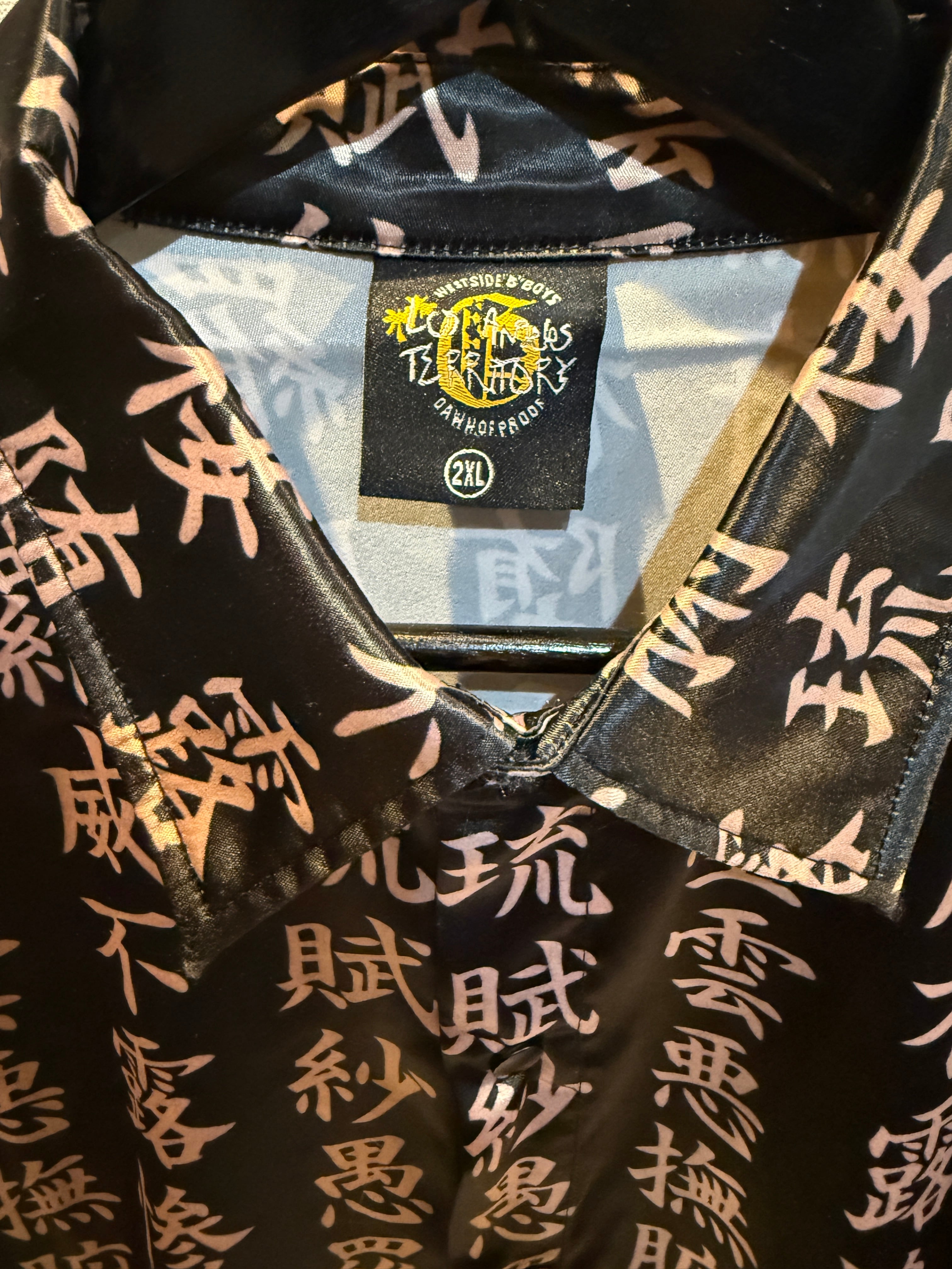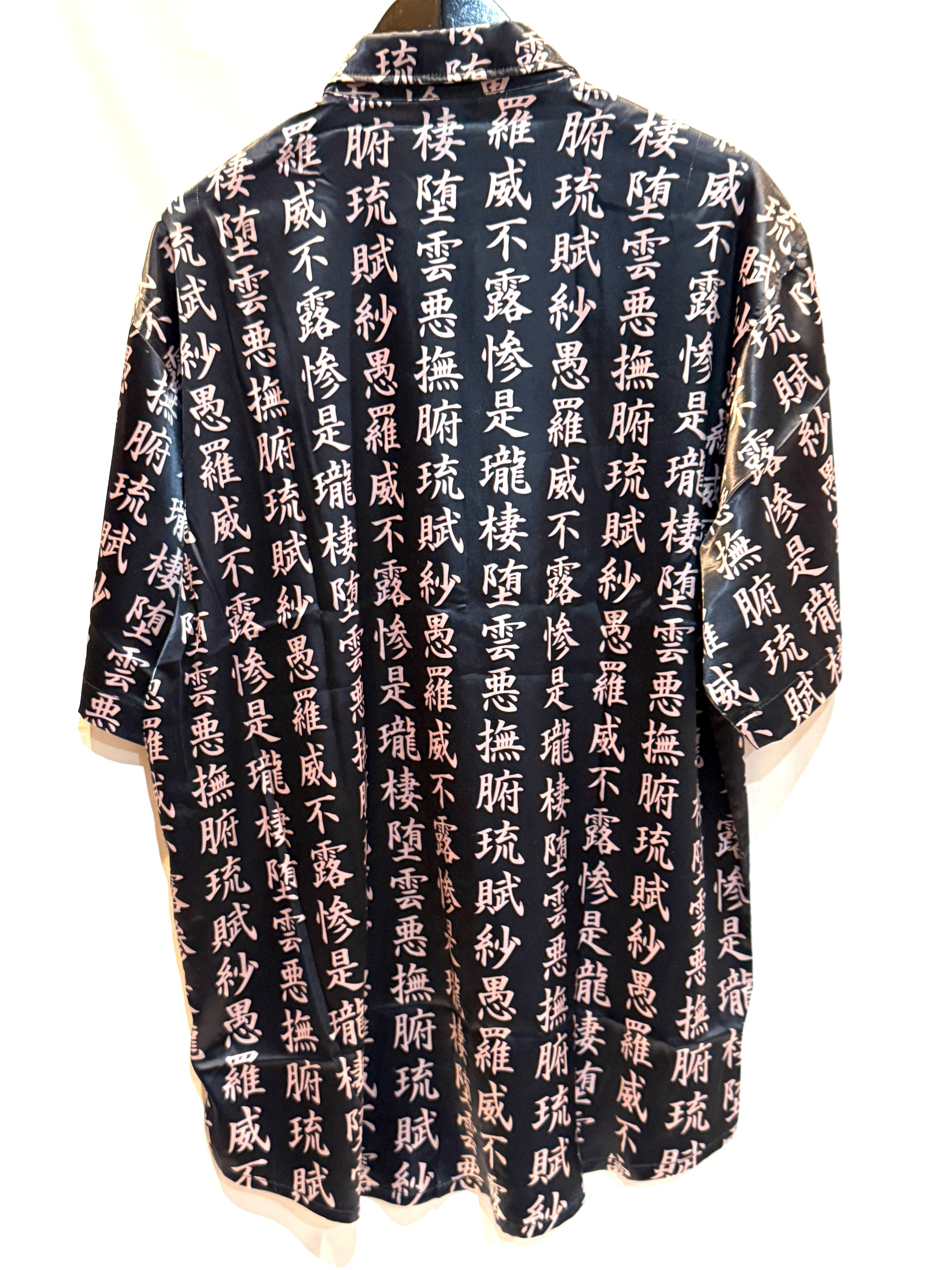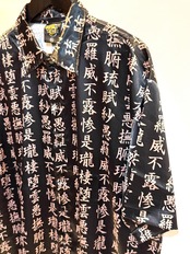 90年代の漢字シャツです。ブラックにピンクの漢字がインパクトあります。ラロッカにインスパイアされての作品に感じられますね。ポリエステル素材でサラッとしていて着心地良さそうです。サイズが大きめなので、今ならロンTやパーカーの上からなどでも良いかと思います。オススメです。