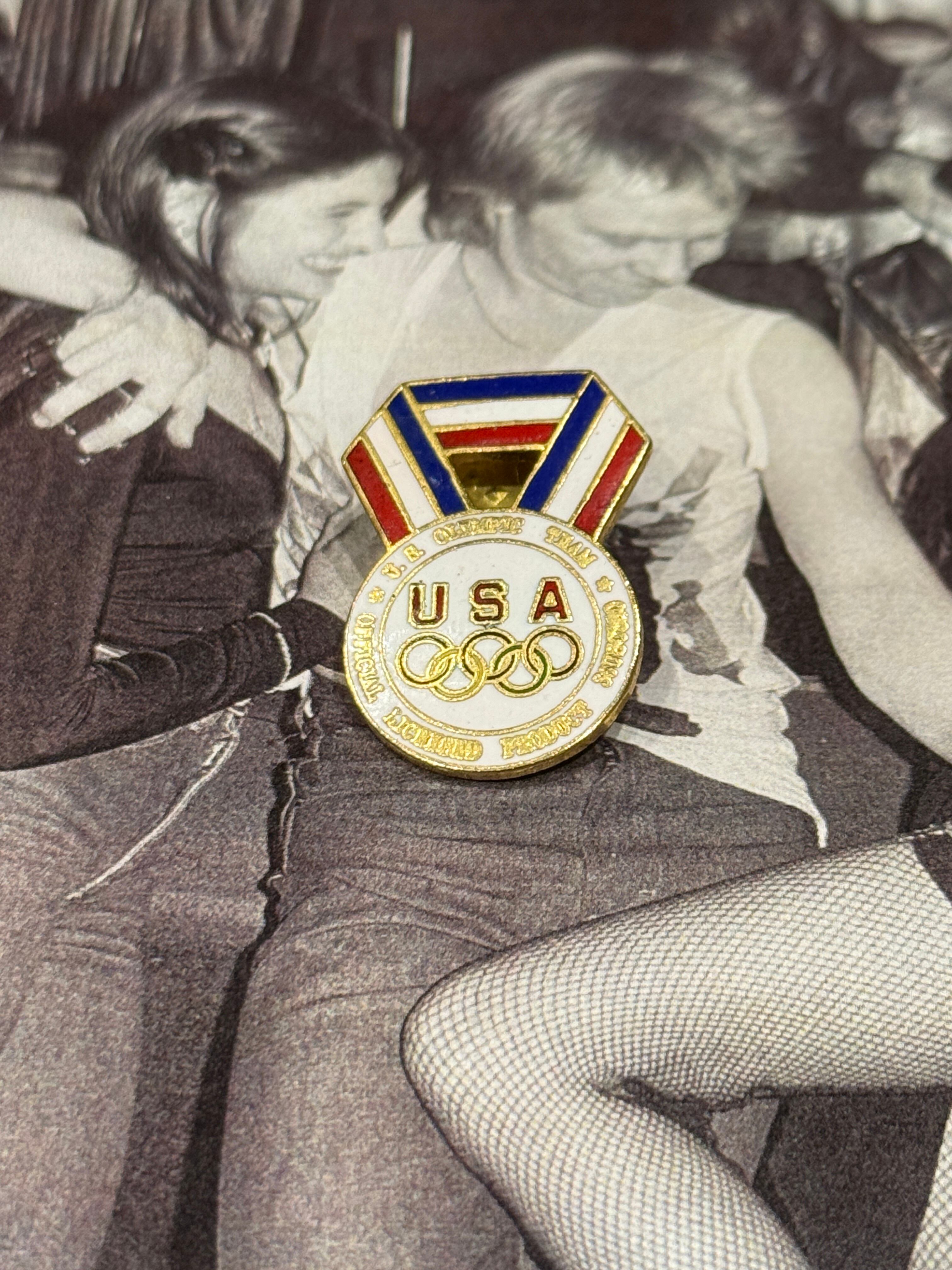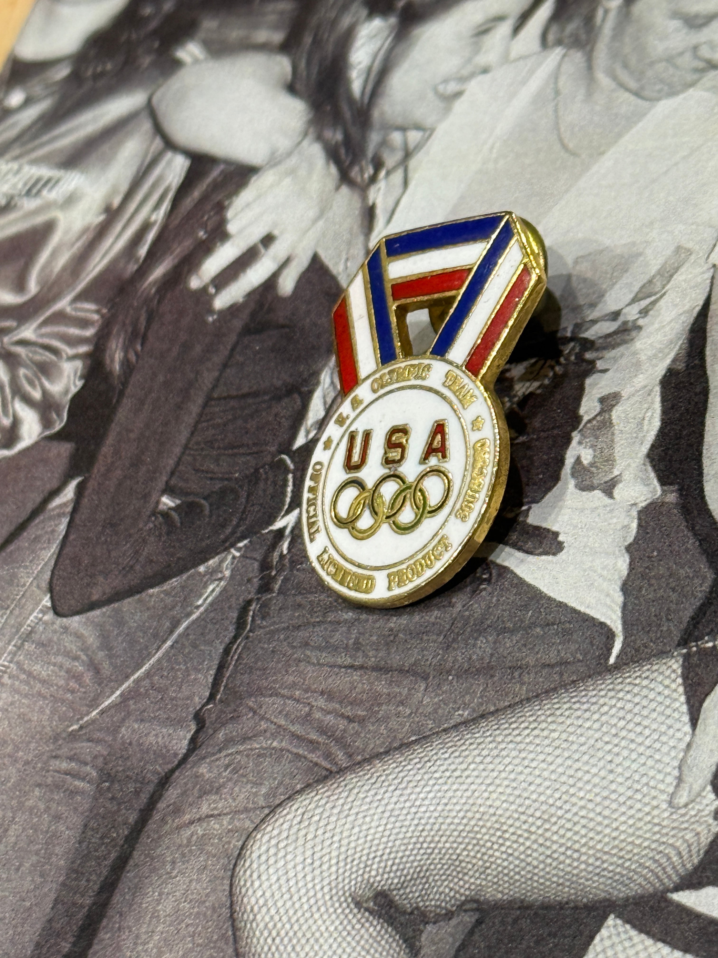 オリンピックのメダル型のピンバッジです。あまり見かけないデザイン。お好きな方、是非。