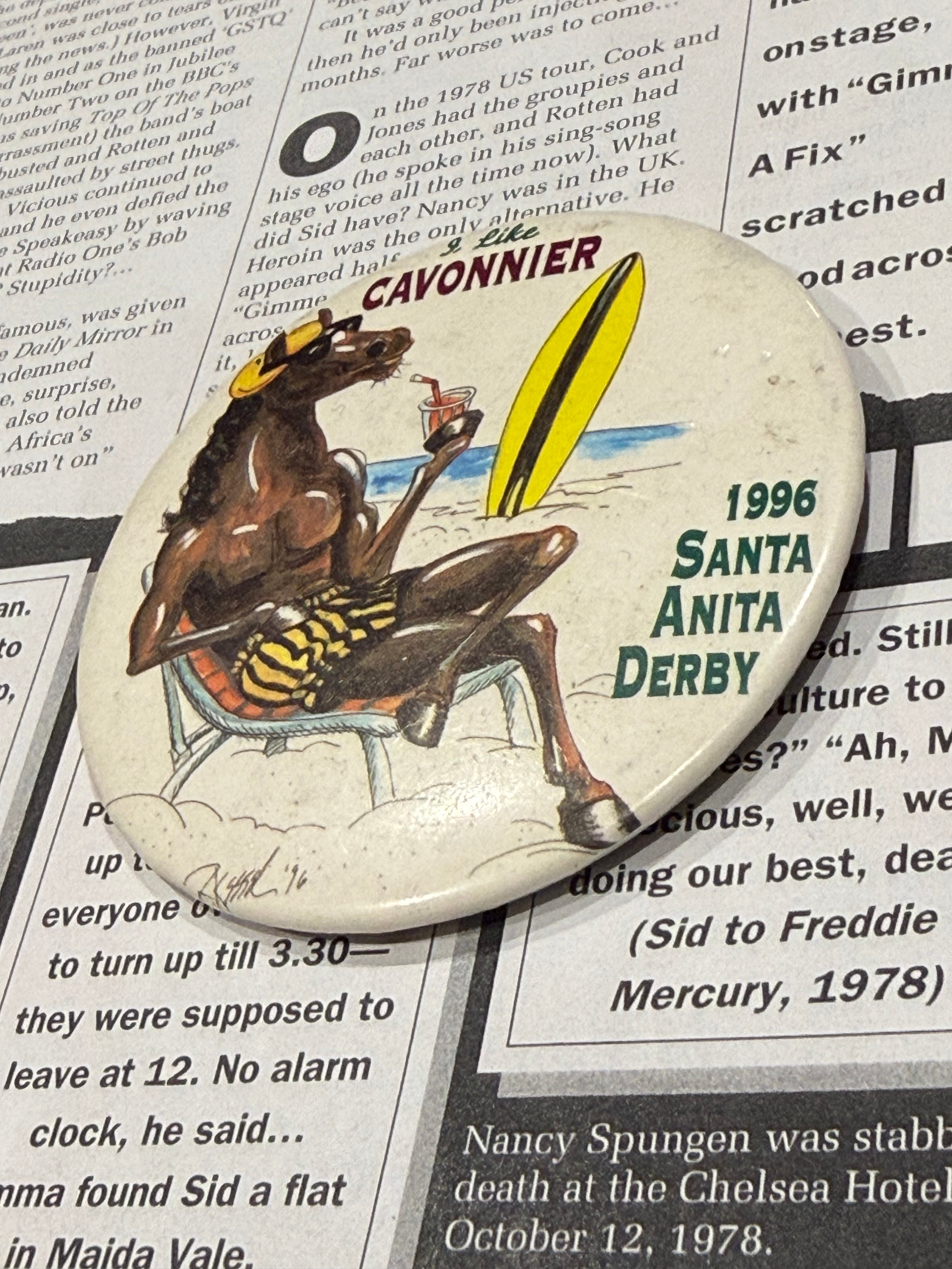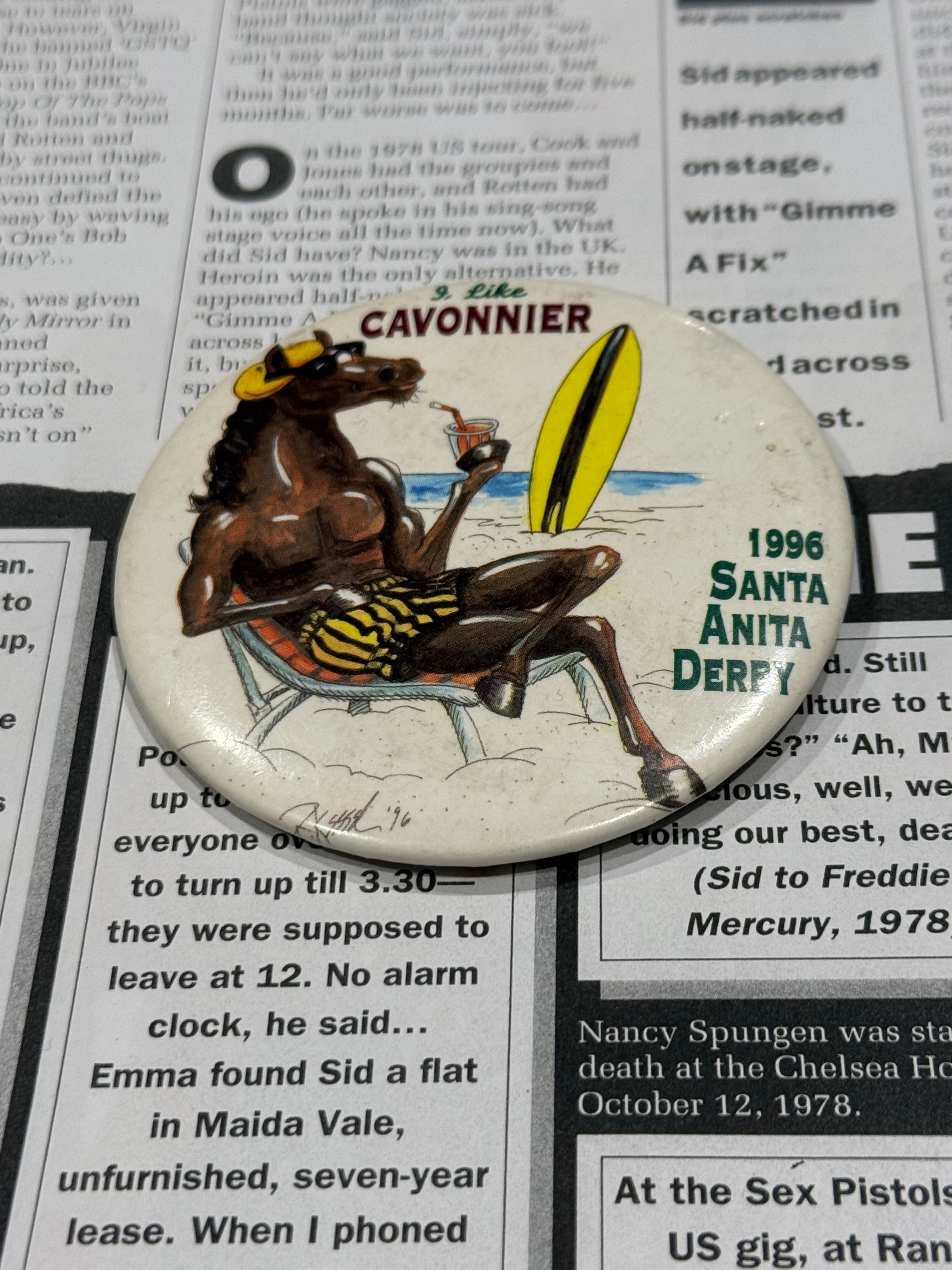 19世紀初頭に活躍したイギリスのサラブレッド競走馬)をコミカルに描いたものだと思われます。ビッグサイズでインパクトあります。丙午の今年にぴったりなヴィンテージバッジ、おすすめです。