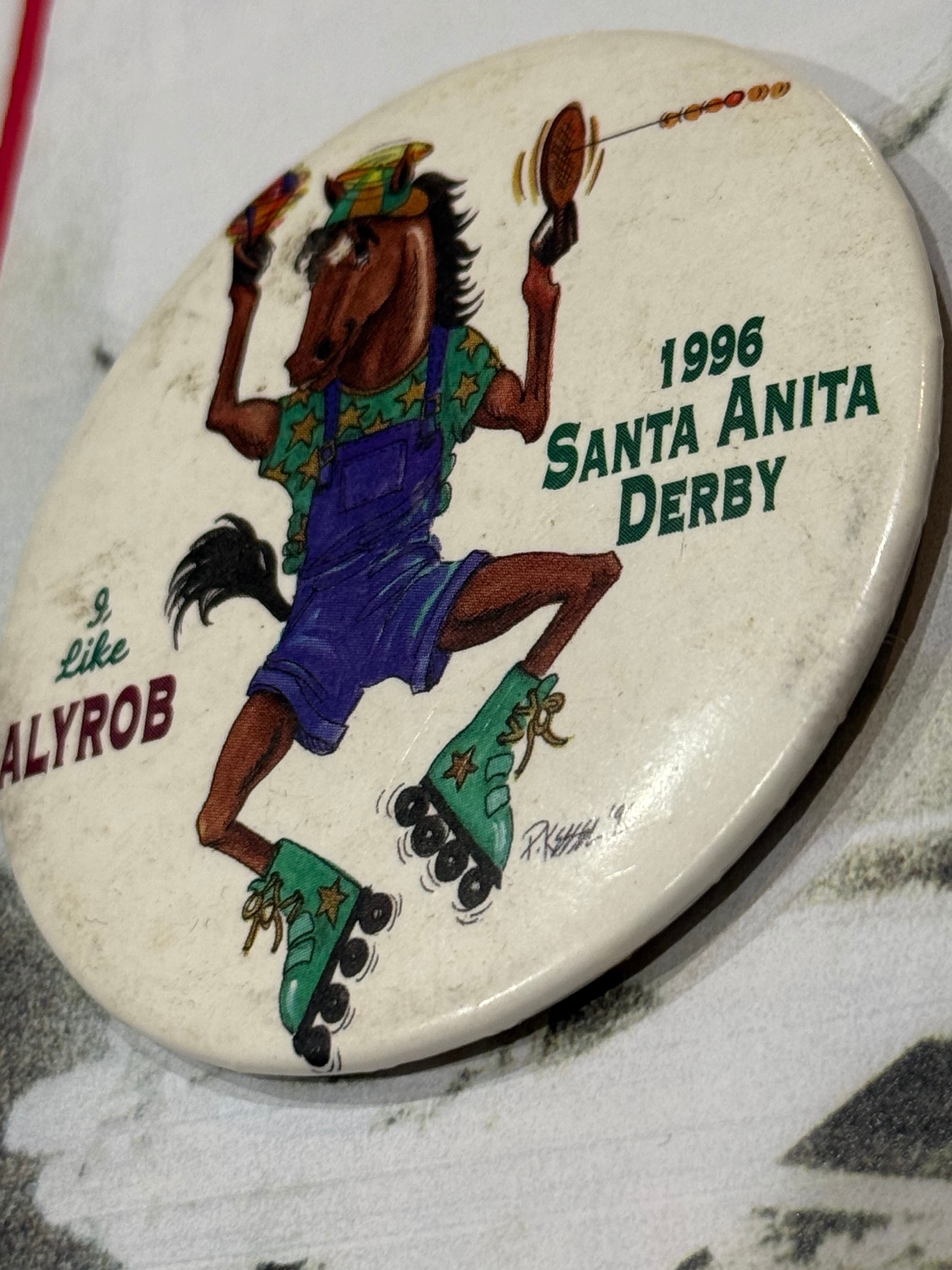 19世紀初頭に活躍したイギリスのサラブレッド競走馬)をコミカルに描いたものだと思われます。ビッグサイズでインパクトあります。丙午の今年にぴったりなヴィンテージバッジ、おすすめです。