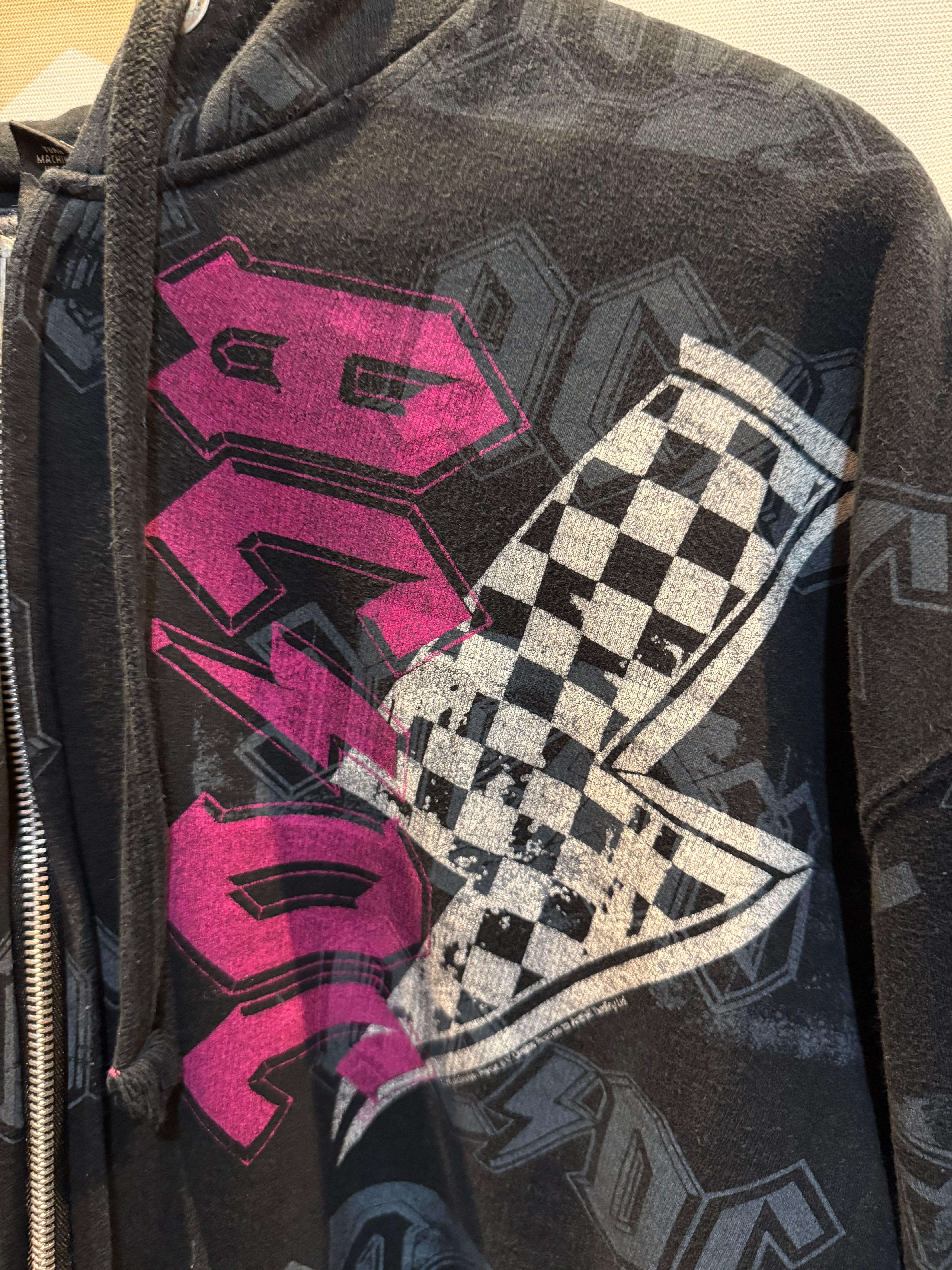 2008年のACDCのオフィシャルツアーパーカーです。ロゴの総柄デザインです。左胸のピンクロゴが効いてますね。フロントジップタイプなので、寒暖差の激しいこの時期、1枚持っていたいタイプです。是非!