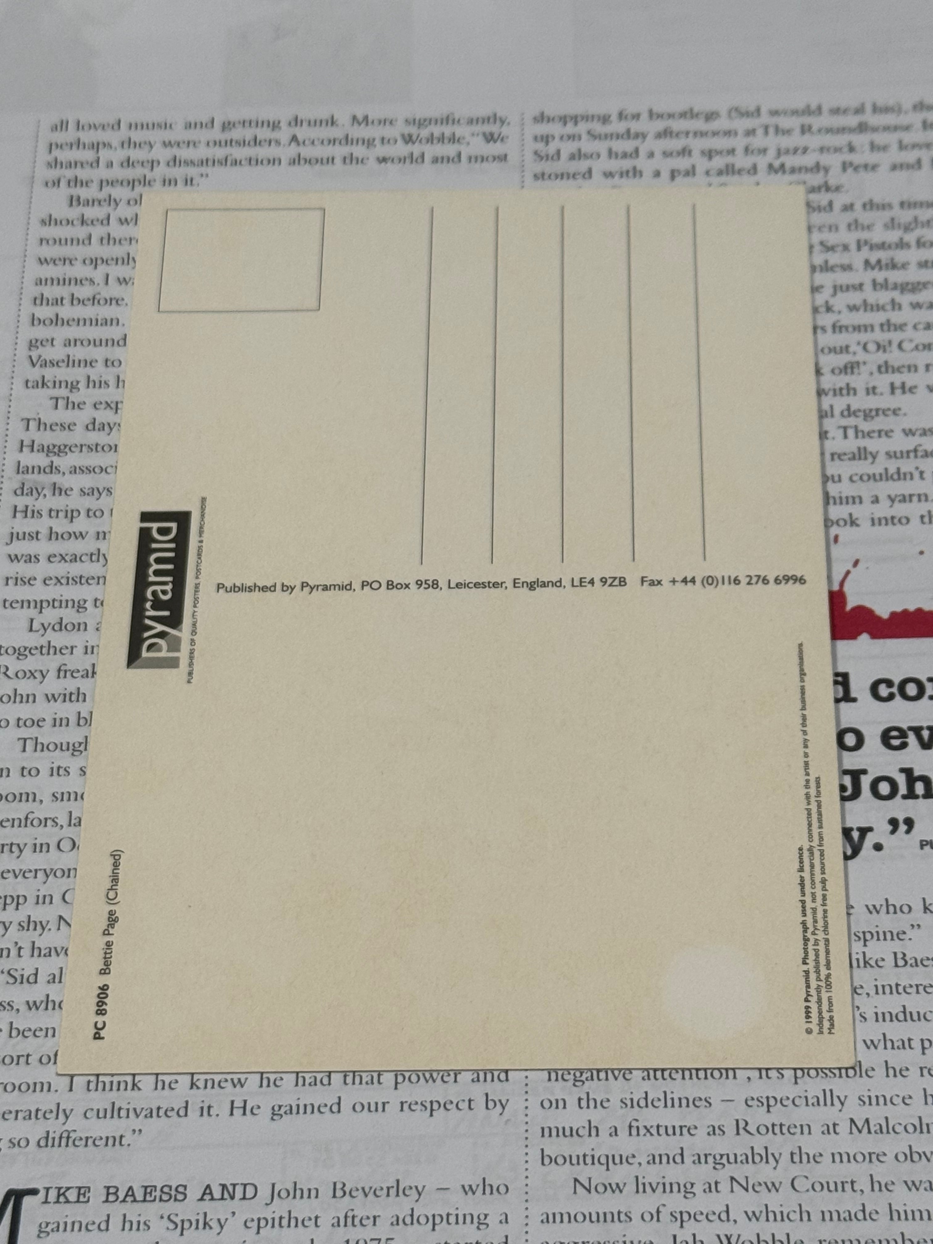 伝説のボンデージモデル、ベティペイジのポストカードになります。99年に販売されていたものかと思います。珍しいショットですね。額装すると、なかなか雰囲気があって良いかと思います。是非!