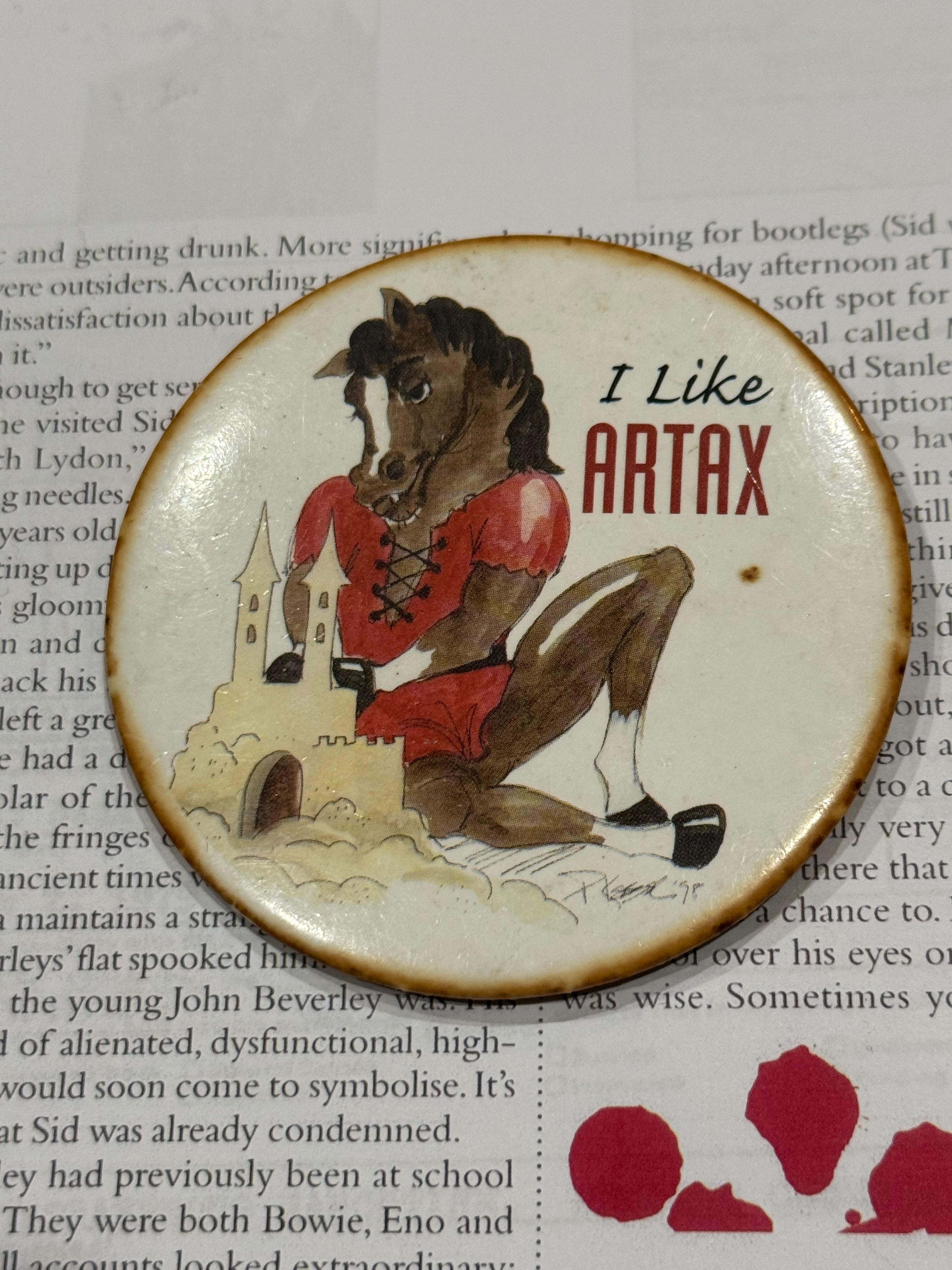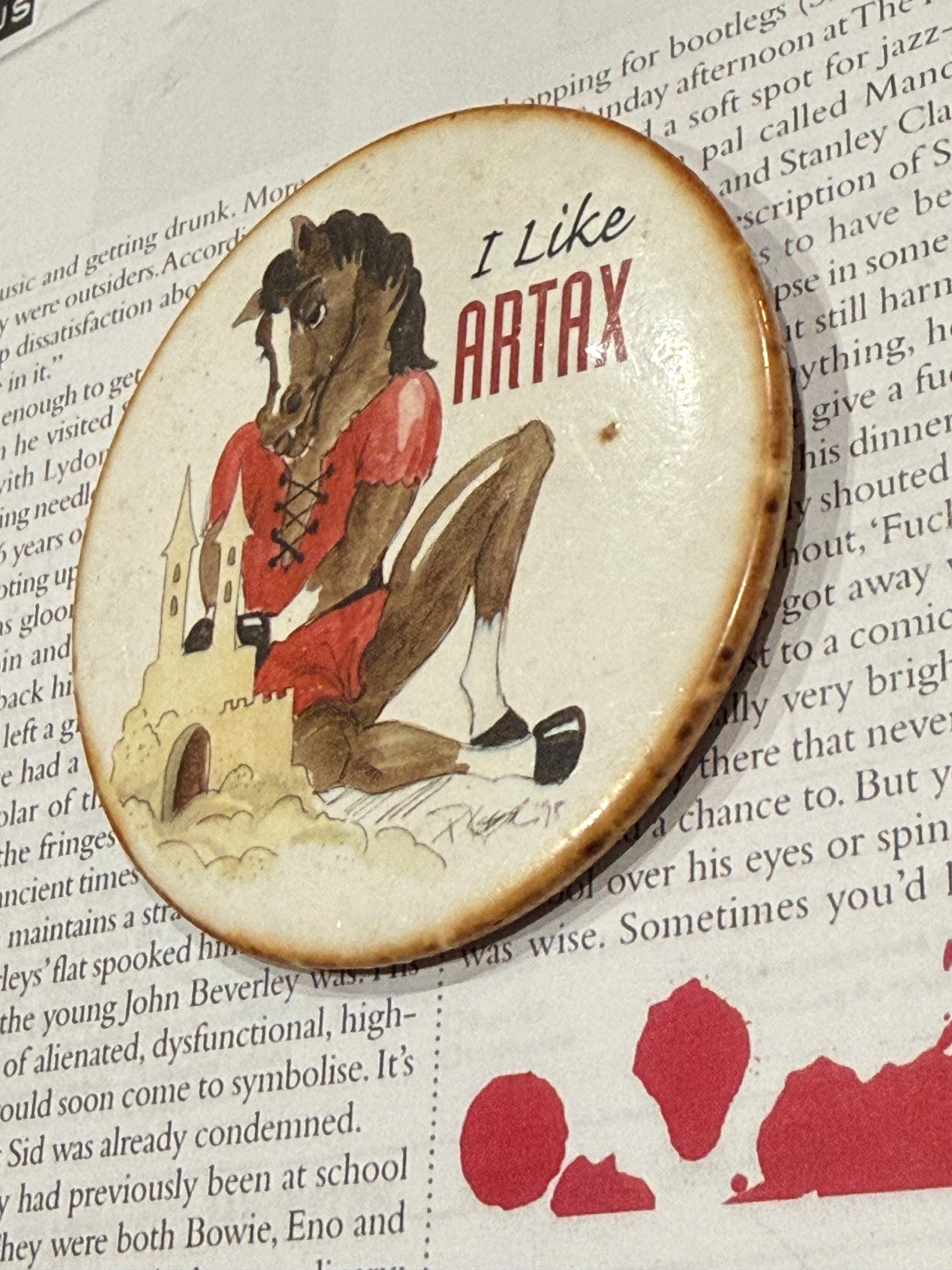 19世紀初頭に活躍したイギリスのサラブレッド競走馬)をコミカルに描いたものだと思われます。ビッグサイズでインパクトあります。丙午の今年にぴったりなヴィンテージバッジ、おすすめです。