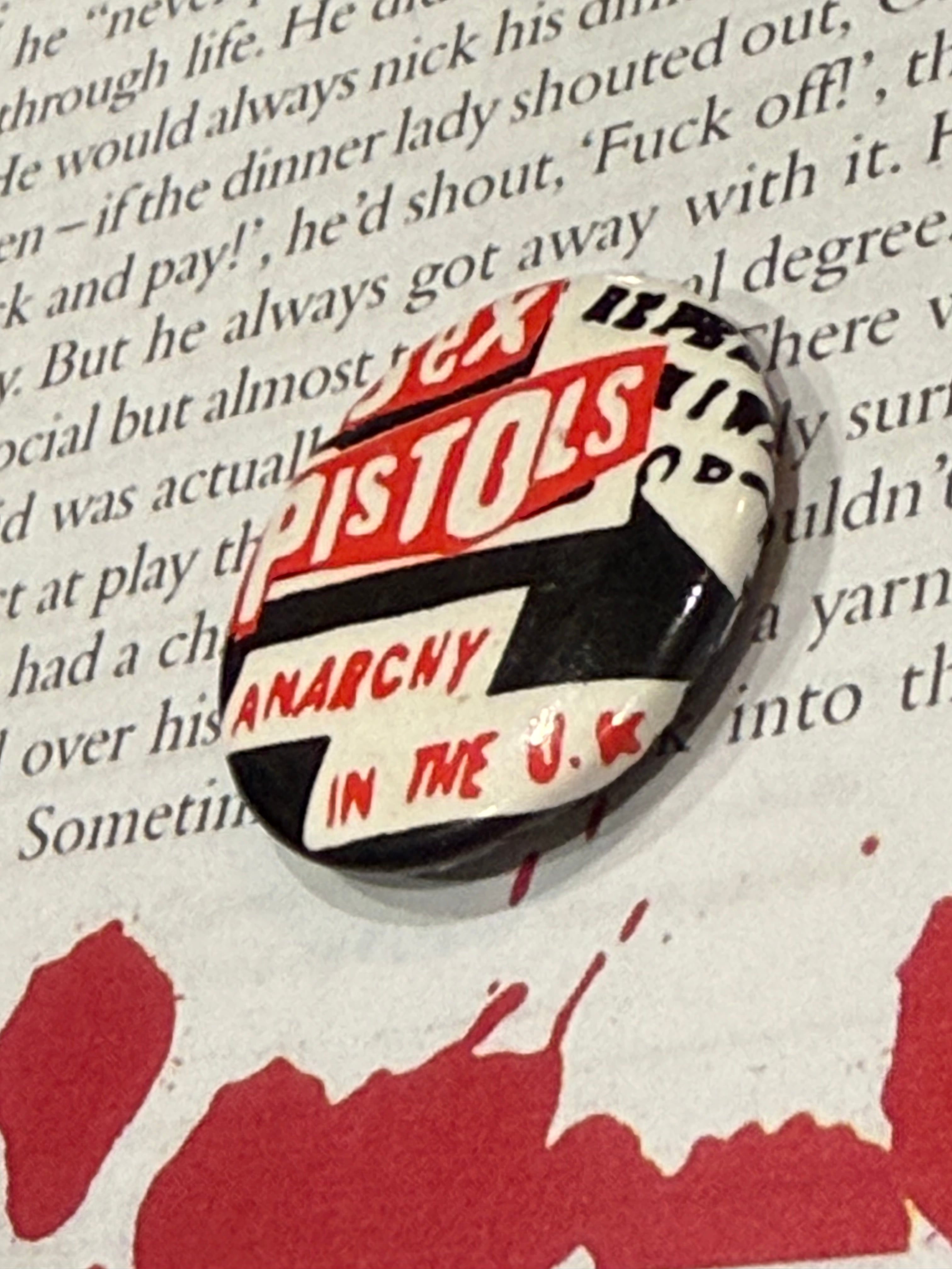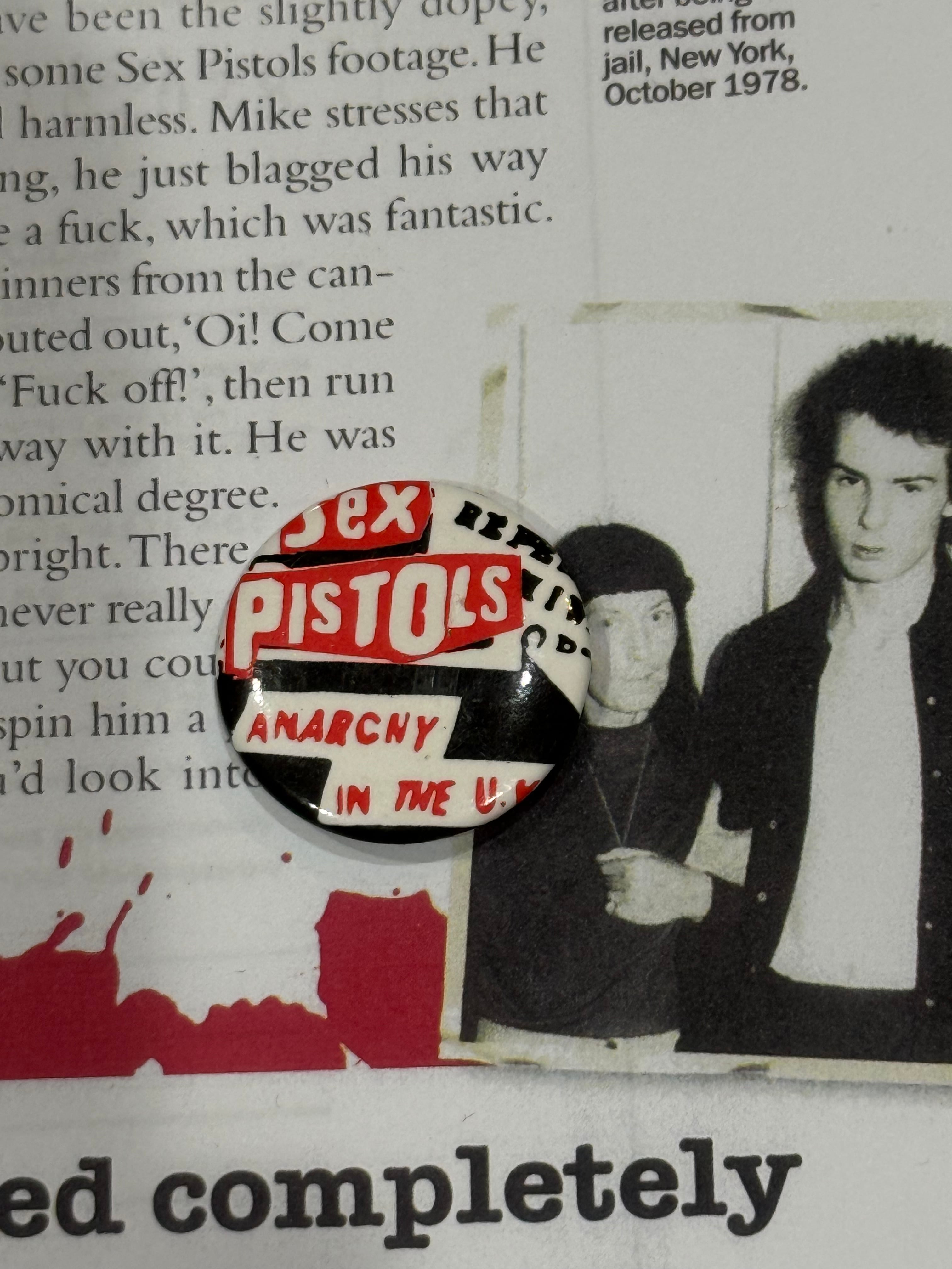 セックスピストルズの缶バッジです。90年代前後くらいでしょうか。Anarcny in the UKのデザイン、あまり見たことが無いので、お好きな方は是非!