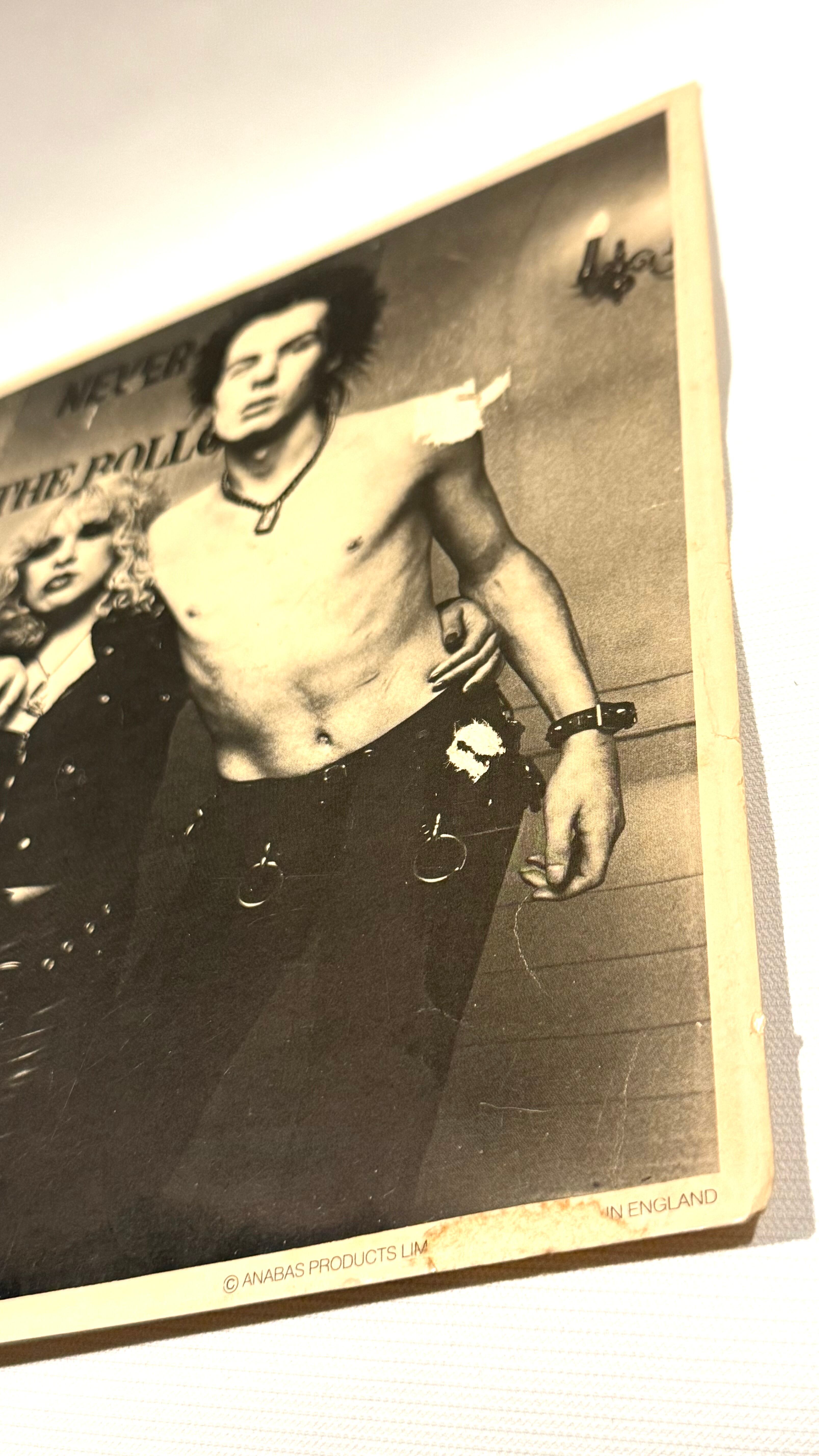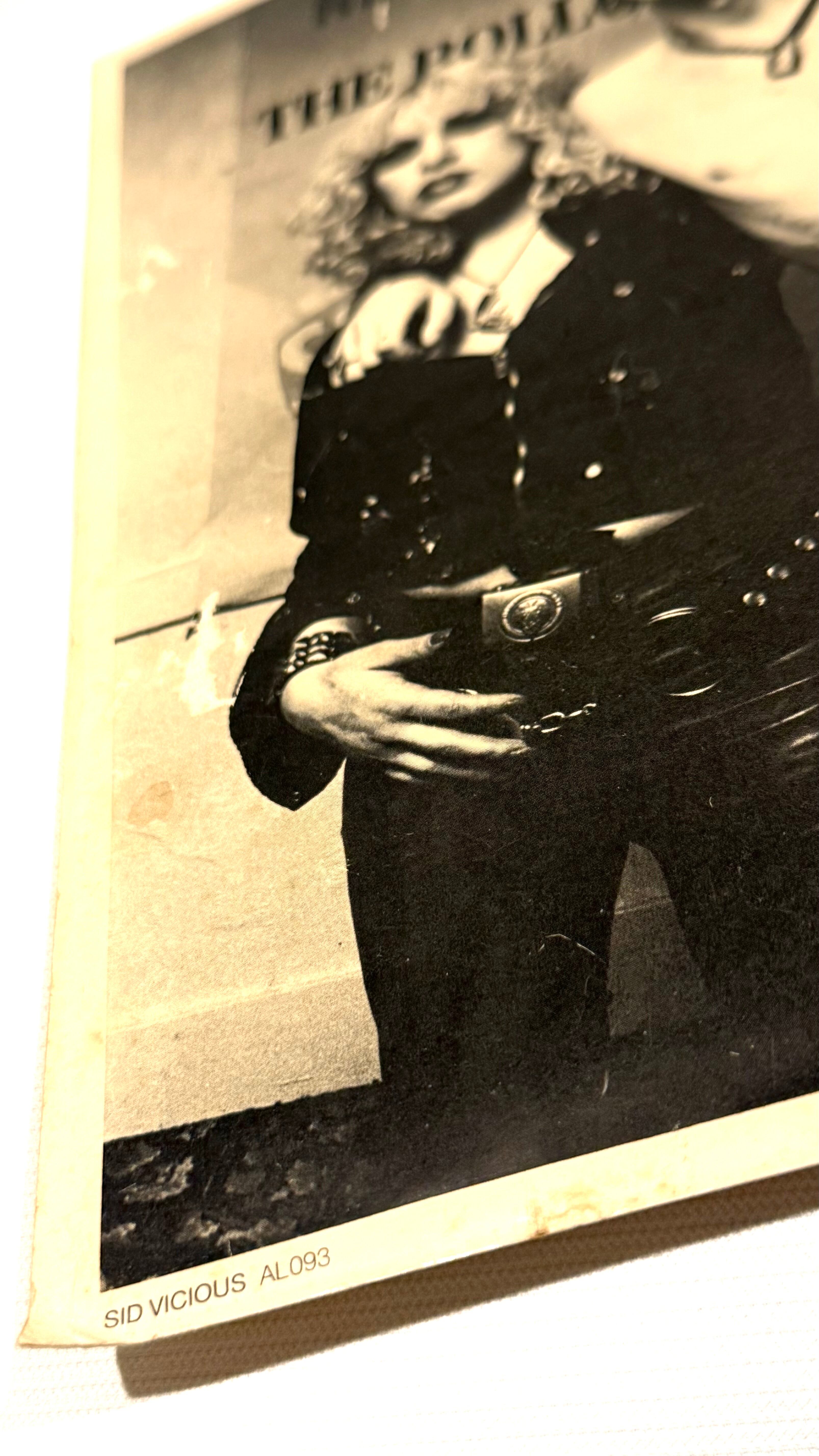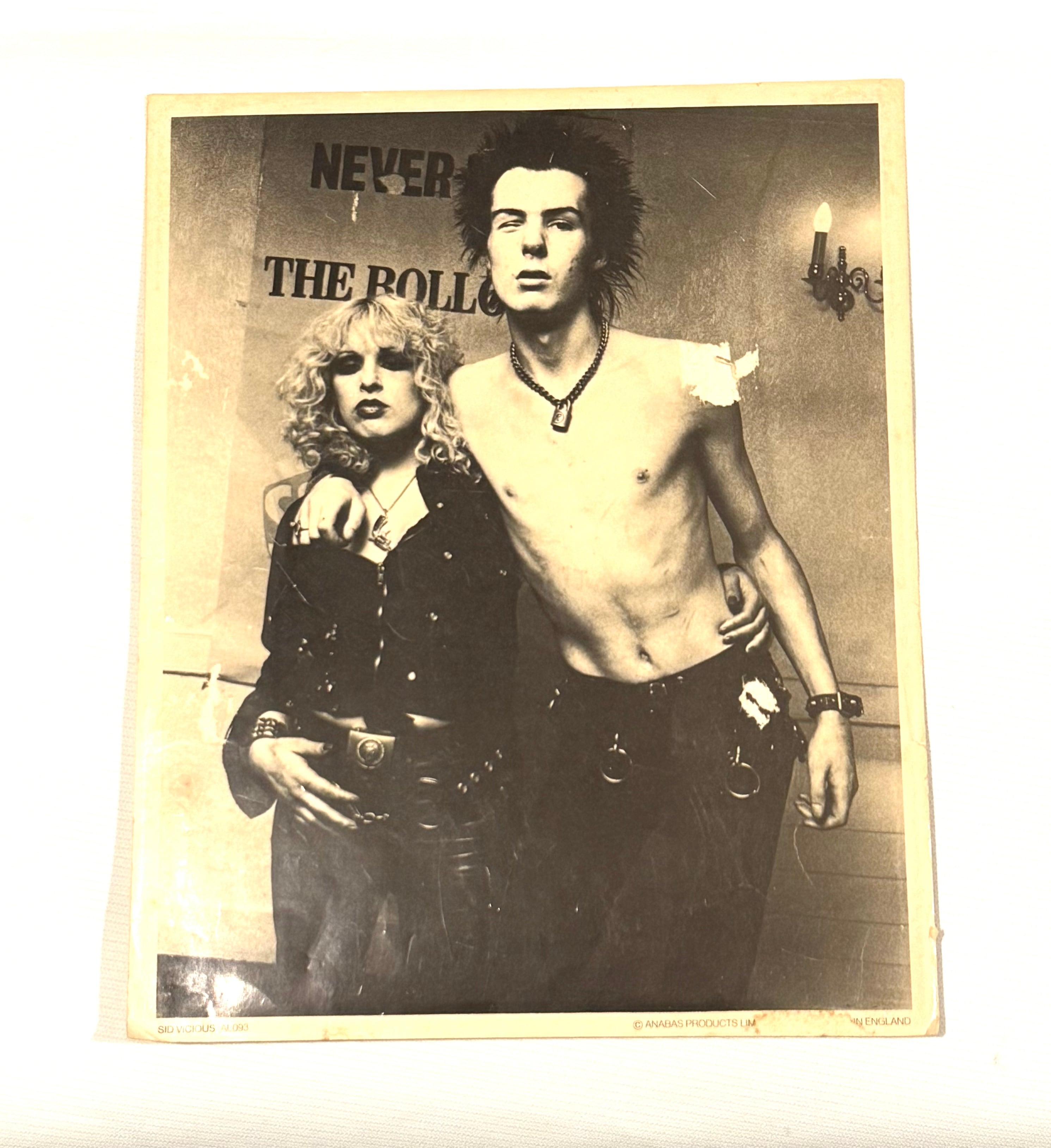 セックスピストルズ・シド&ナンシープロモーション用フォトになります。コピーライトが入っています。当時何らかのかたちで販売されていたものかと思います。Never mind をバックにしたツーショットは、かなり珍しいです。表面のダメージ・裏面のテープ剥がし跡などありますが、なかなか雰囲気があって良いかと思います。是非!