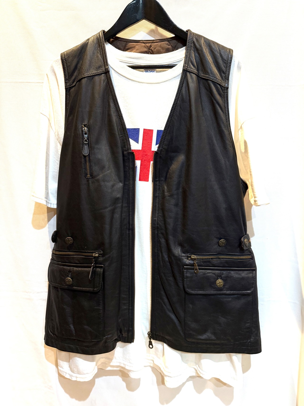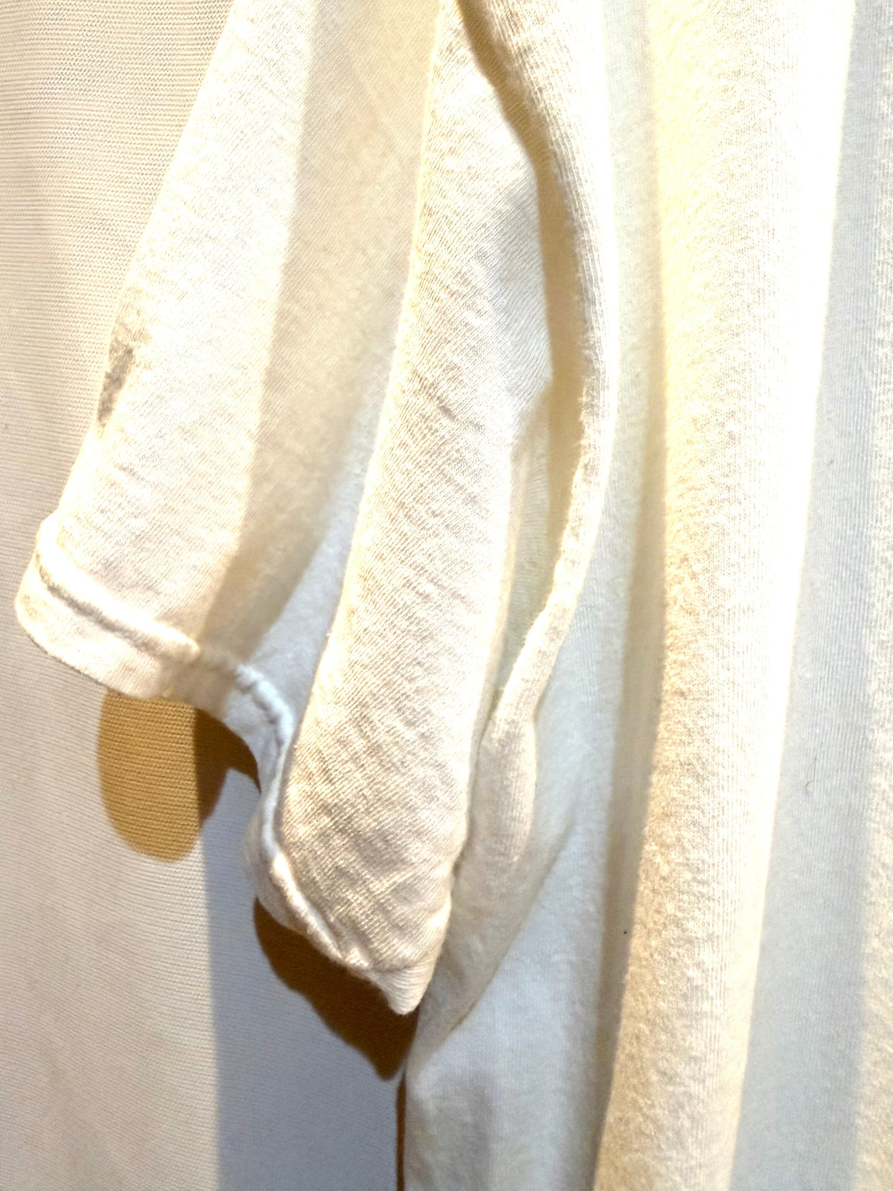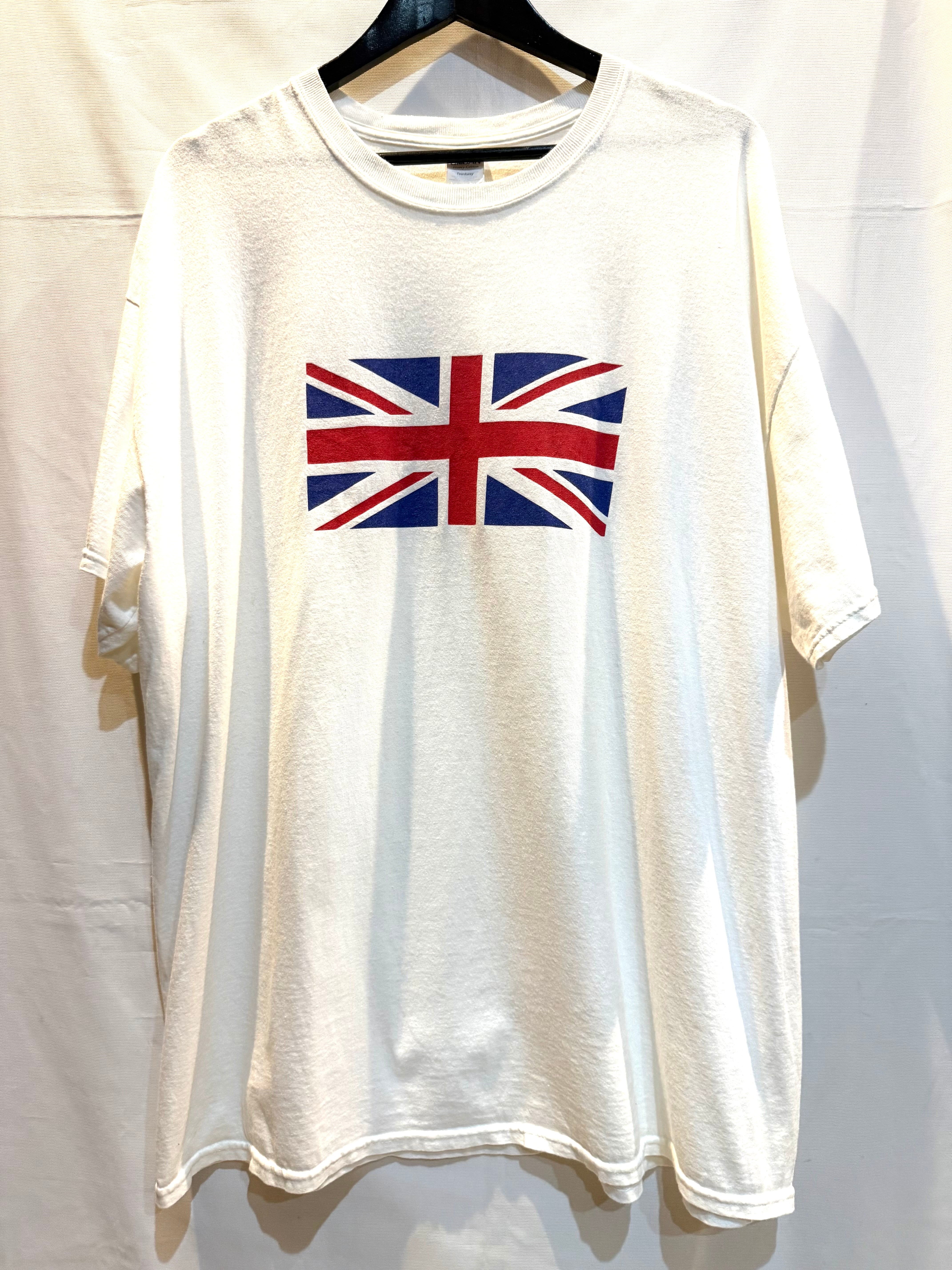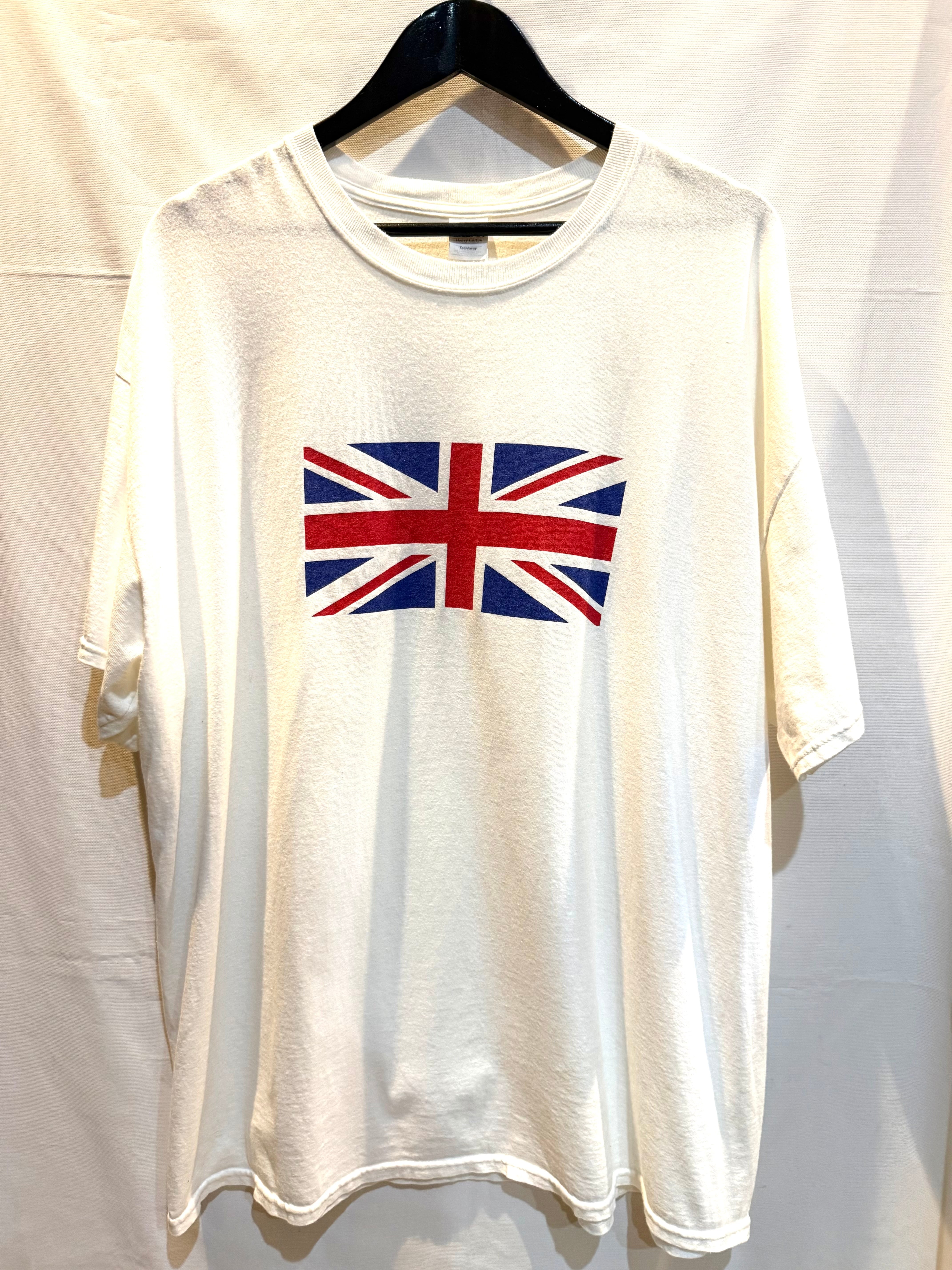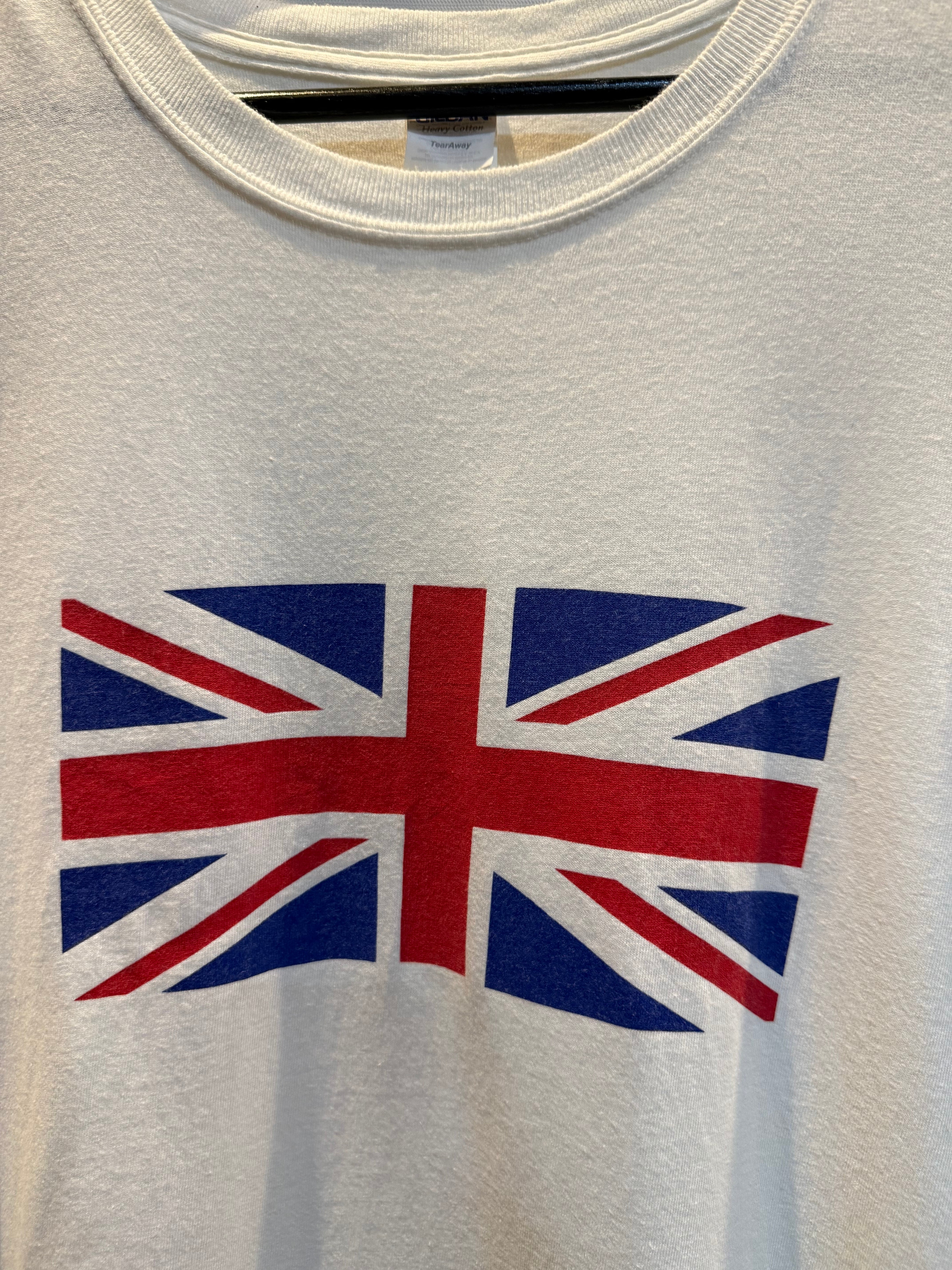 ユニオンジャックTシャツです。2000年に入ってからのものだと思います。定番のシンプルな一枚です。大きめサイズですので、軽いレザーにスキニーにブーツといったシンプルスタイルが、合いそうです。是非。