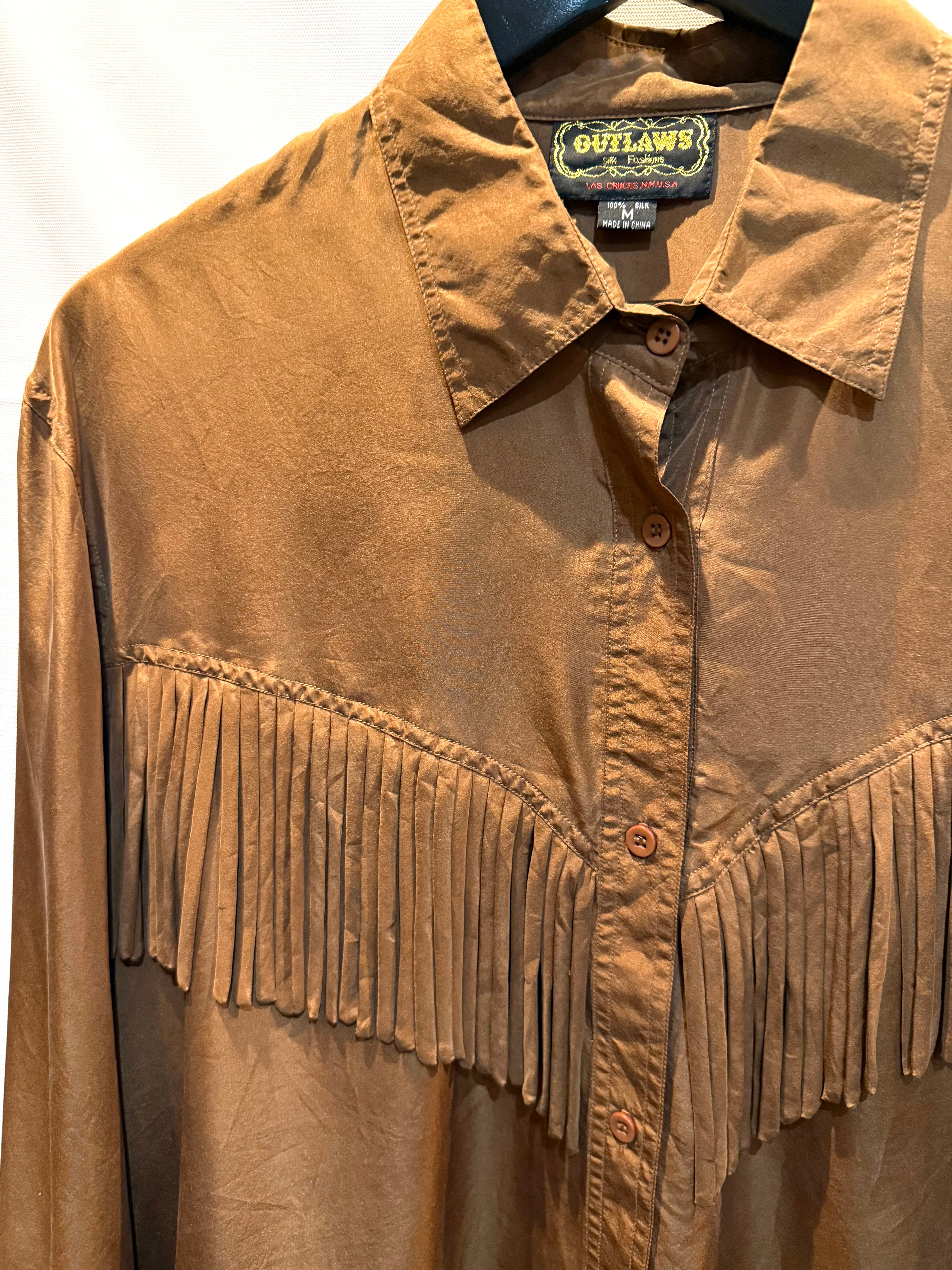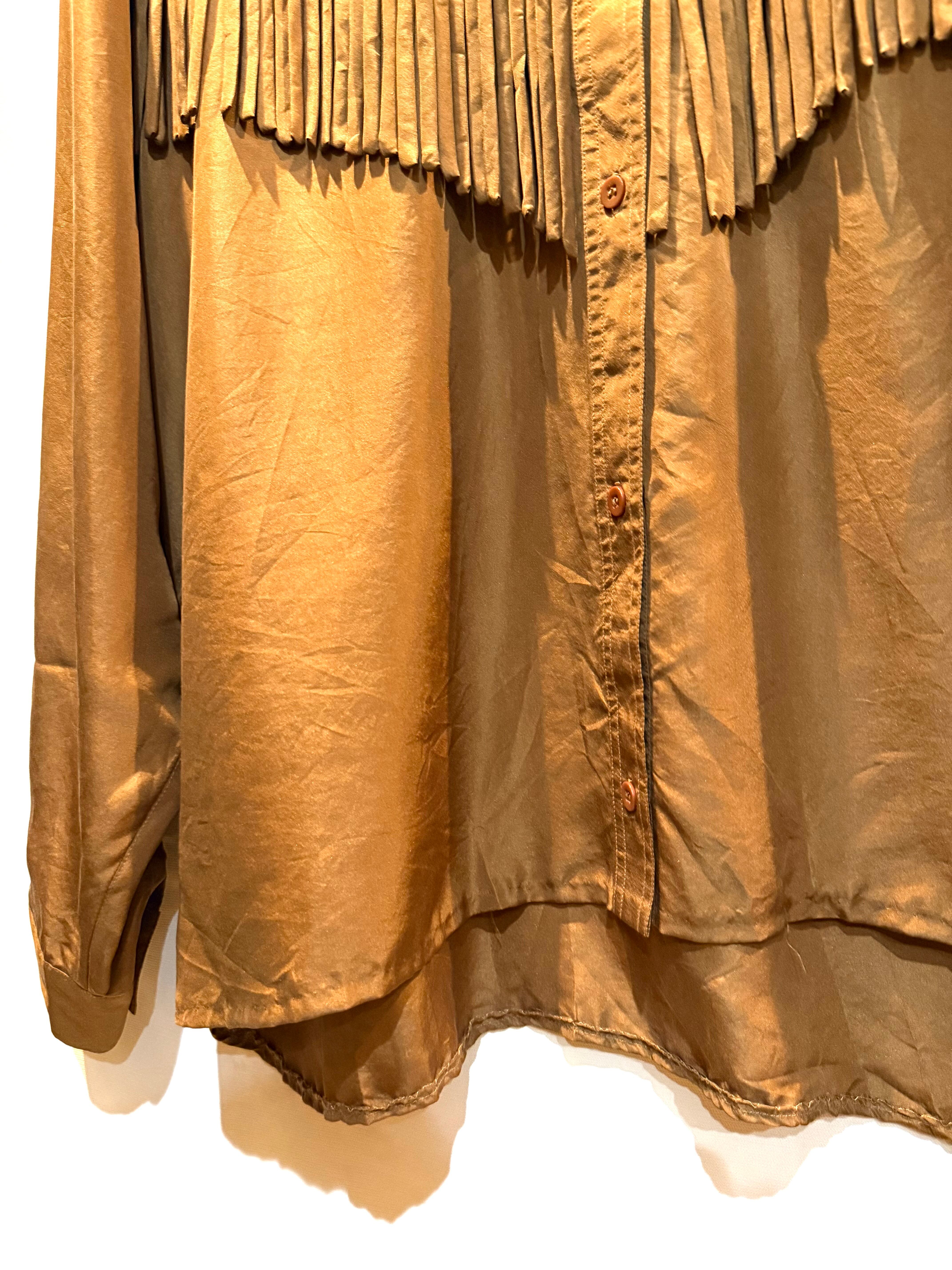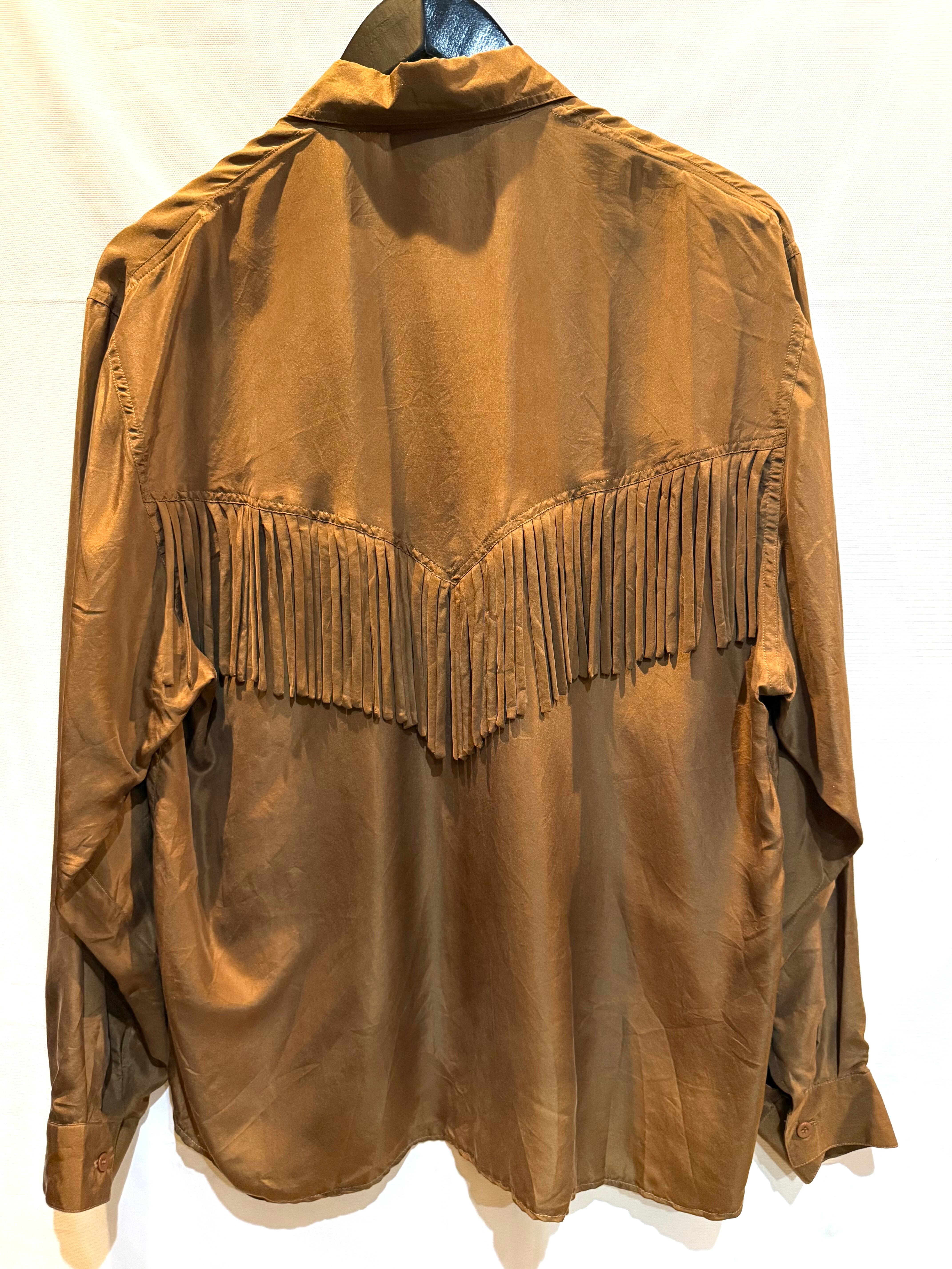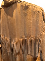 80年代のシルクウェスタンシャツです。フロント・バックにフリンジがあります。ブラウンカラーなので、フリンジはありますが、全体的に落ち着いた雰囲気に思えます。重宝しそうな1枚ですので是非いかがですか。