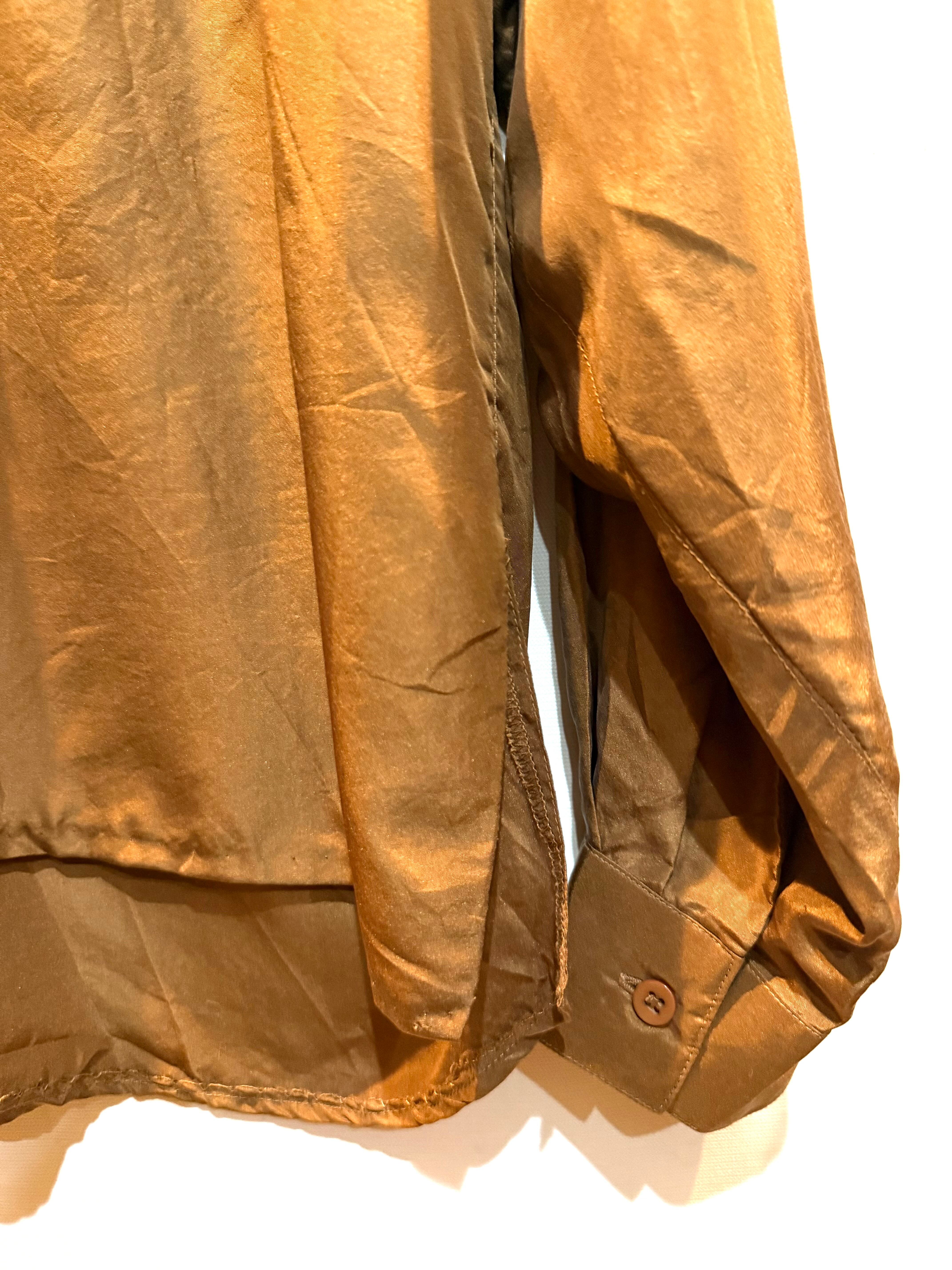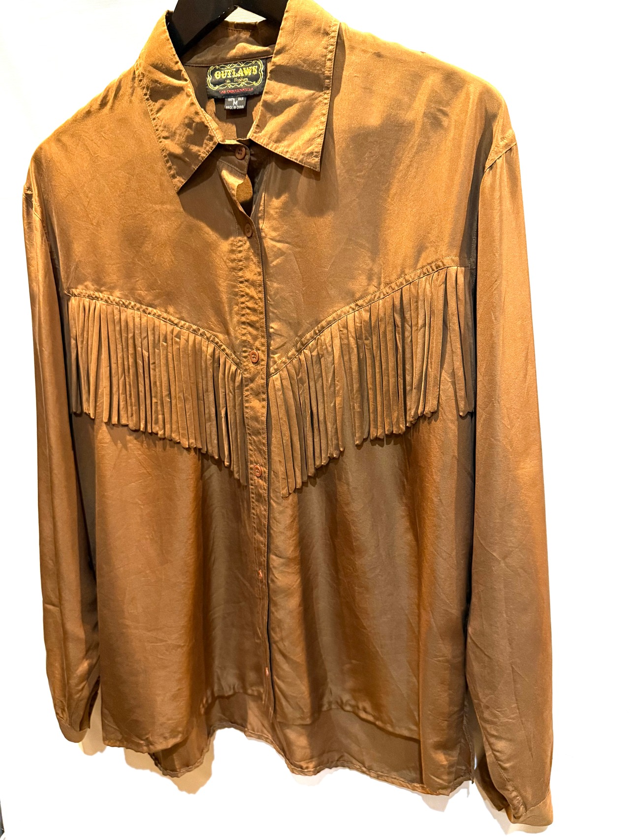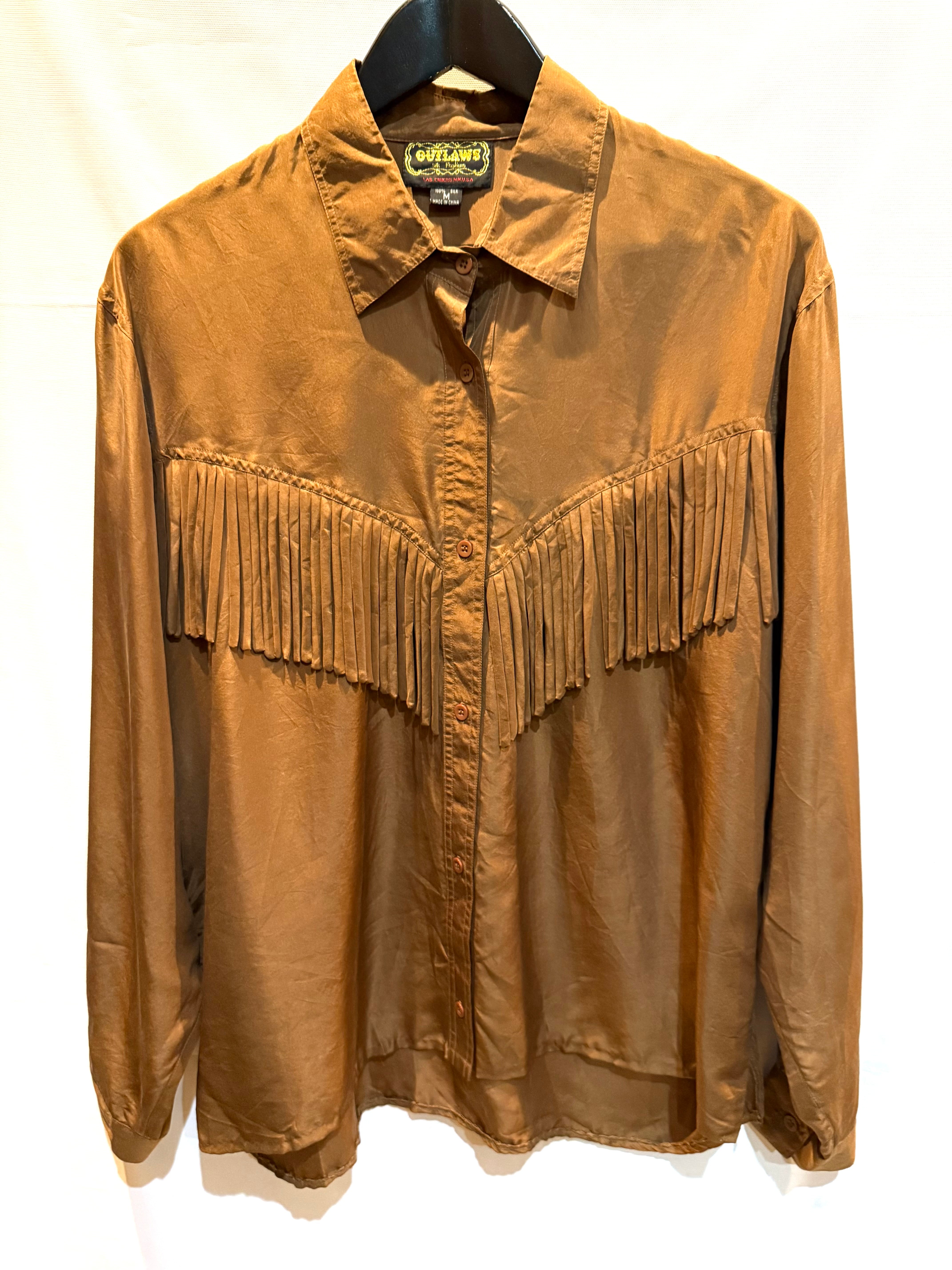 80年代のシルクウェスタンシャツです。フロント・バックにフリンジがあります。ブラウンカラーなので、フリンジはありますが、全体的に落ち着いた雰囲気に思えます。重宝しそうな1枚ですので是非いかがですか。