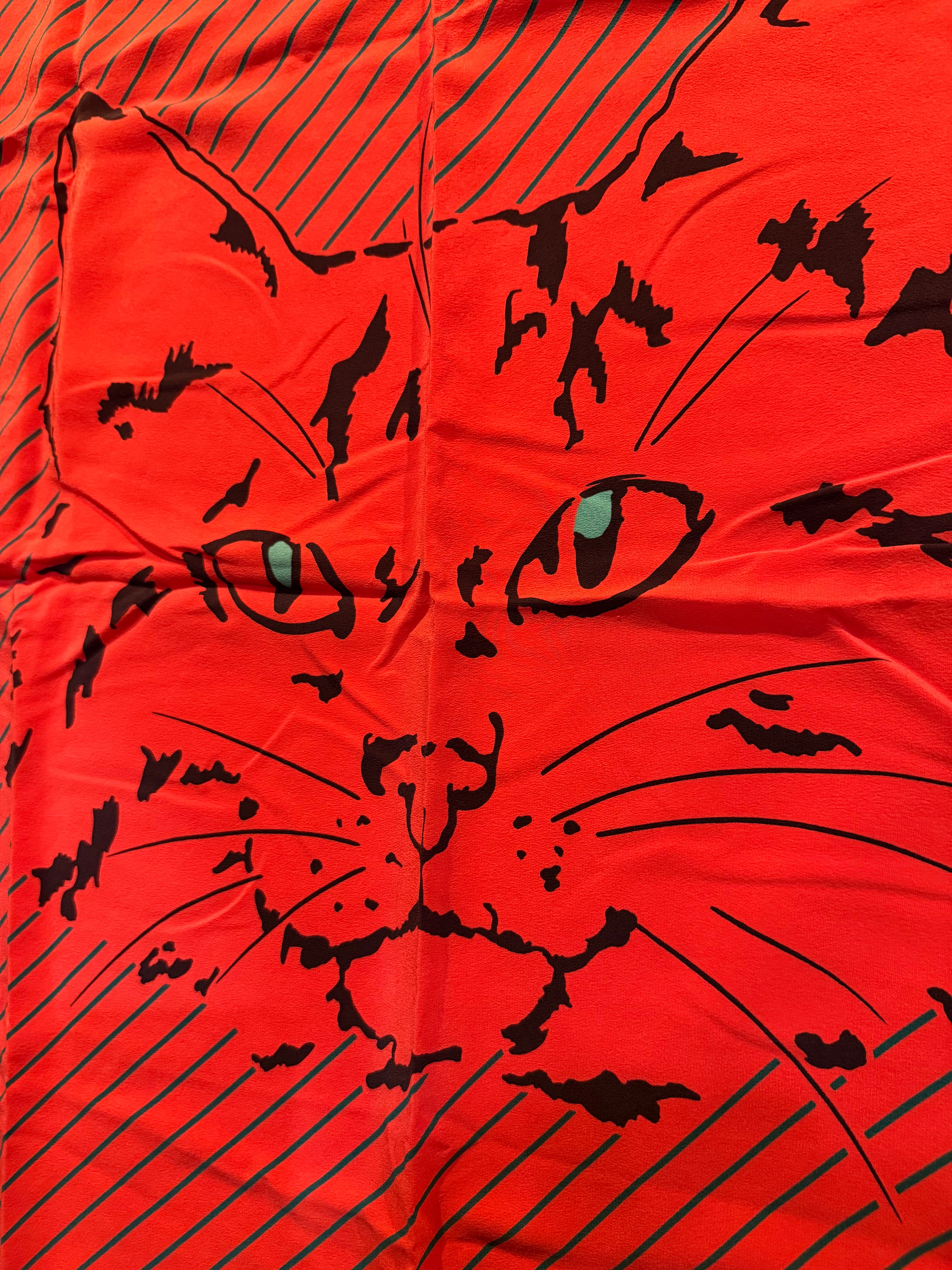 キャット柄の大判スカーフです。90年代頃のものになります。ミラノ発のブランドで、野生動物モチーフを得意としています。表示ありませんが、Silk100%だと思います。サイズも大きく、首元に巻いたり、飾っておくのもインパクトがあってオススメです。是非。