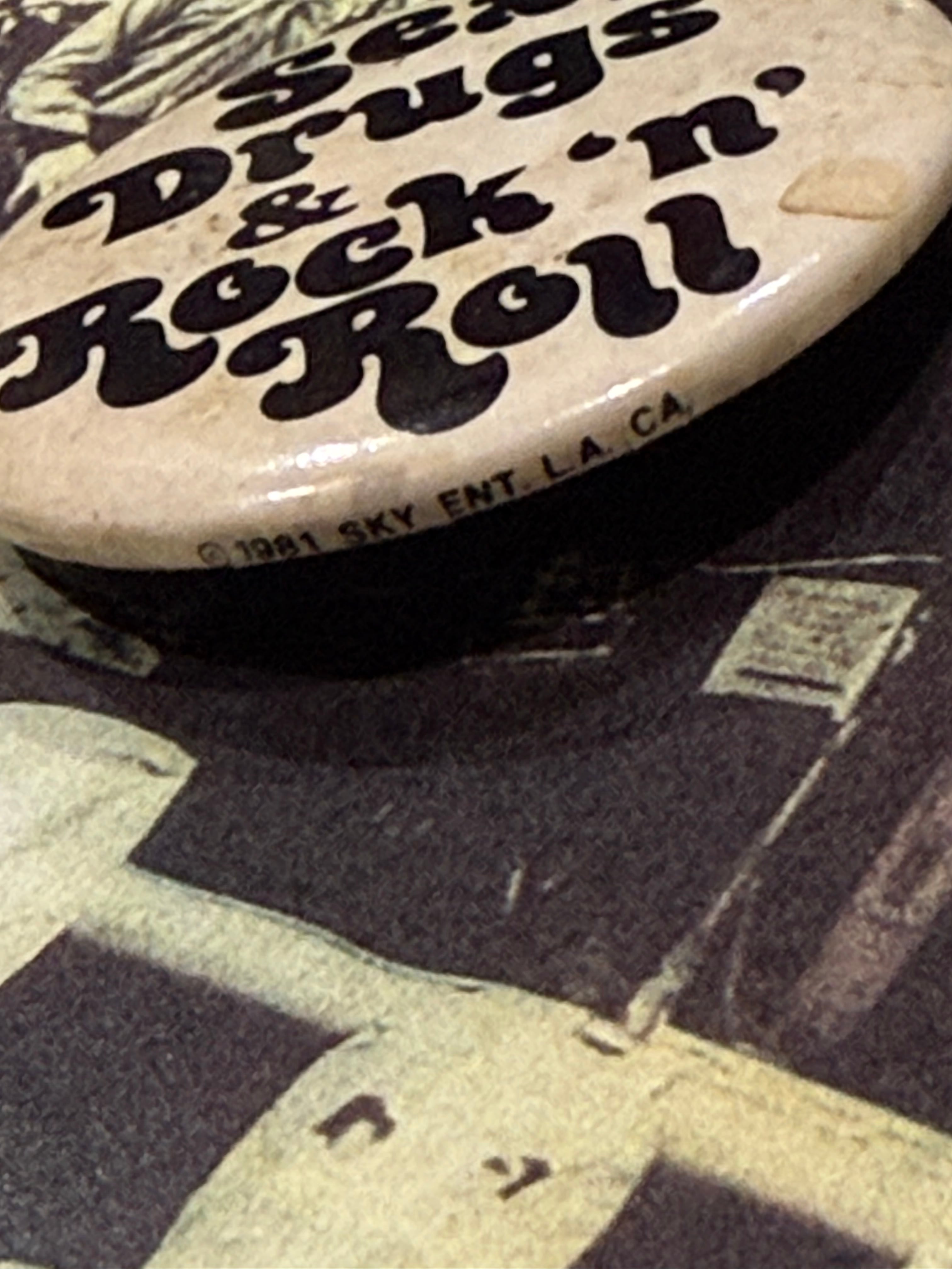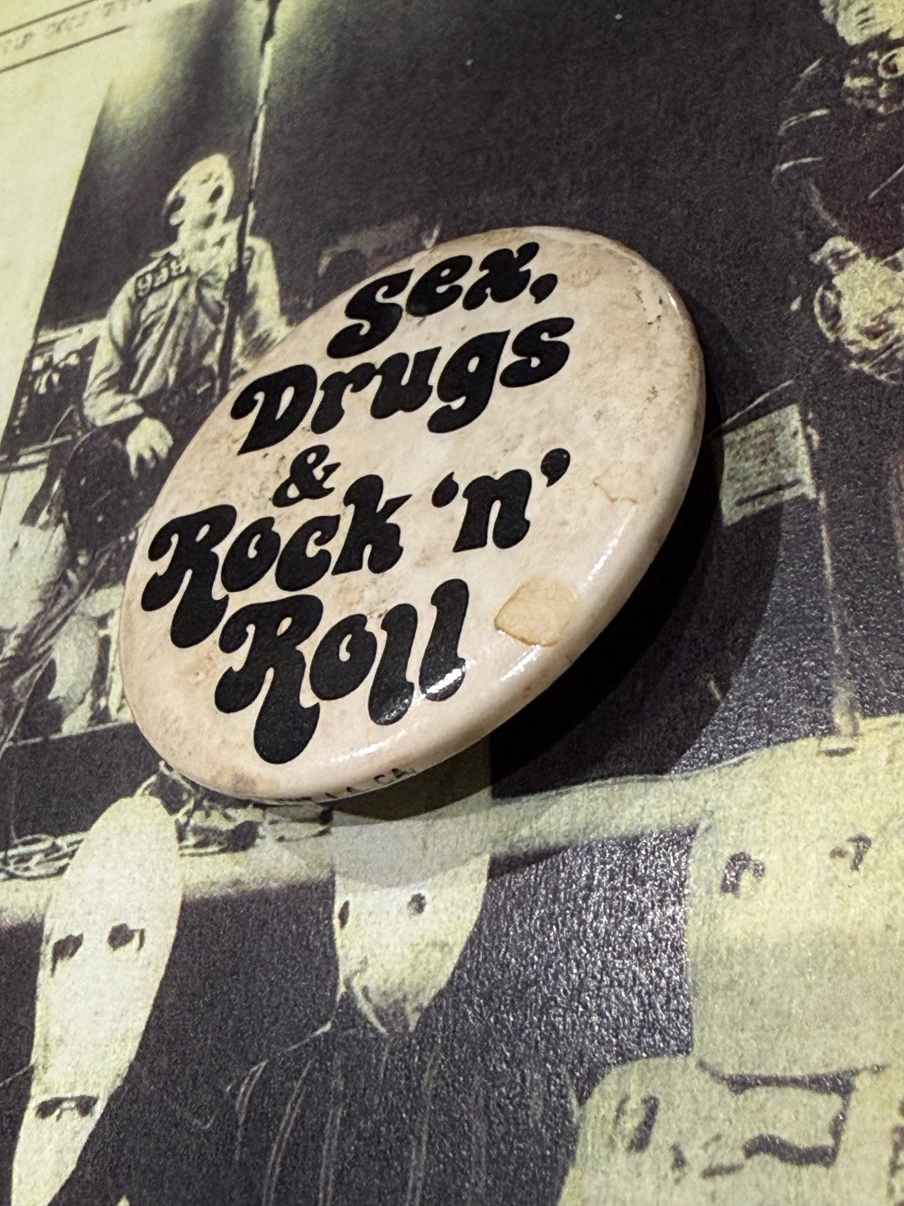ロックンロールのライフスタイルを形容する言葉として有名な、Sex、Drugs&Rock’nRollのバッジです。貴重な当時モノでビッグサイズ。デザインもカッコイイのでオススメです。