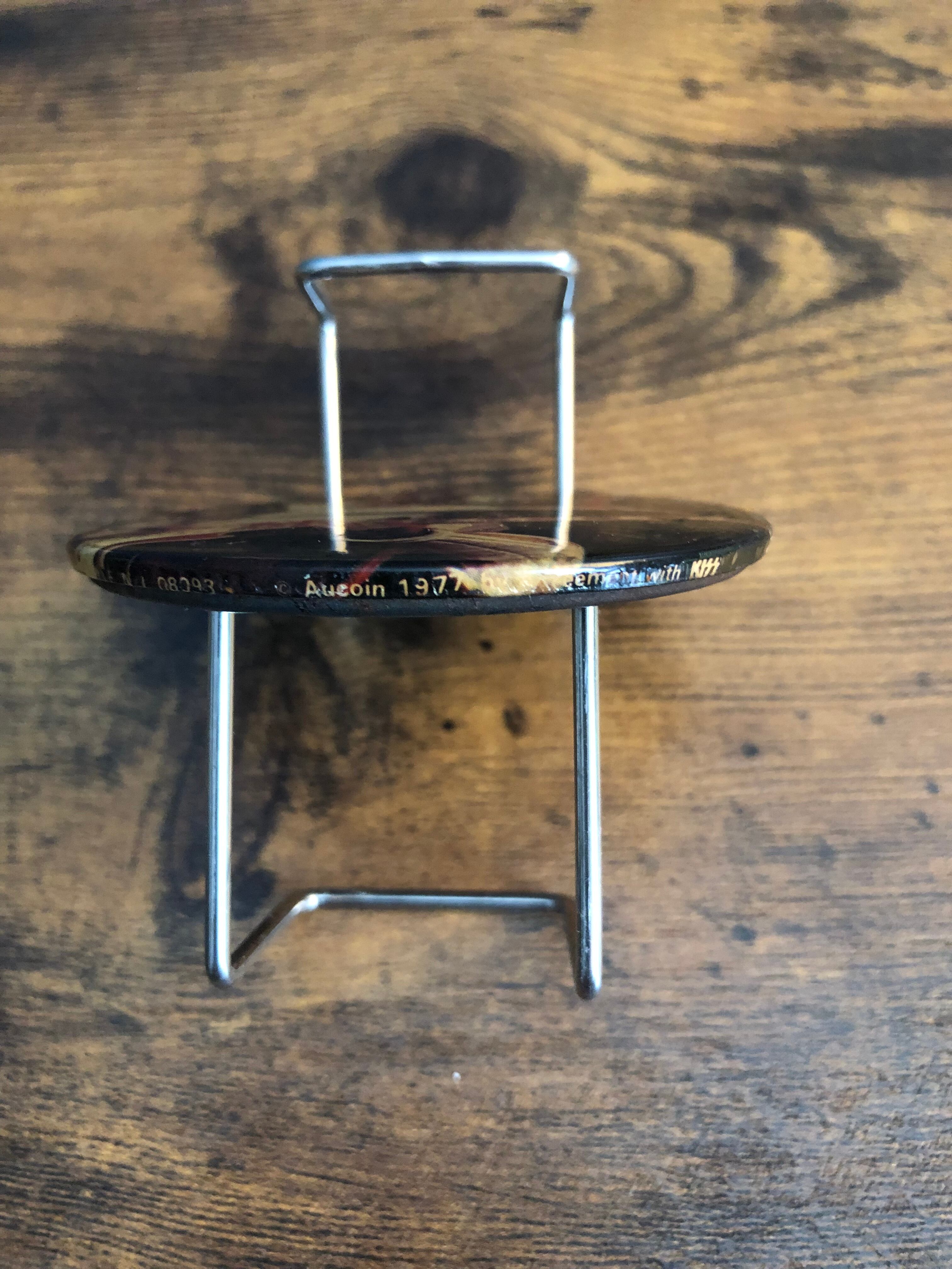 KISSの初代ギタリスト、エースフレーリーの缶バッジ。歴代のキッスのギタリストの中でも存在感はピカイチです。ビッグサイズの缶バッジです。コピーライトは1977年とあります(写真参照)。キッスは1973年からなので、かなり初期のものになります。裏面は錆びていますが、使用するのには問題ありません。