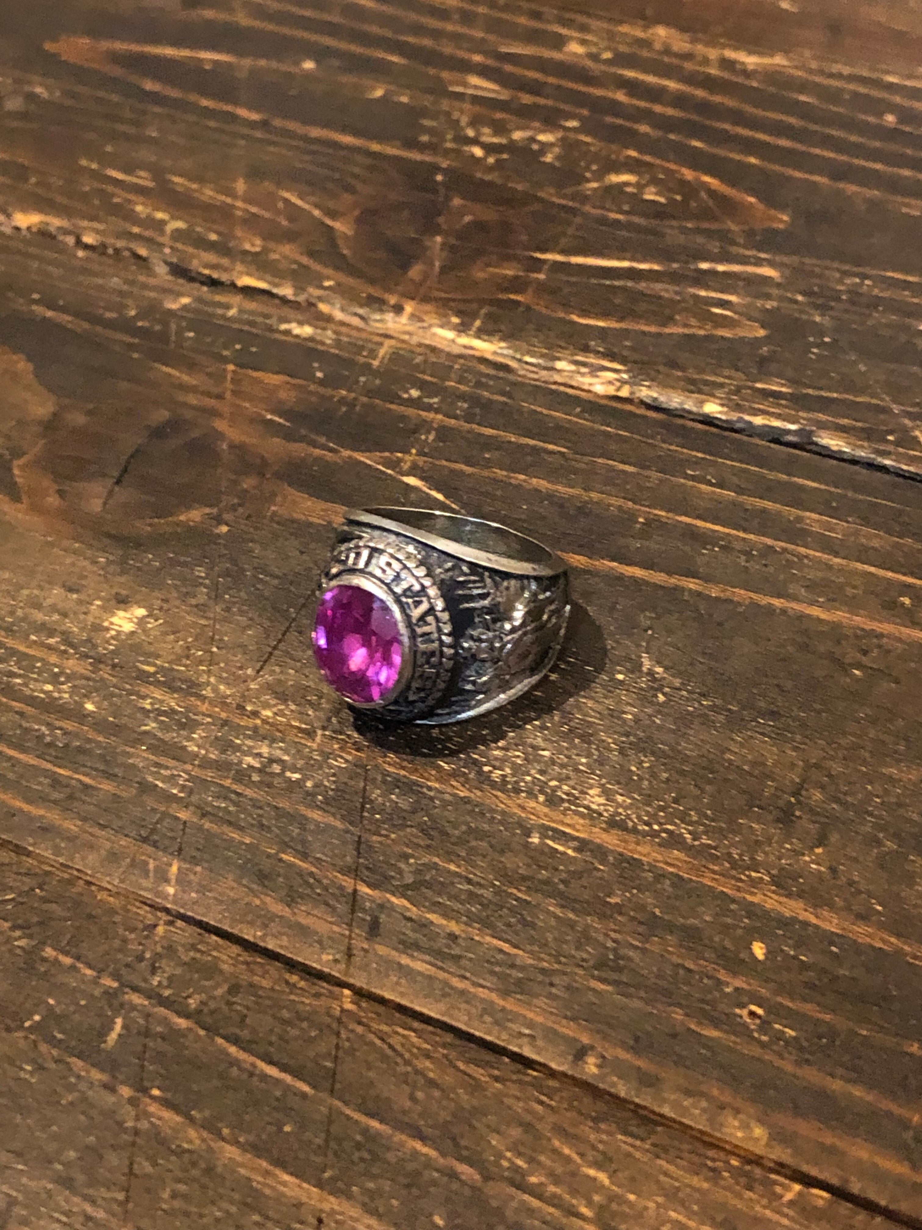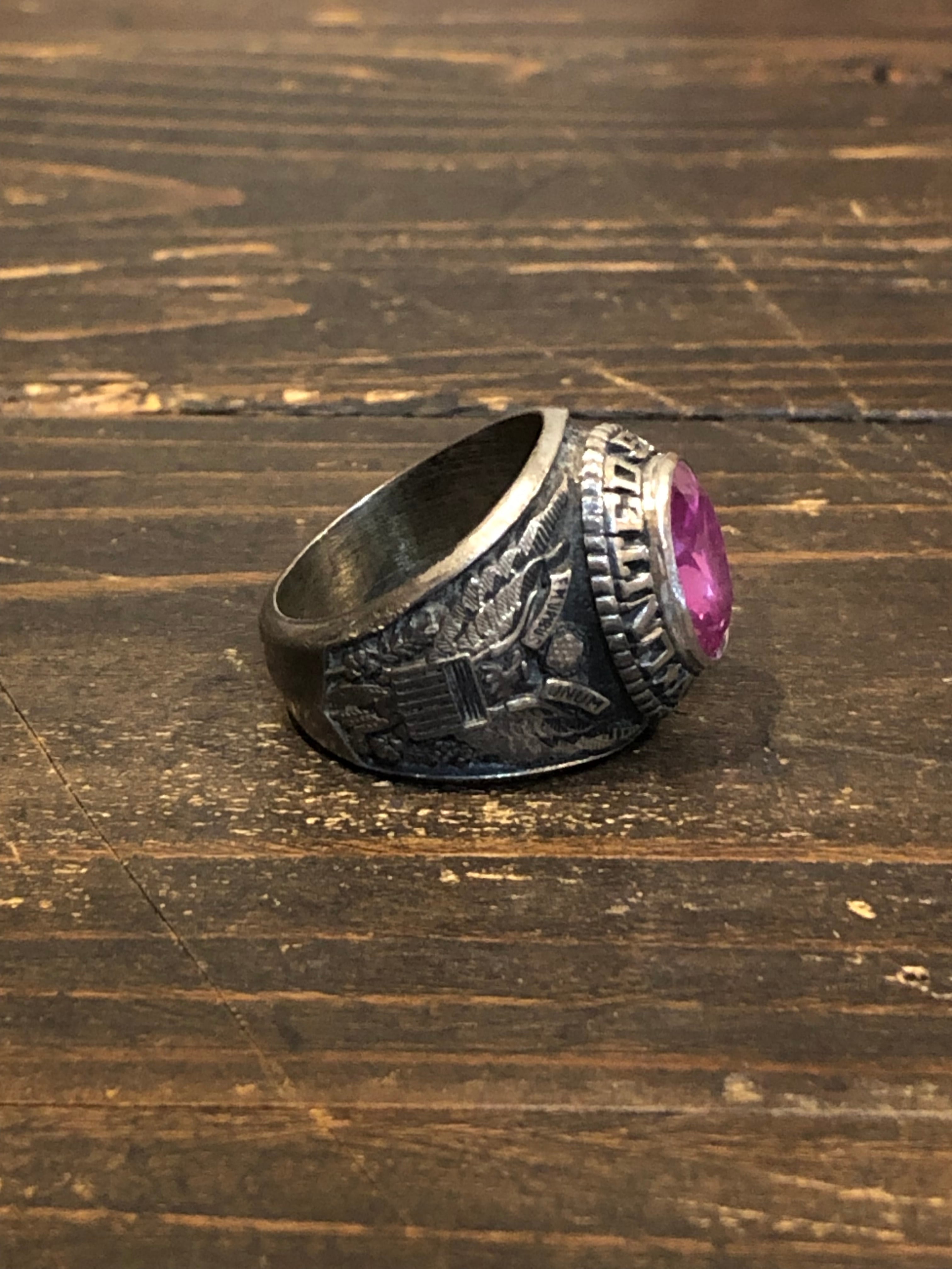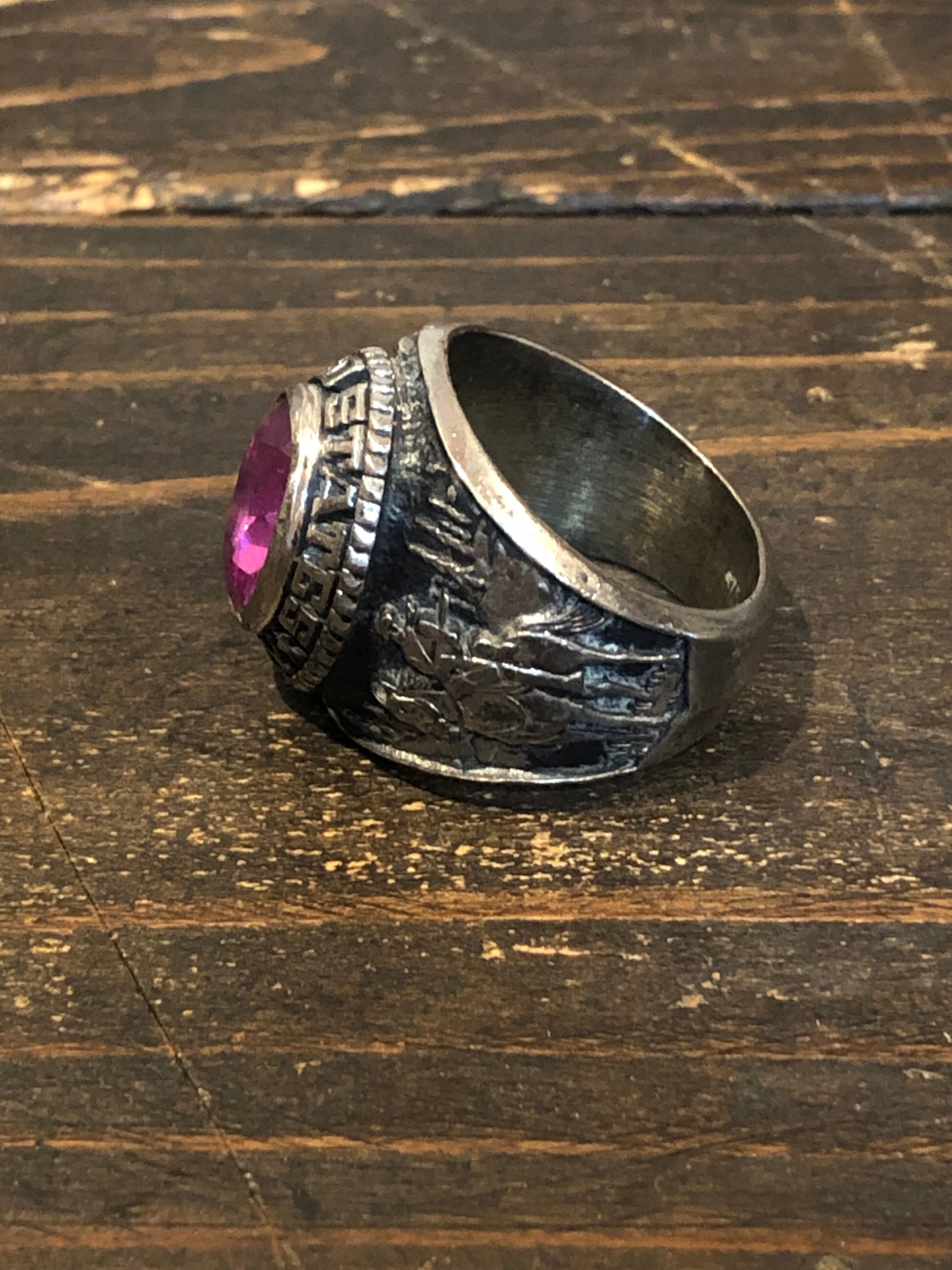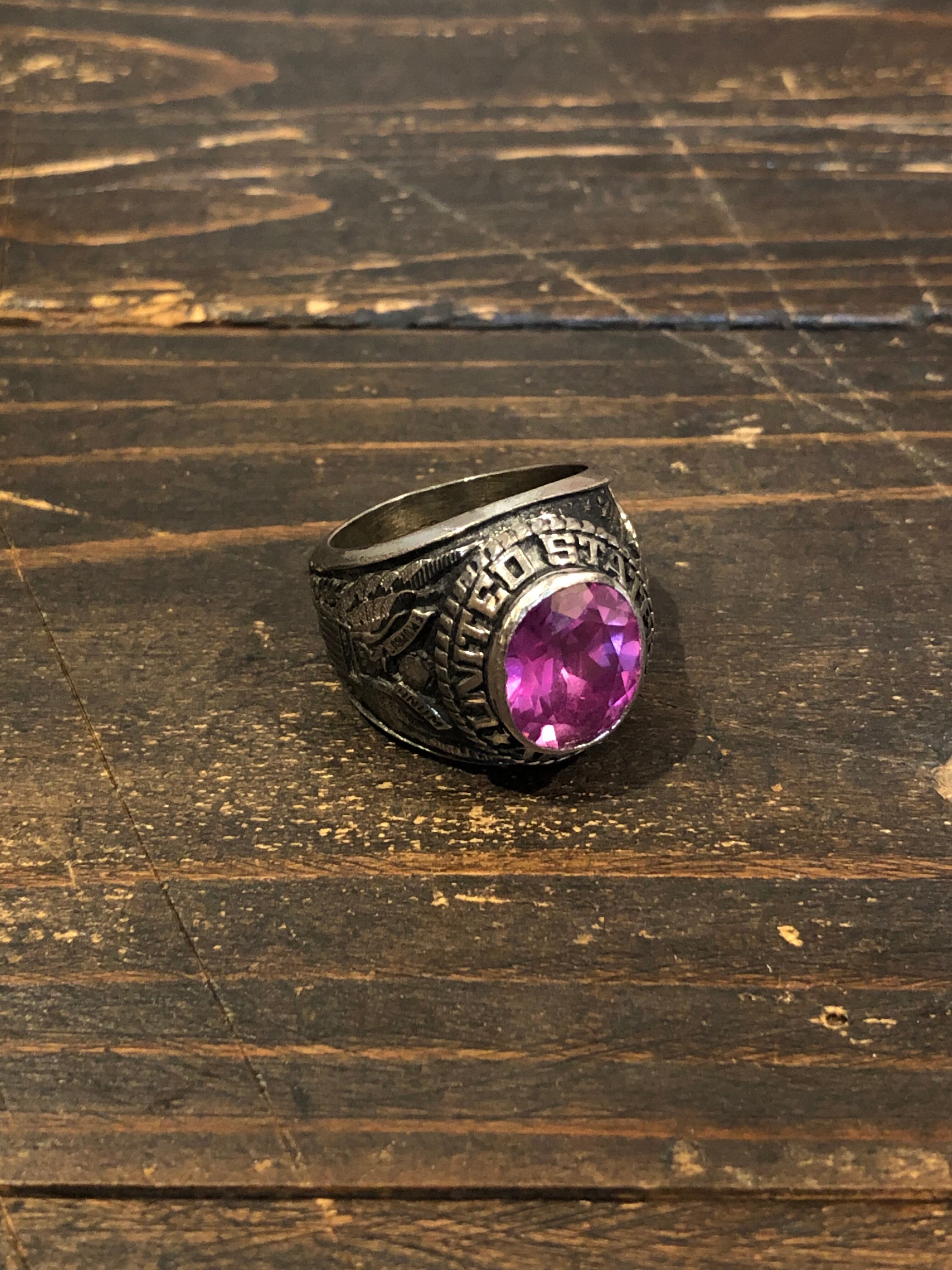 アメリカ製ヴィンテージのUS.ARMYミリタリーリングです。フロントの石がピンクというのが非常に珍しいです。サイドはアメリカ合衆国の国家紋章の白頭ワシとカウボーイになります。内側にSTERと刻印があります。(スターリングシルバーの最初の部分かと)気に入るものに巡り合うのが難しいヴィンテージリングですが、このピンクはおススメですので是非、ご検討ください。