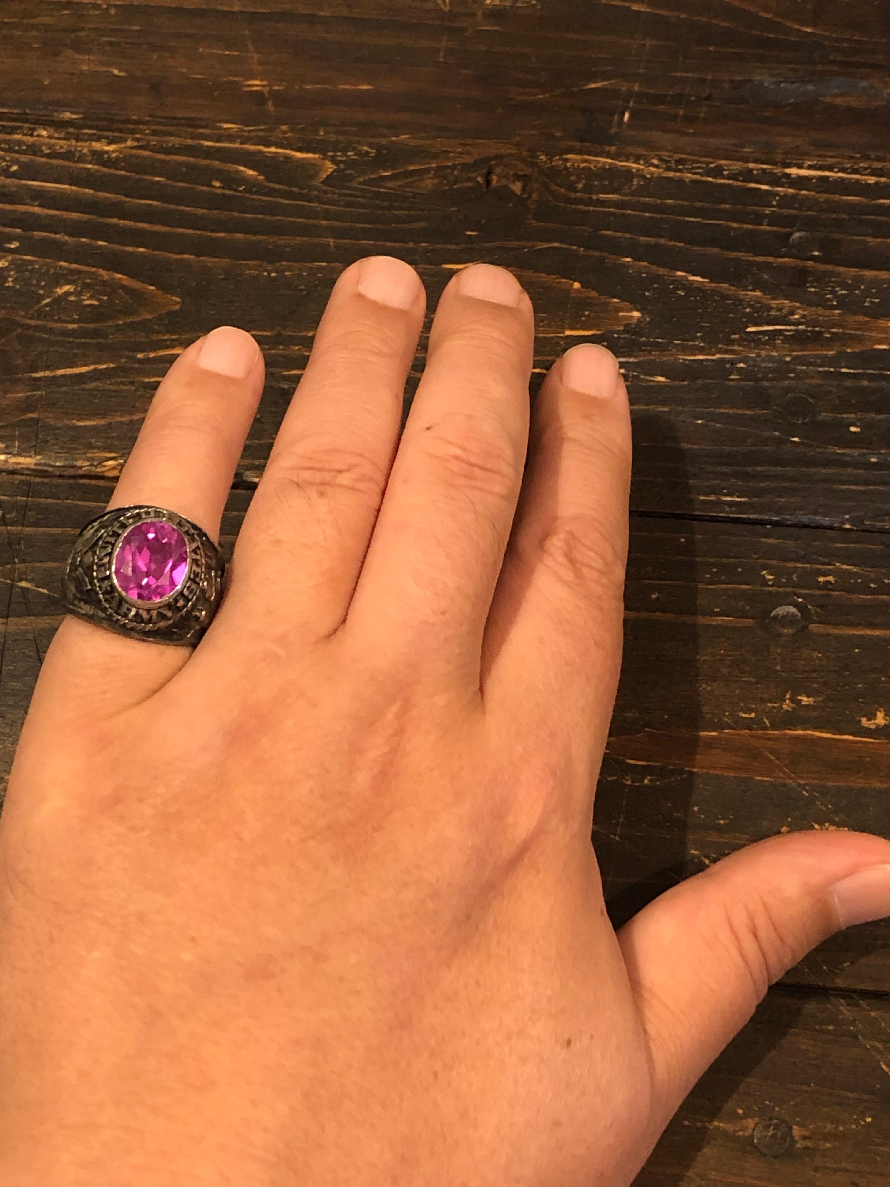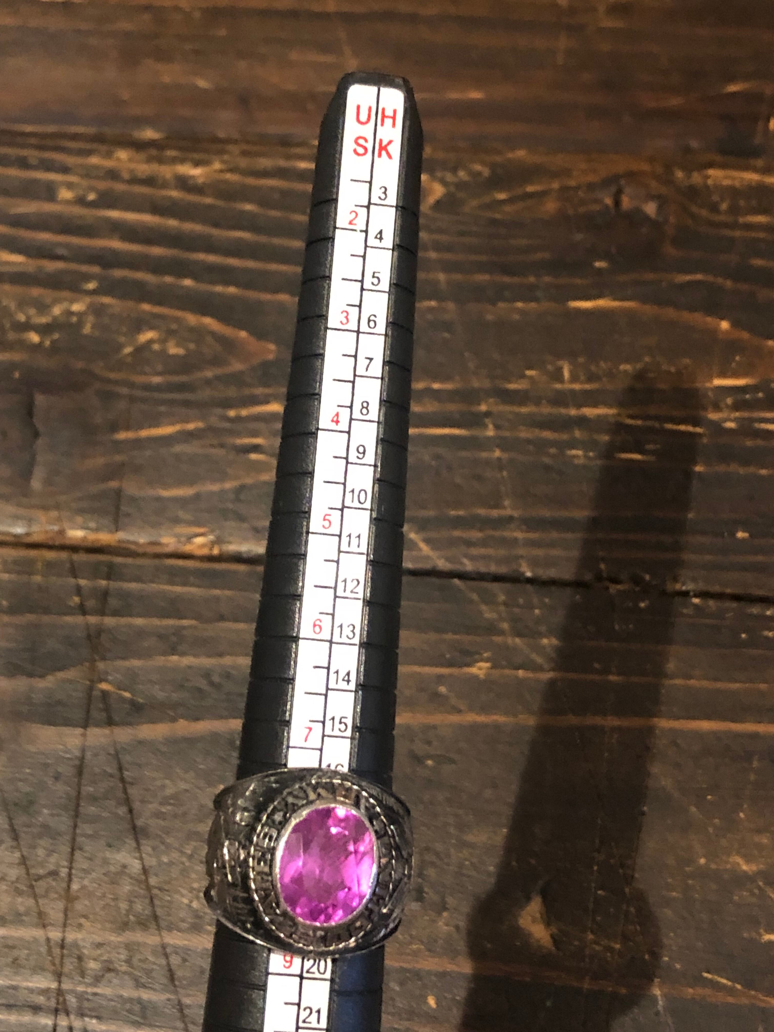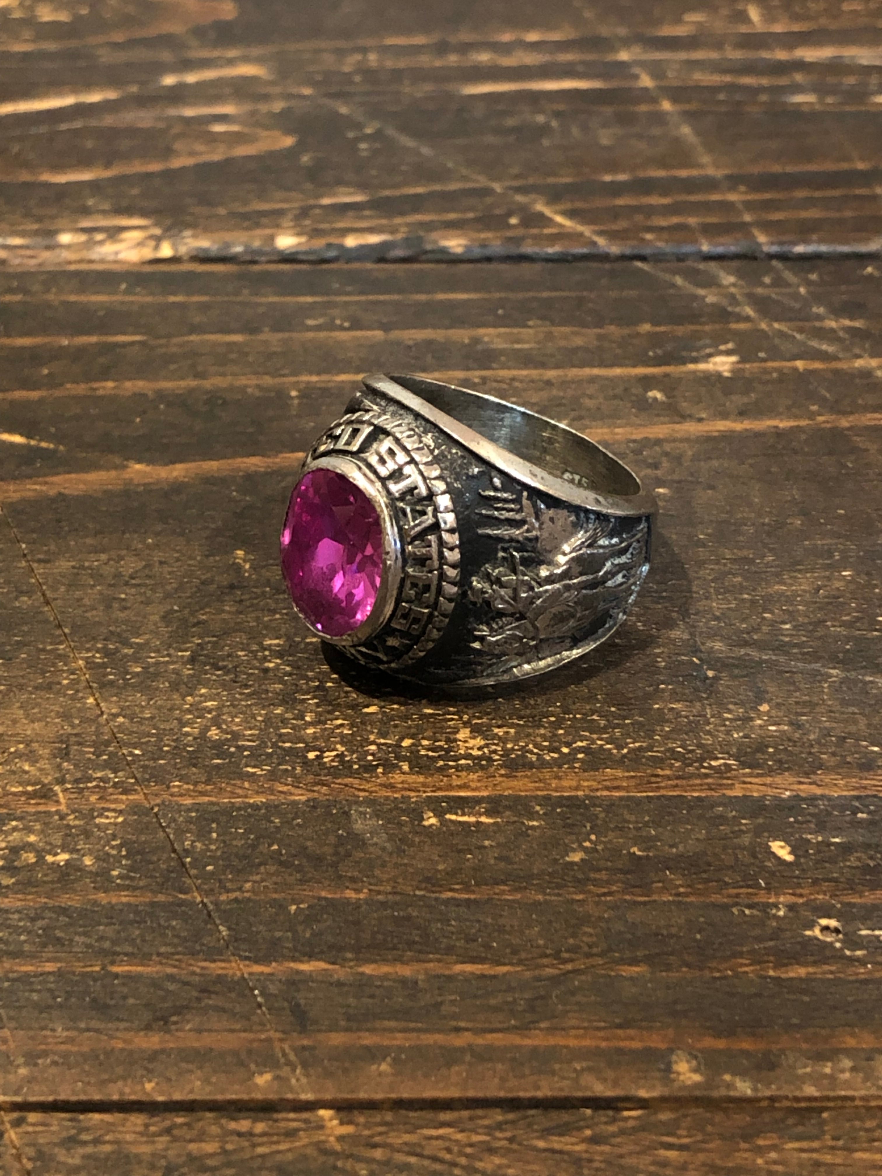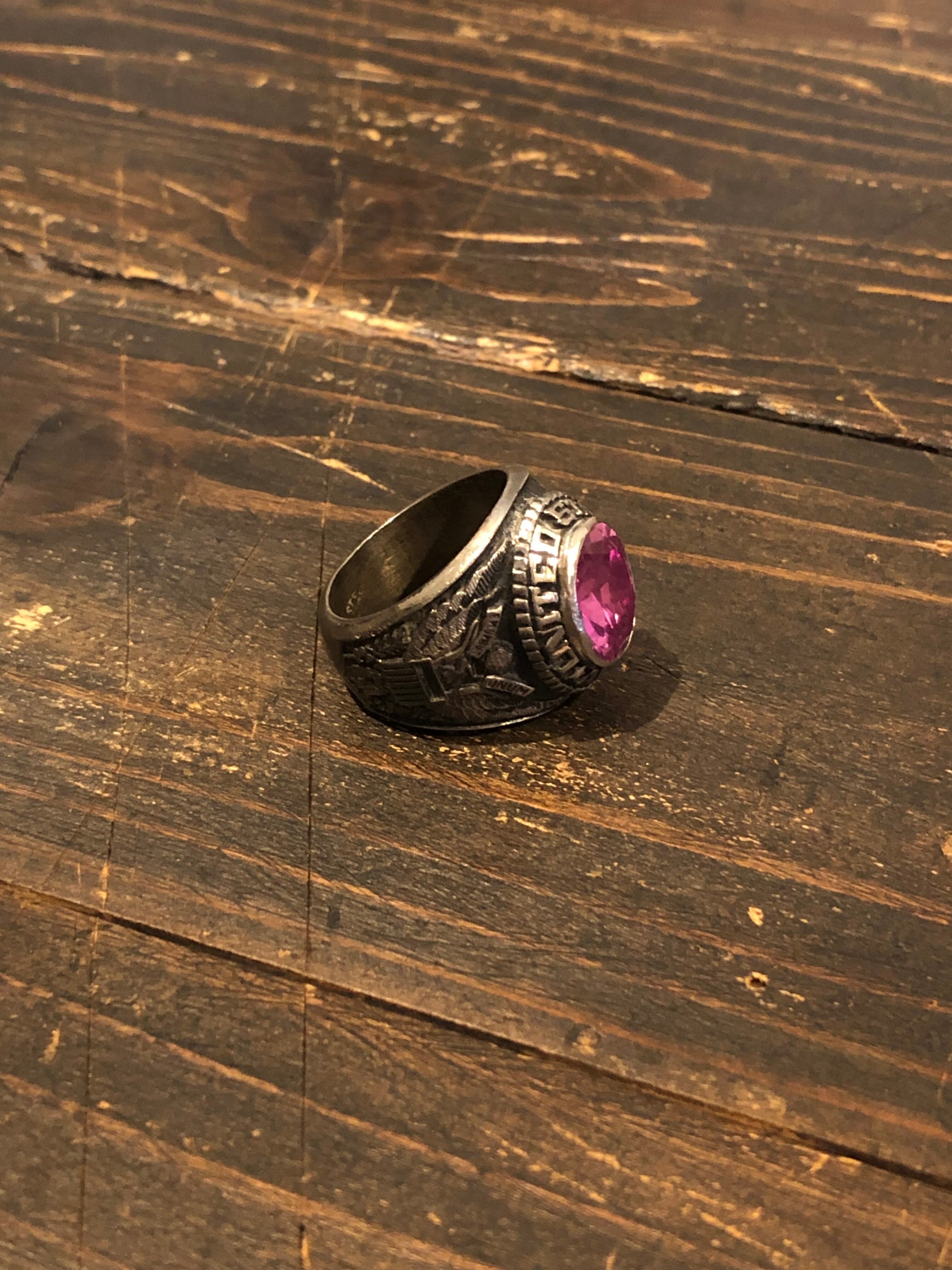 アメリカ製ヴィンテージのUS.ARMYミリタリーリングです。フロントの石がピンクというのが非常に珍しいです。サイドはアメリカ合衆国の国家紋章の白頭ワシとカウボーイになります。内側にSTERと刻印があります。(スターリングシルバーの最初の部分かと)気に入るものに巡り合うのが難しいヴィンテージリングですが、このピンクはおススメですので是非、ご検討ください。