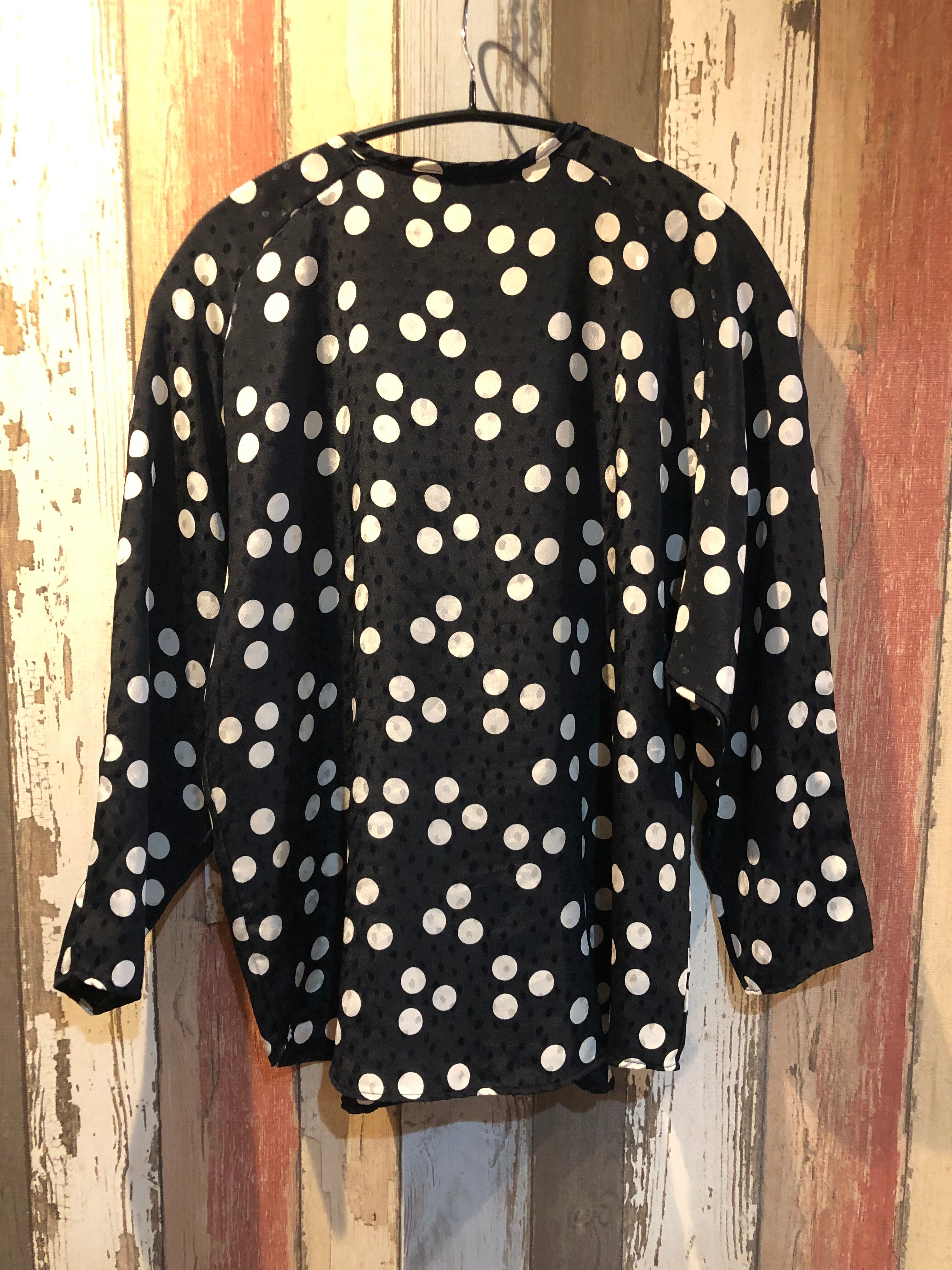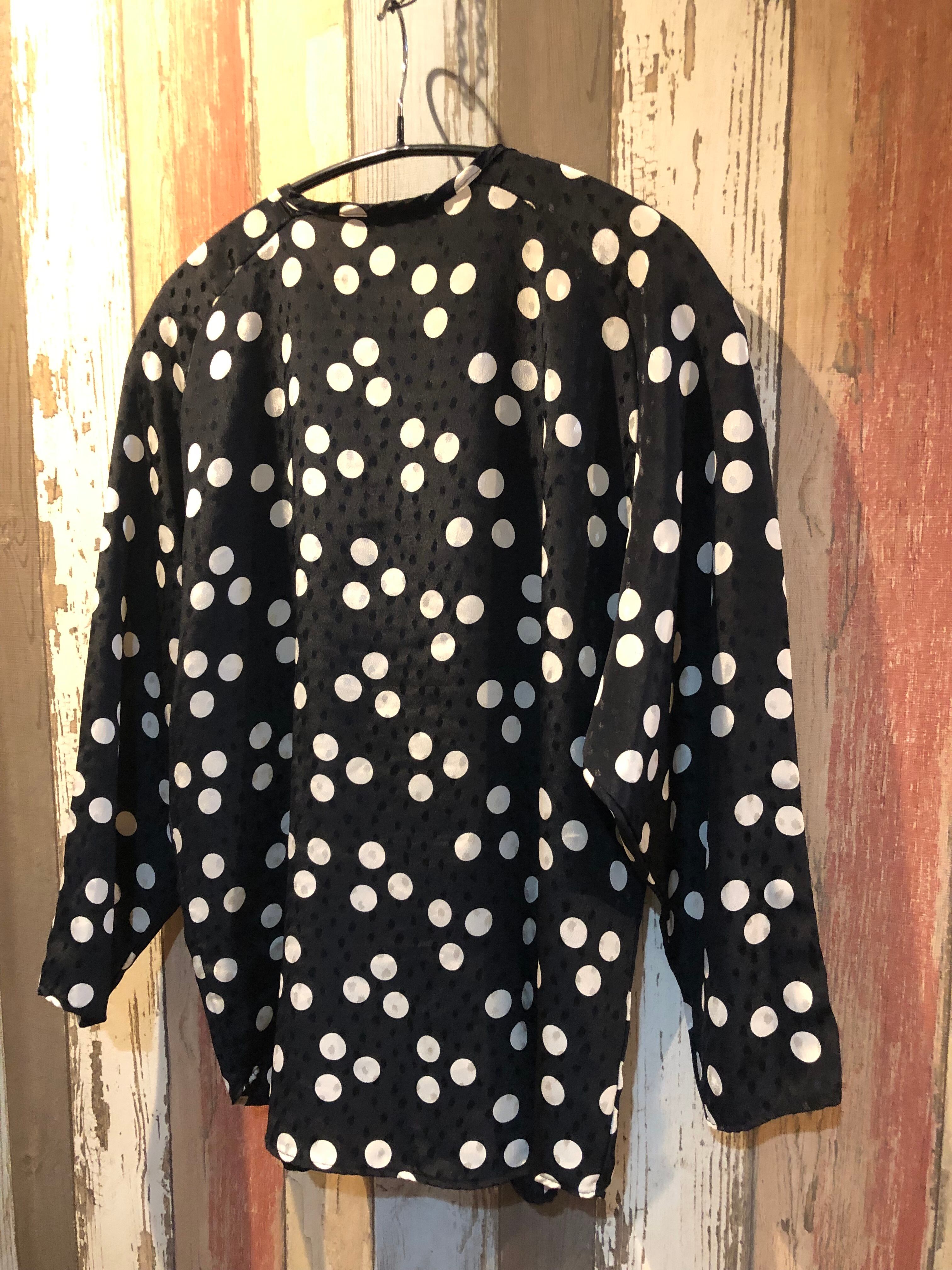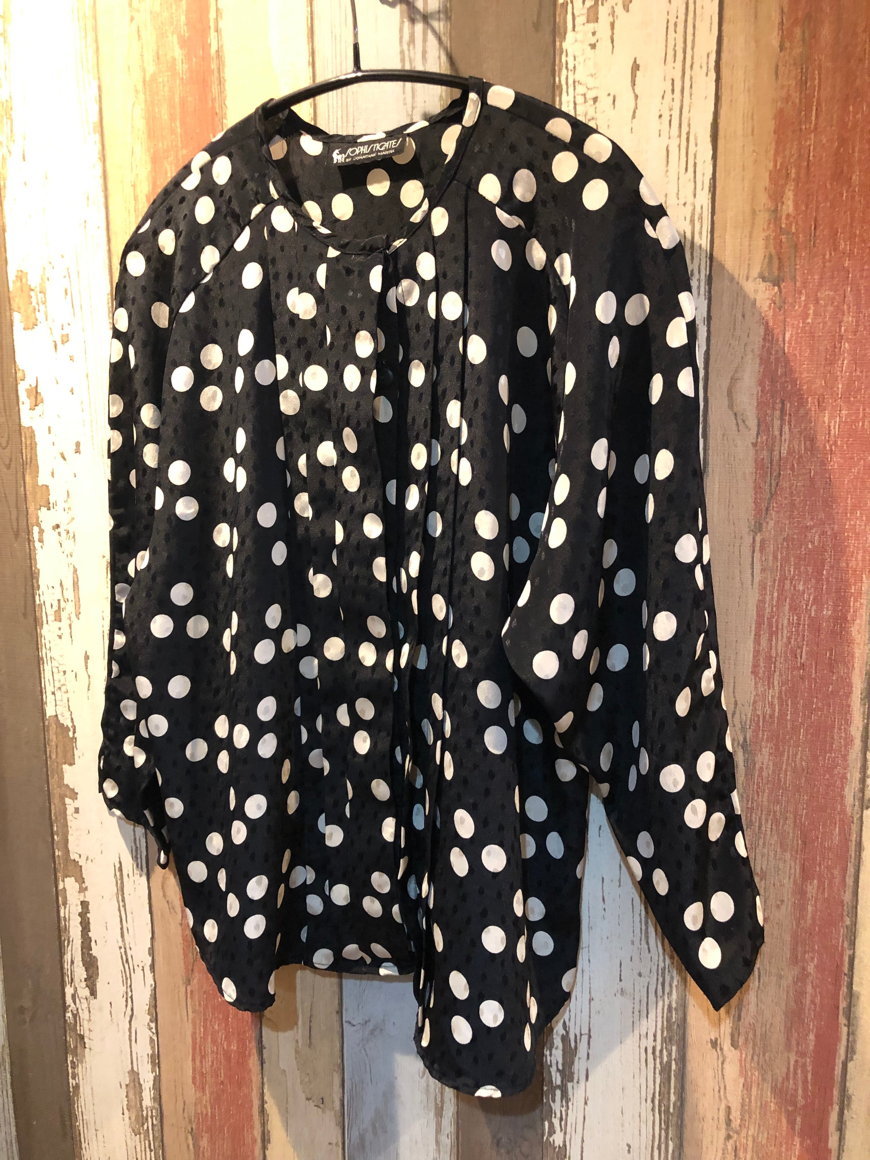 ドット柄のポリエステルシャツです。80年代頃のアメリカのブランドのもので、大振りで幾何学的な配置が特徴の水玉です。フロントはボタンで、プリーツで隠れるようなデザインになっています。生地もしっかりしていて、透け感もありません。おススメです。