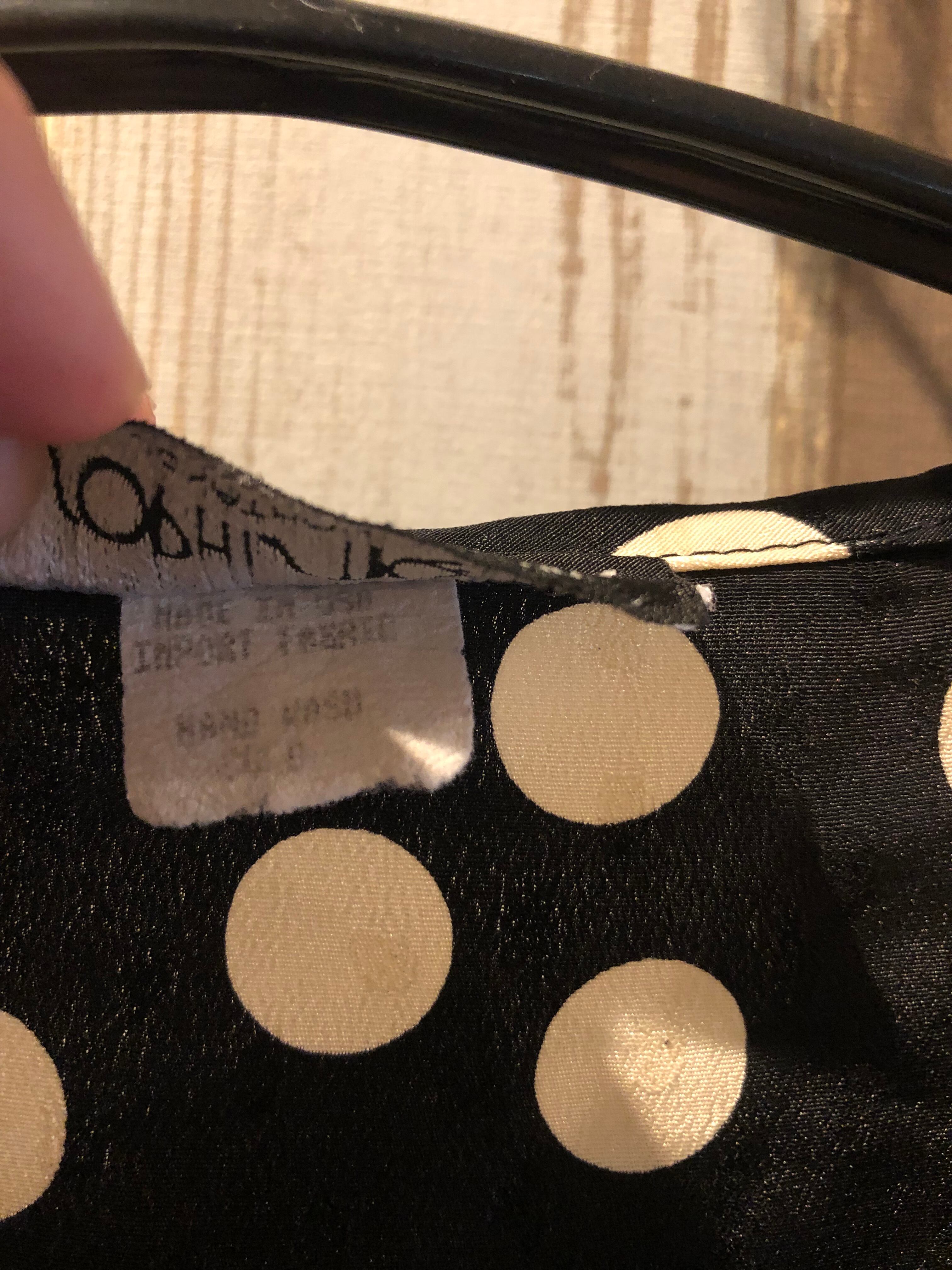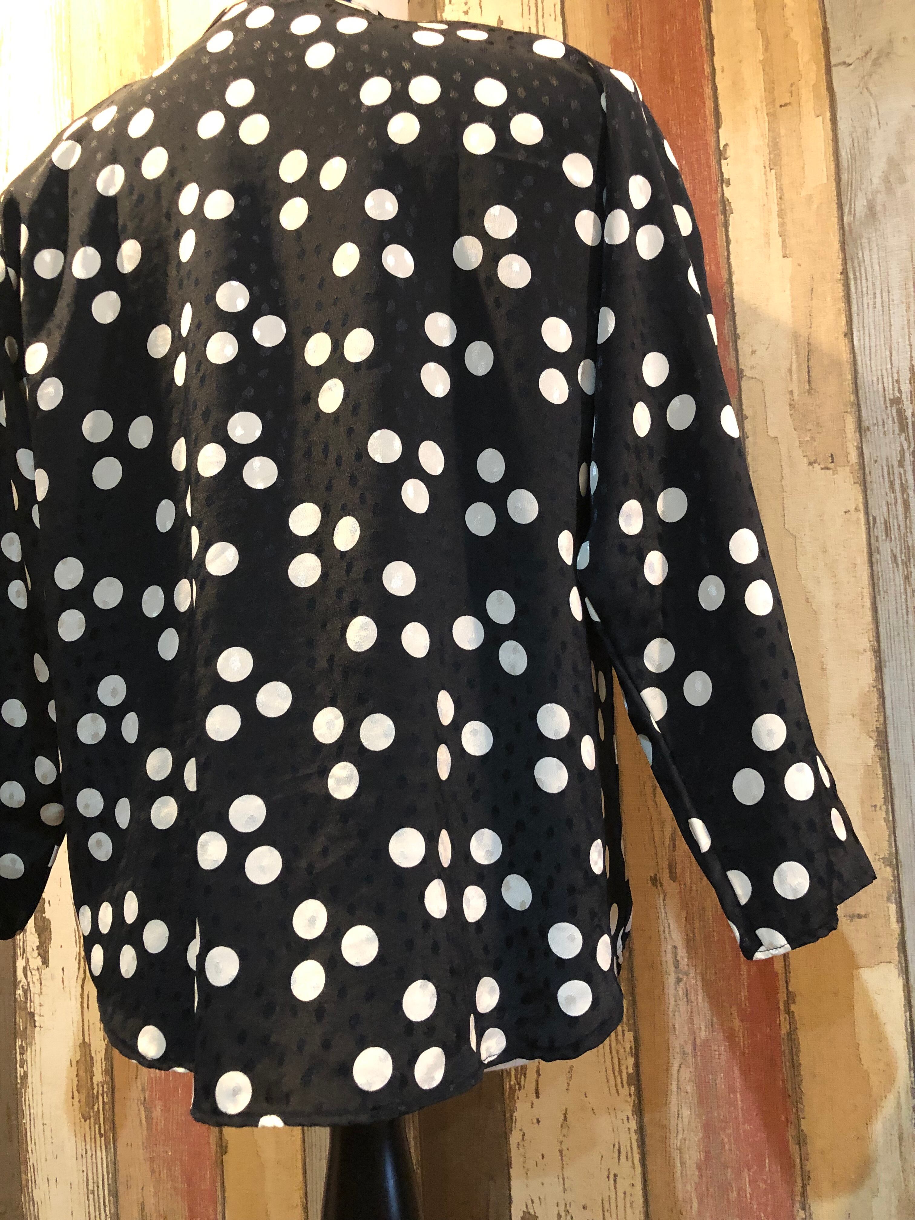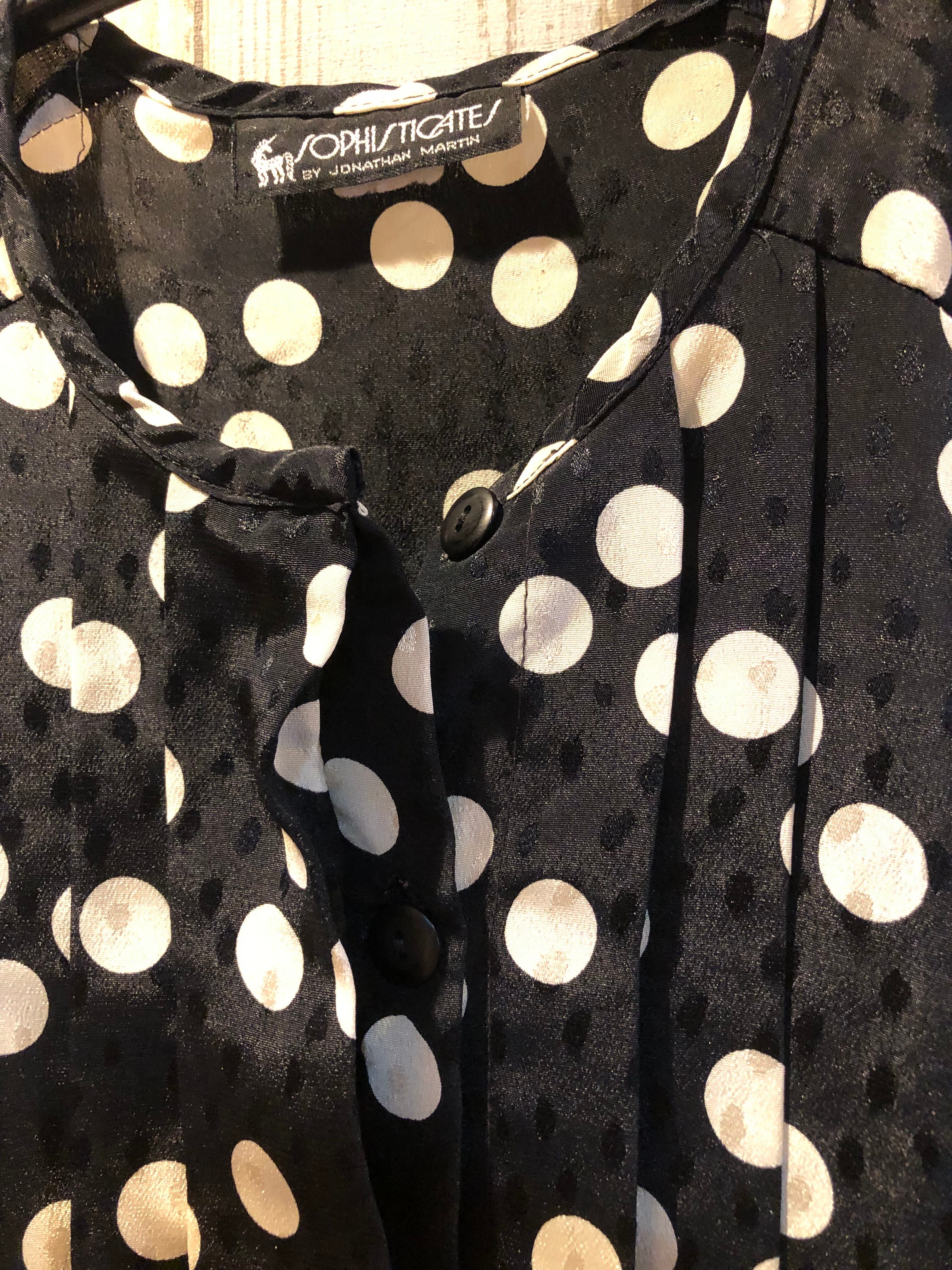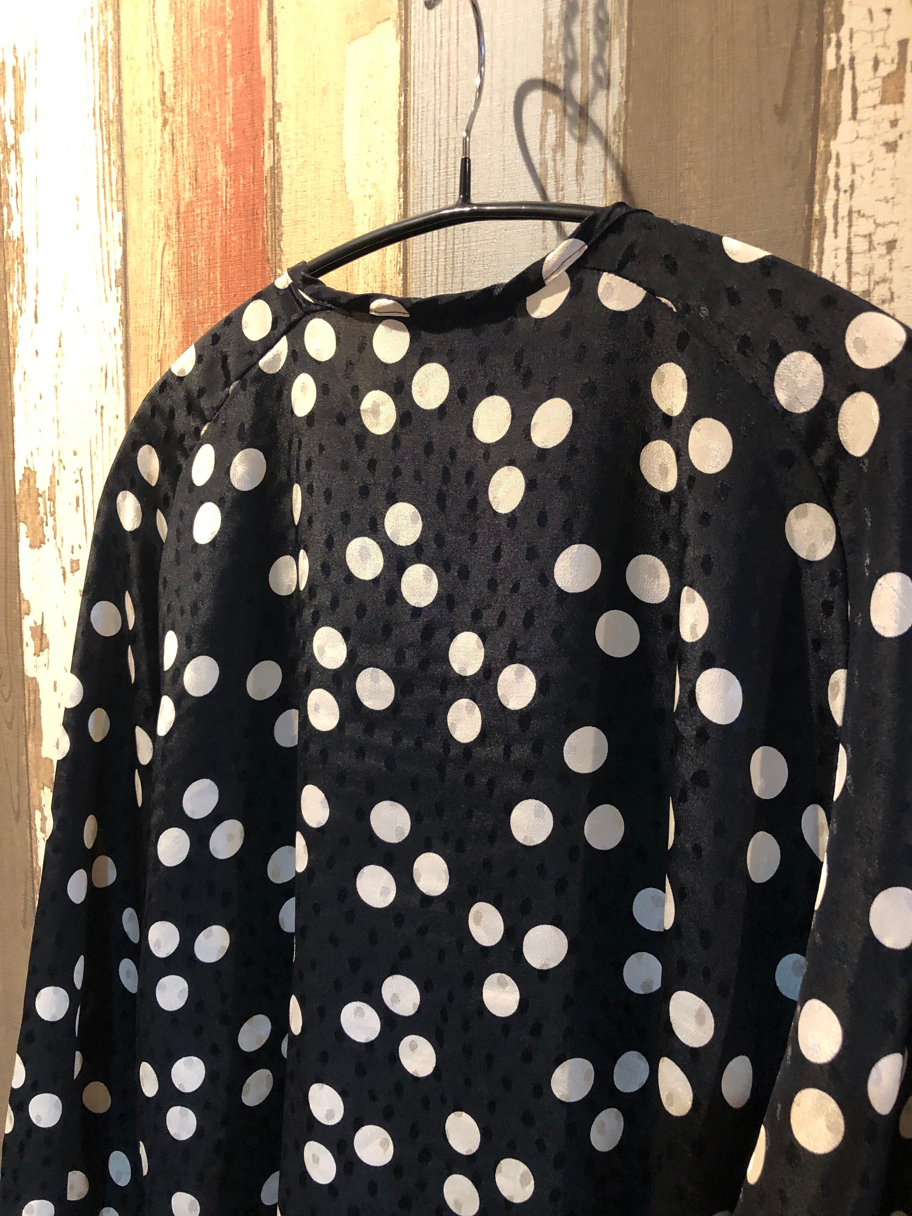 ドット柄のポリエステルシャツです。80年代頃のアメリカのブランドのもので、大振りで幾何学的な配置が特徴の水玉です。フロントはボタンで、プリーツで隠れるようなデザインになっています。生地もしっかりしていて、透け感もありません。おススメです。