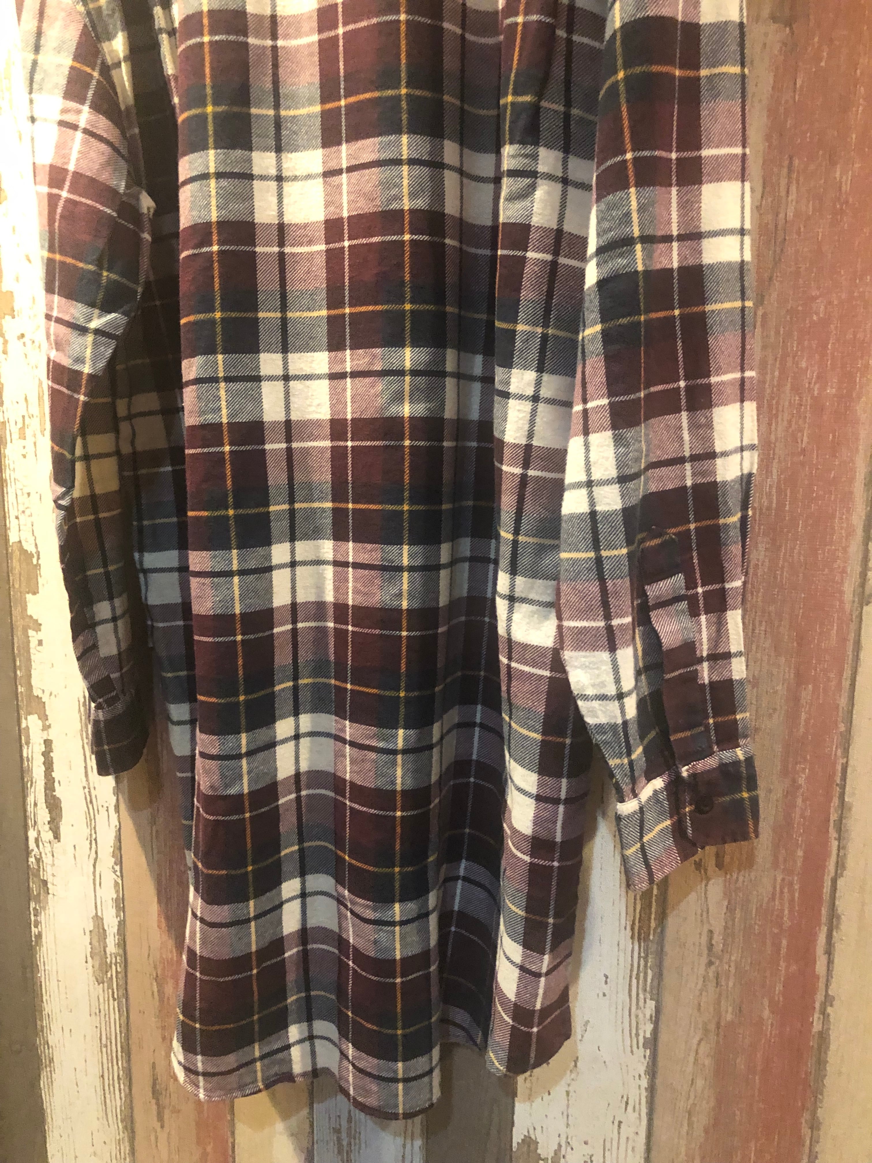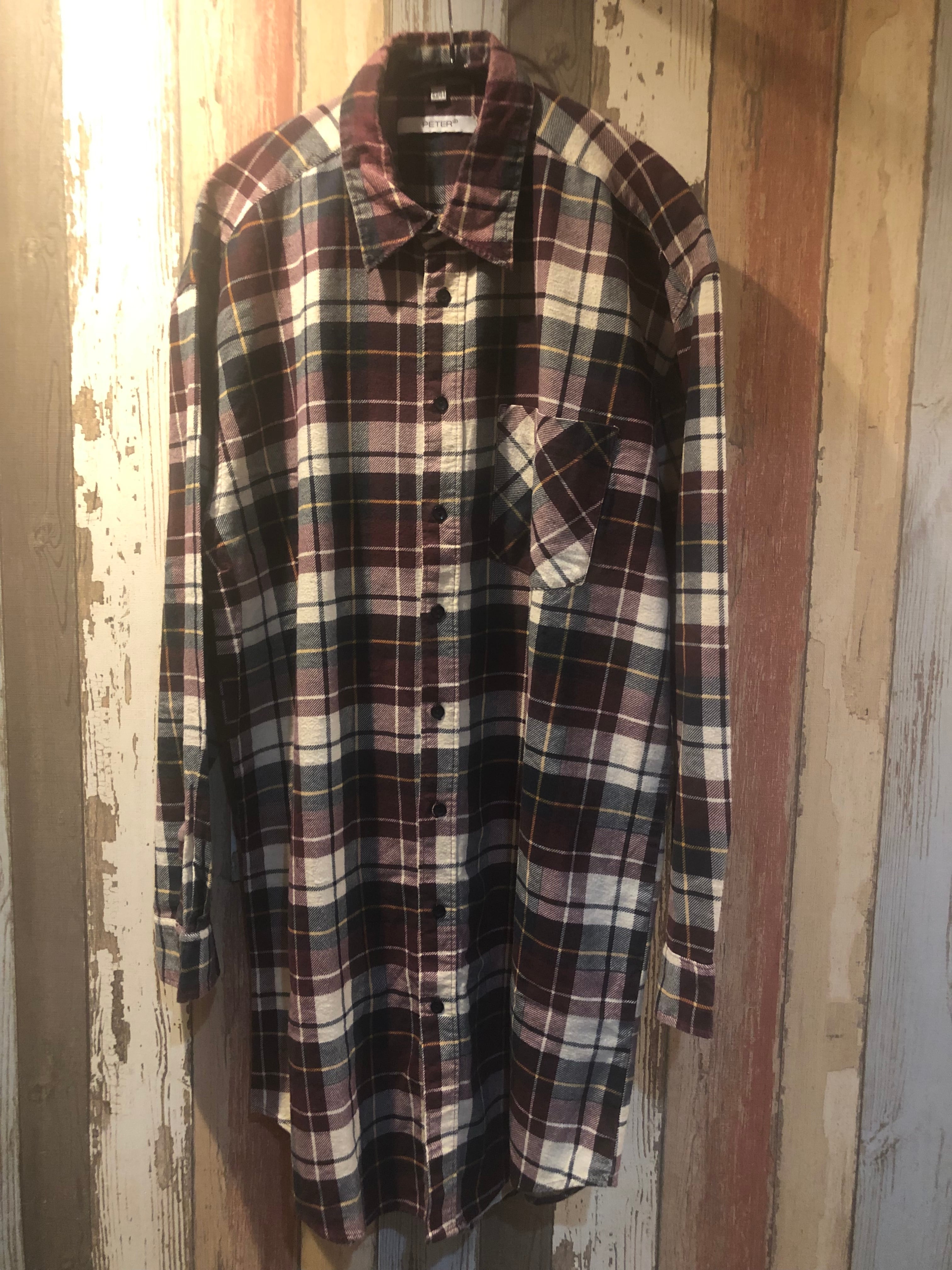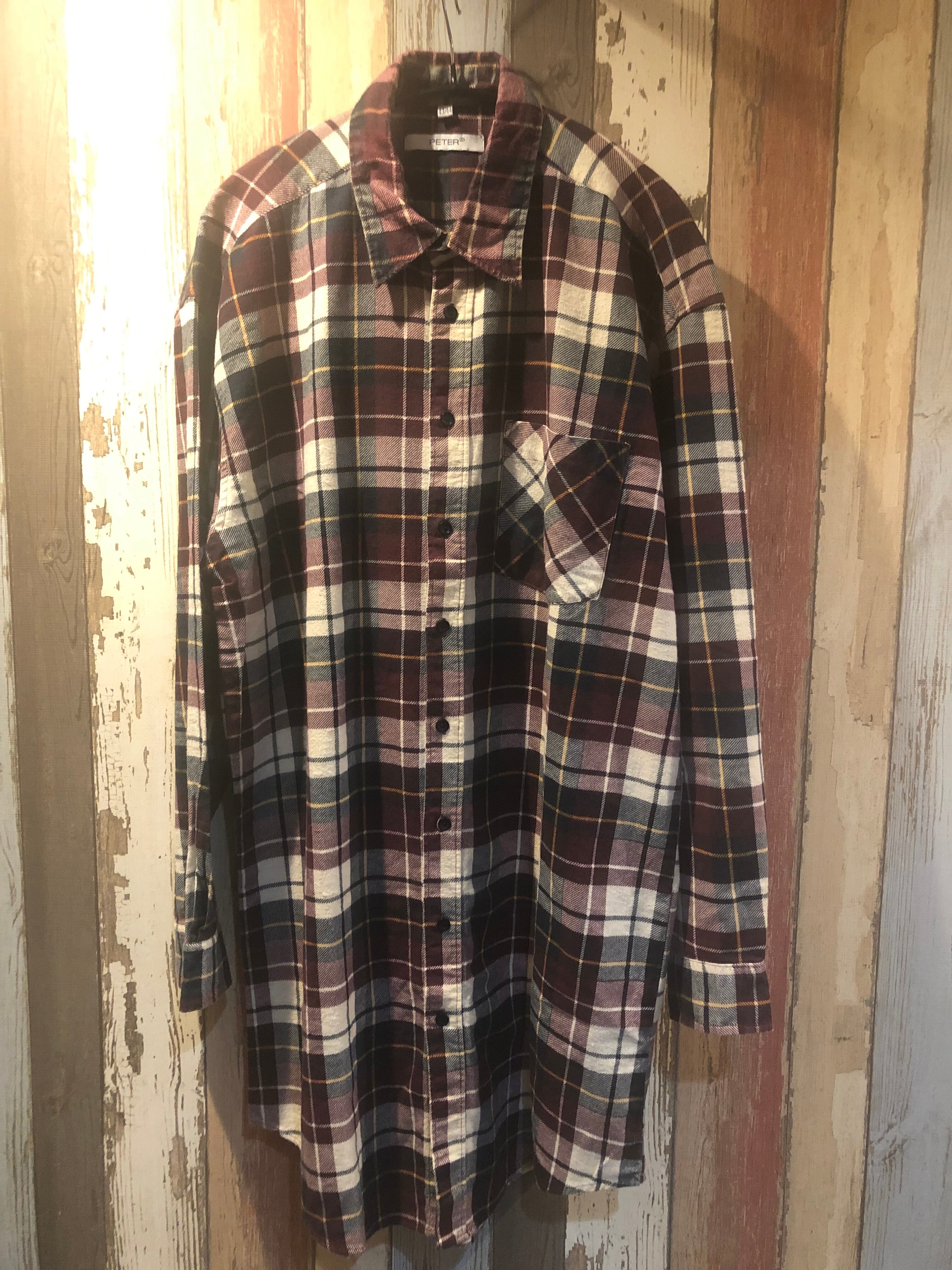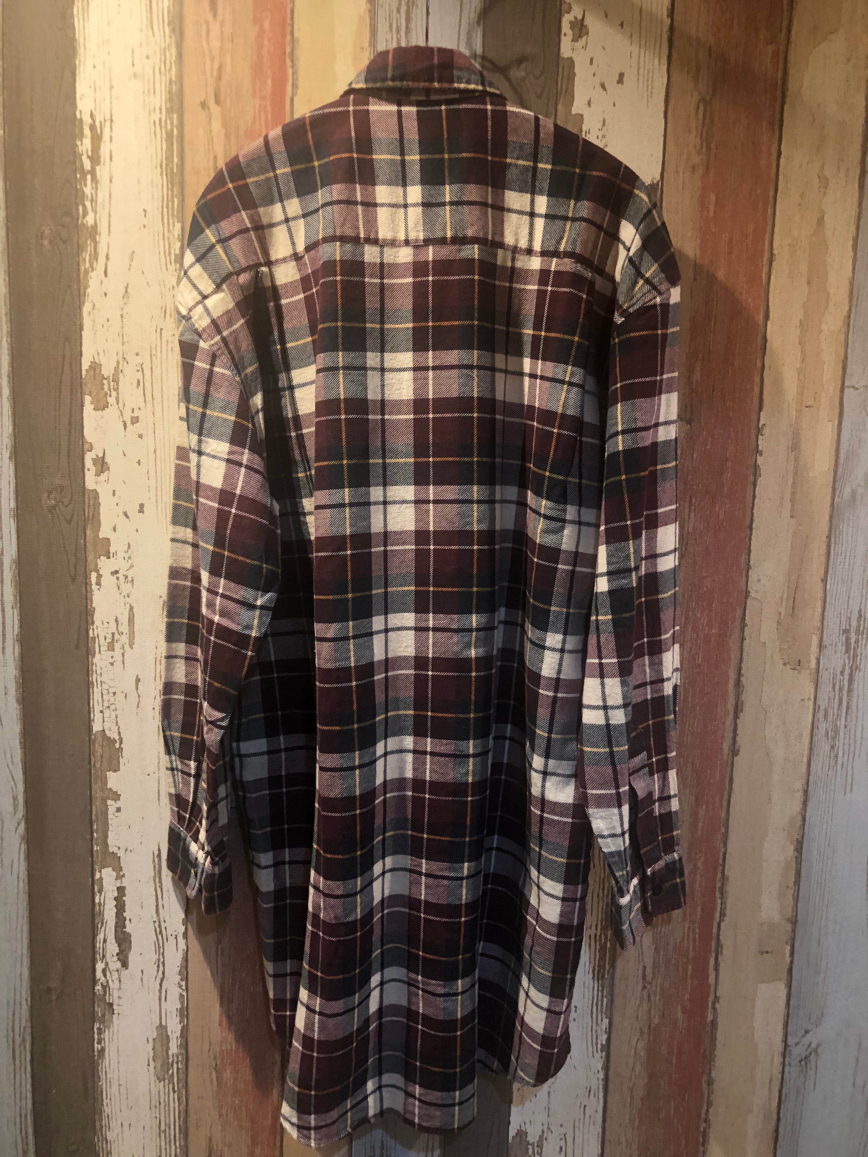 ロングタイプのチェックネルシャツです。リメイクのロングネルが多いですが、こちらはオリジナルのロングネルになります。幅広い層の方に着こなしていただけるかと思います。薄手のネルなので、1枚でも重ねても使えます。特に秋らしい色合いでおススメです。