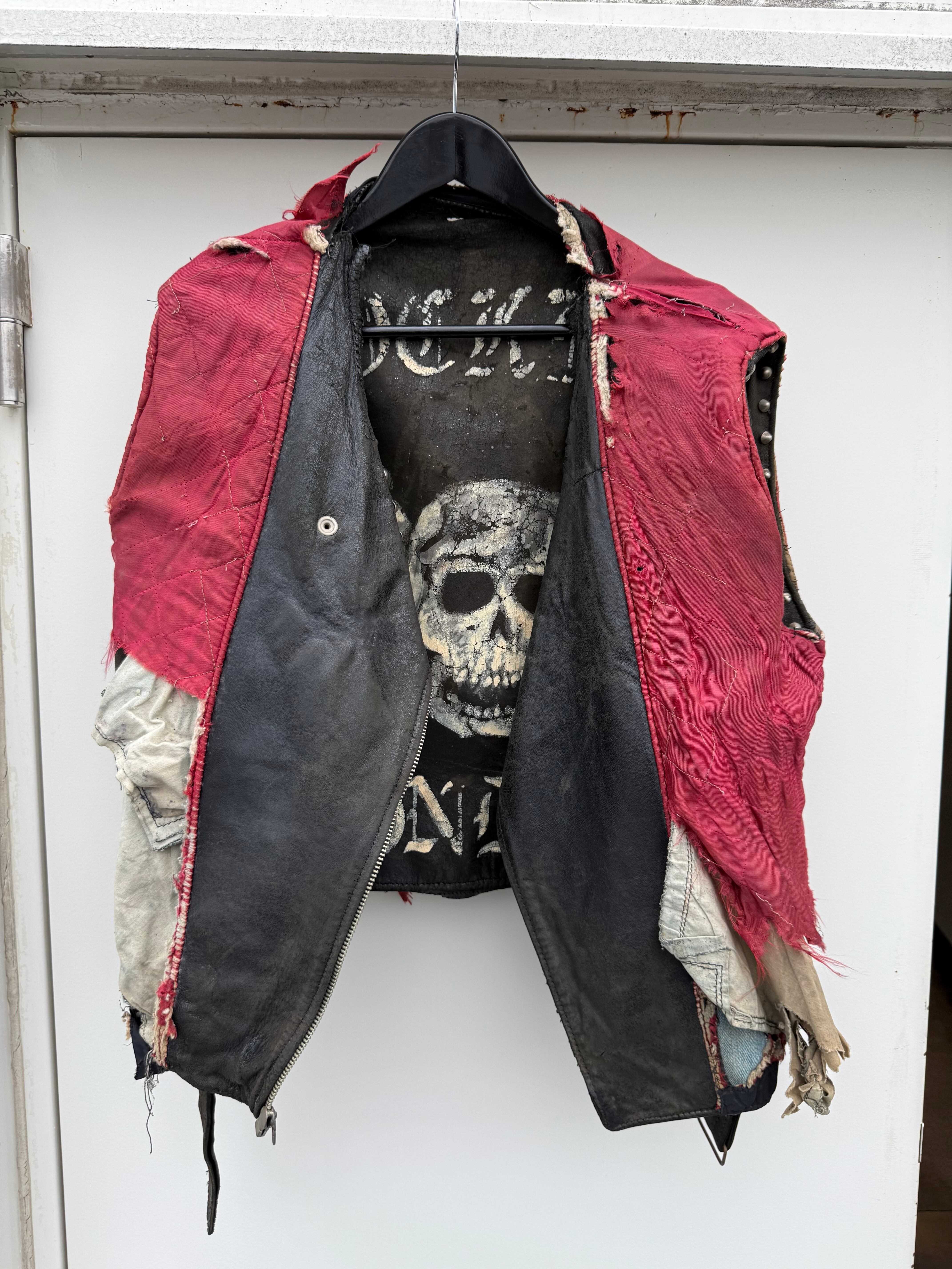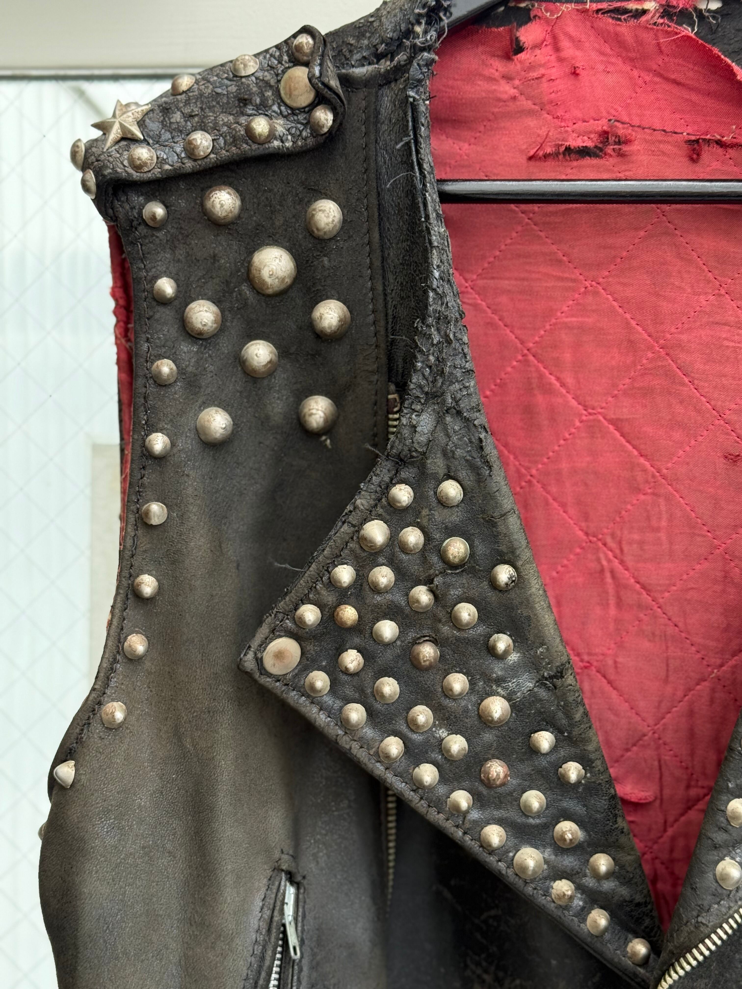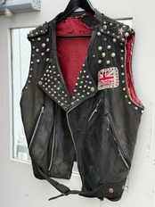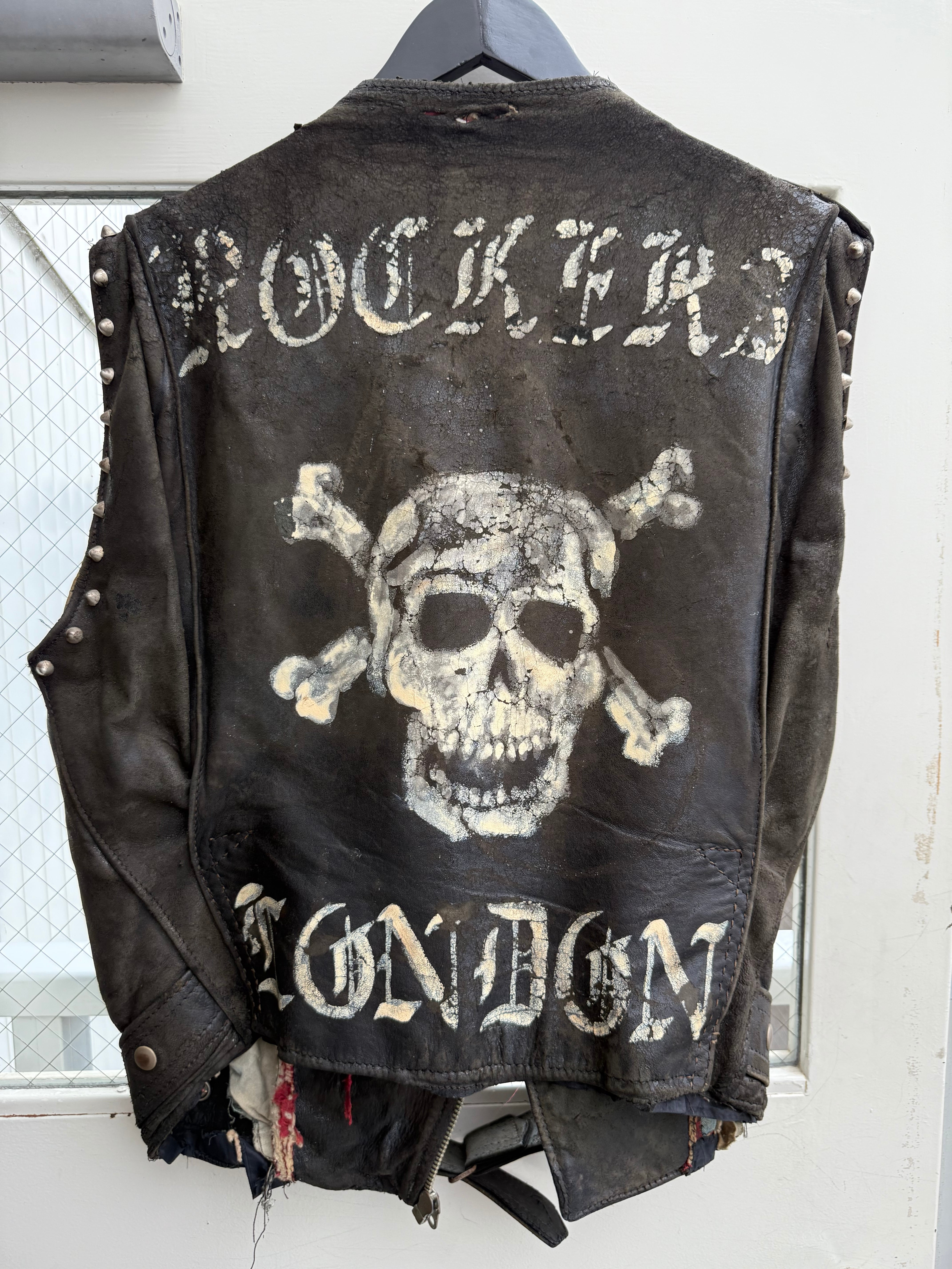ロッカーズスタイルのレザーベストです。詳しい年代は不明(おそらく60年代前後)ですが、当時のペイント・スタッズ・ワッペンが、いかついベストです。かなりボロいジャケットですが着用は可能です。あえて、手を加えておりませんので、当時の雰囲気を楽しみつつ、着用するも良し、飾って楽しむのも良いかと思います。是非、ご検討ください。
