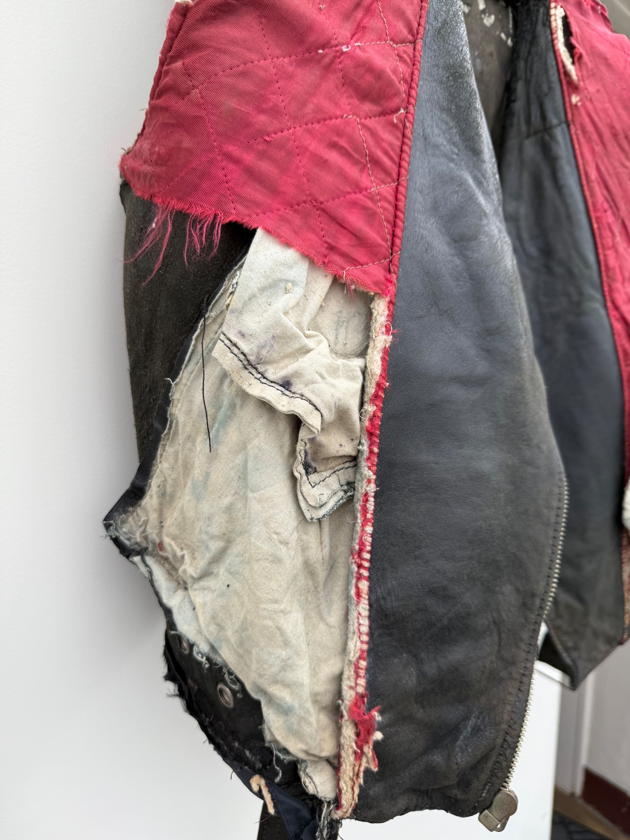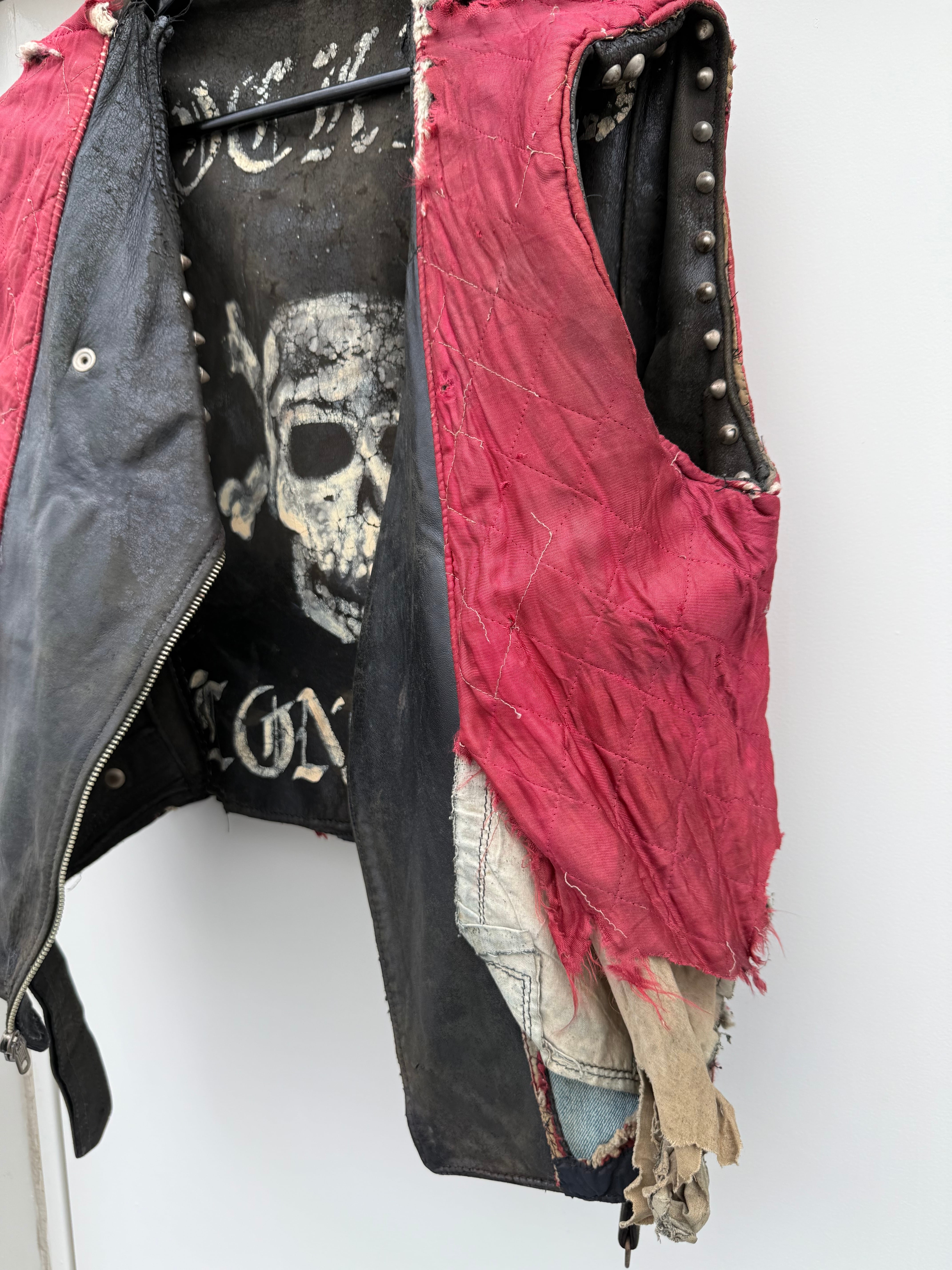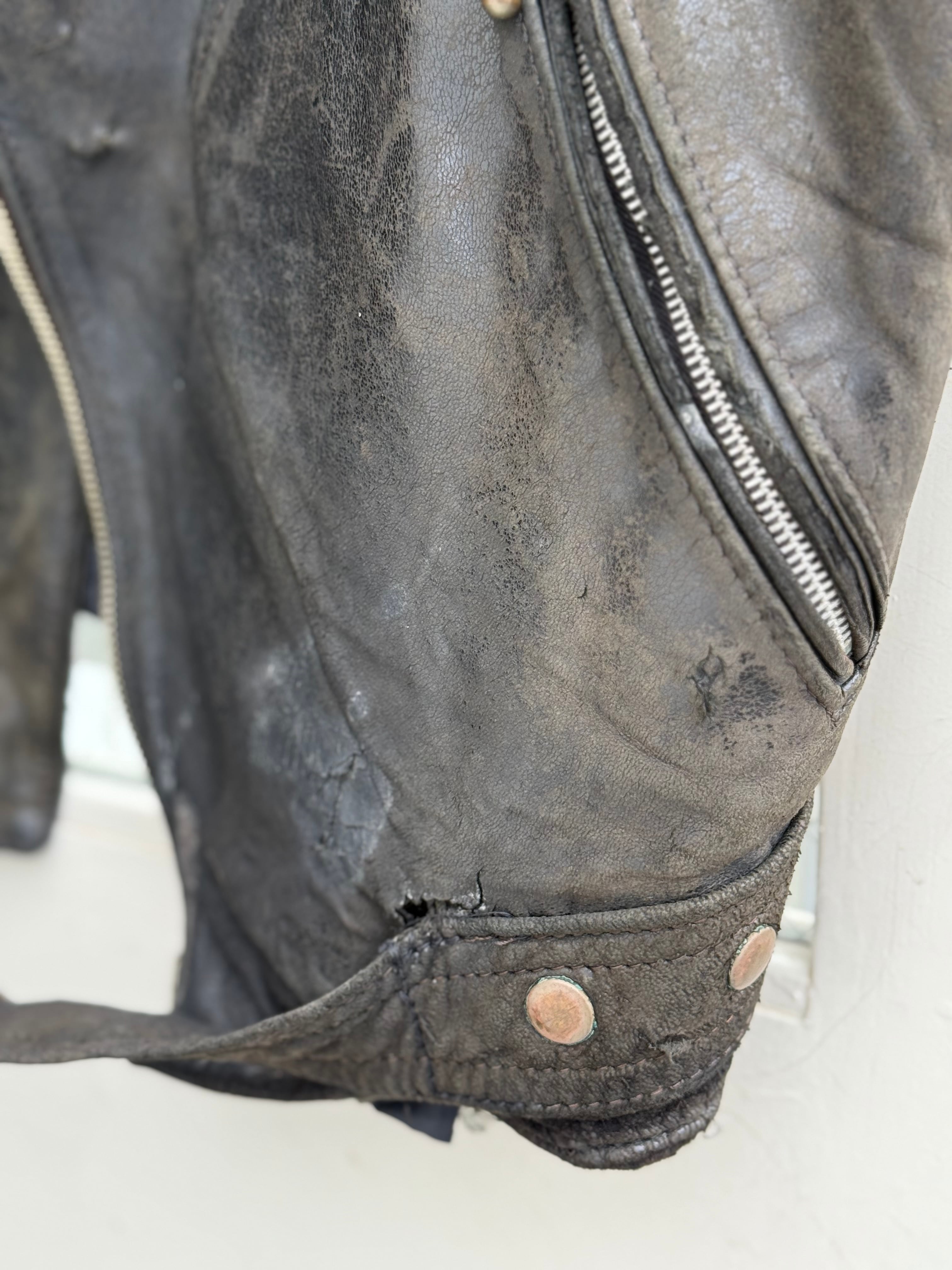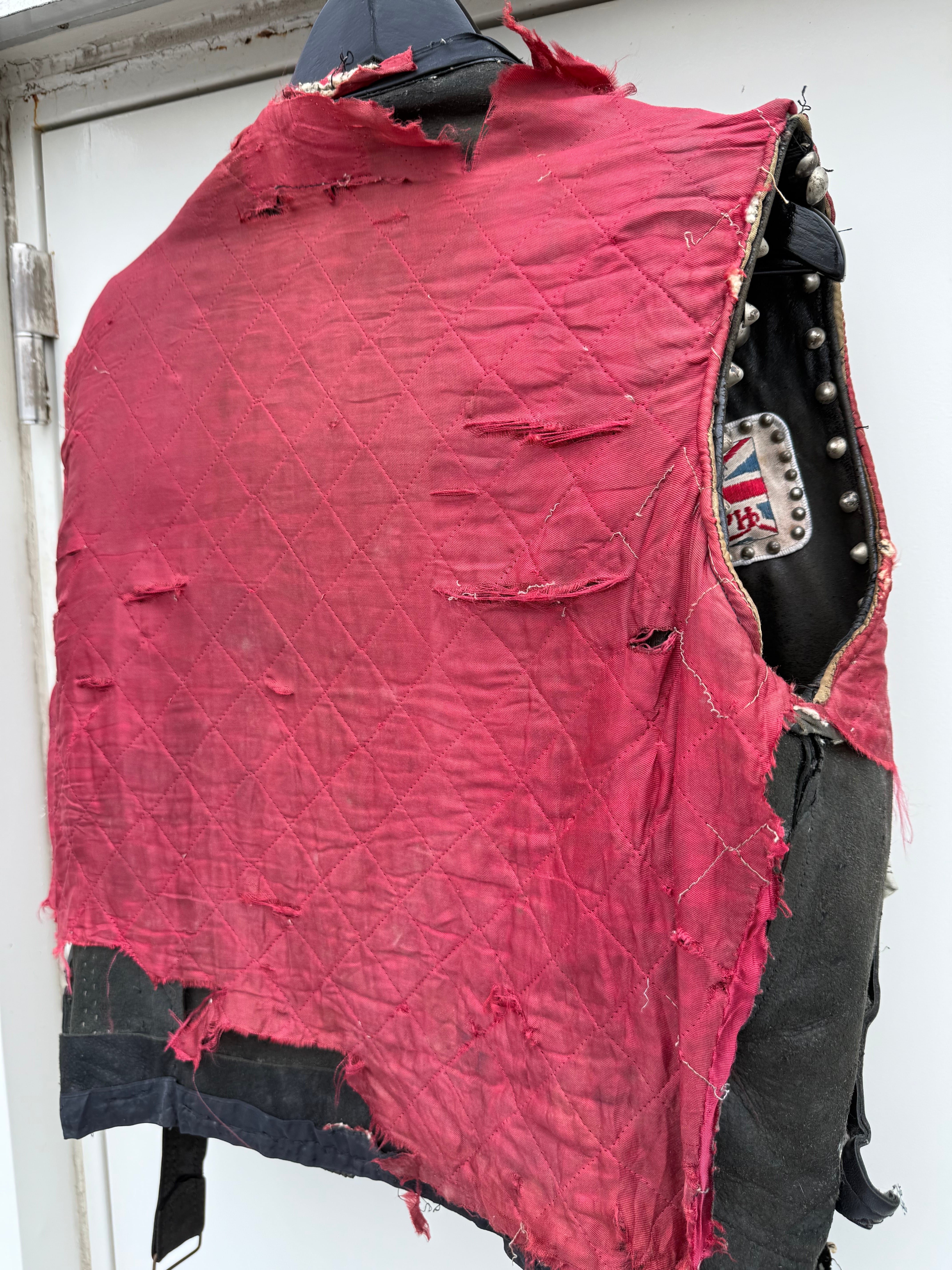 ロッカーズスタイルのレザーベストです。詳しい年代は不明(おそらく60年代前後)ですが、当時のペイント・スタッズ・ワッペンが、いかついベストです。かなりボロいジャケットですが着用は可能です。あえて、手を加えておりませんので、当時の雰囲気を楽しみつつ、着用するも良し、飾って楽しむのも良いかと思います。是非、ご検討ください。